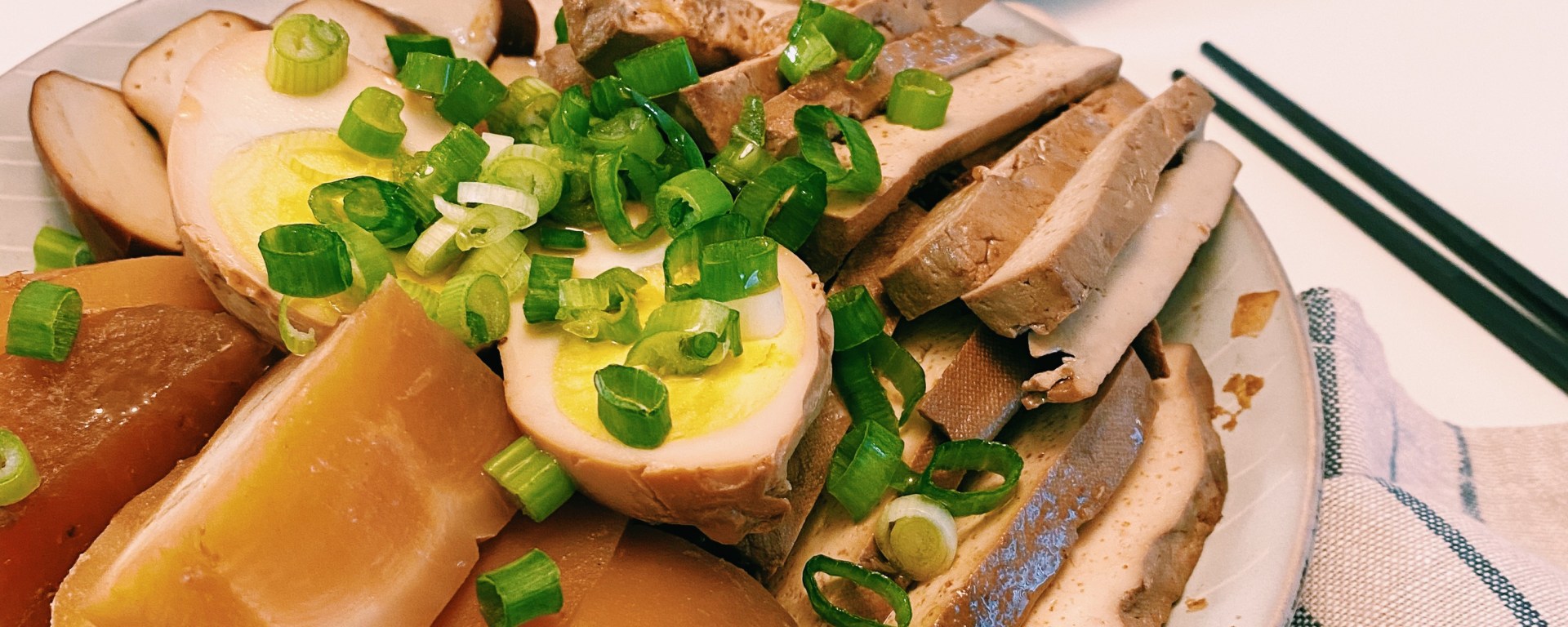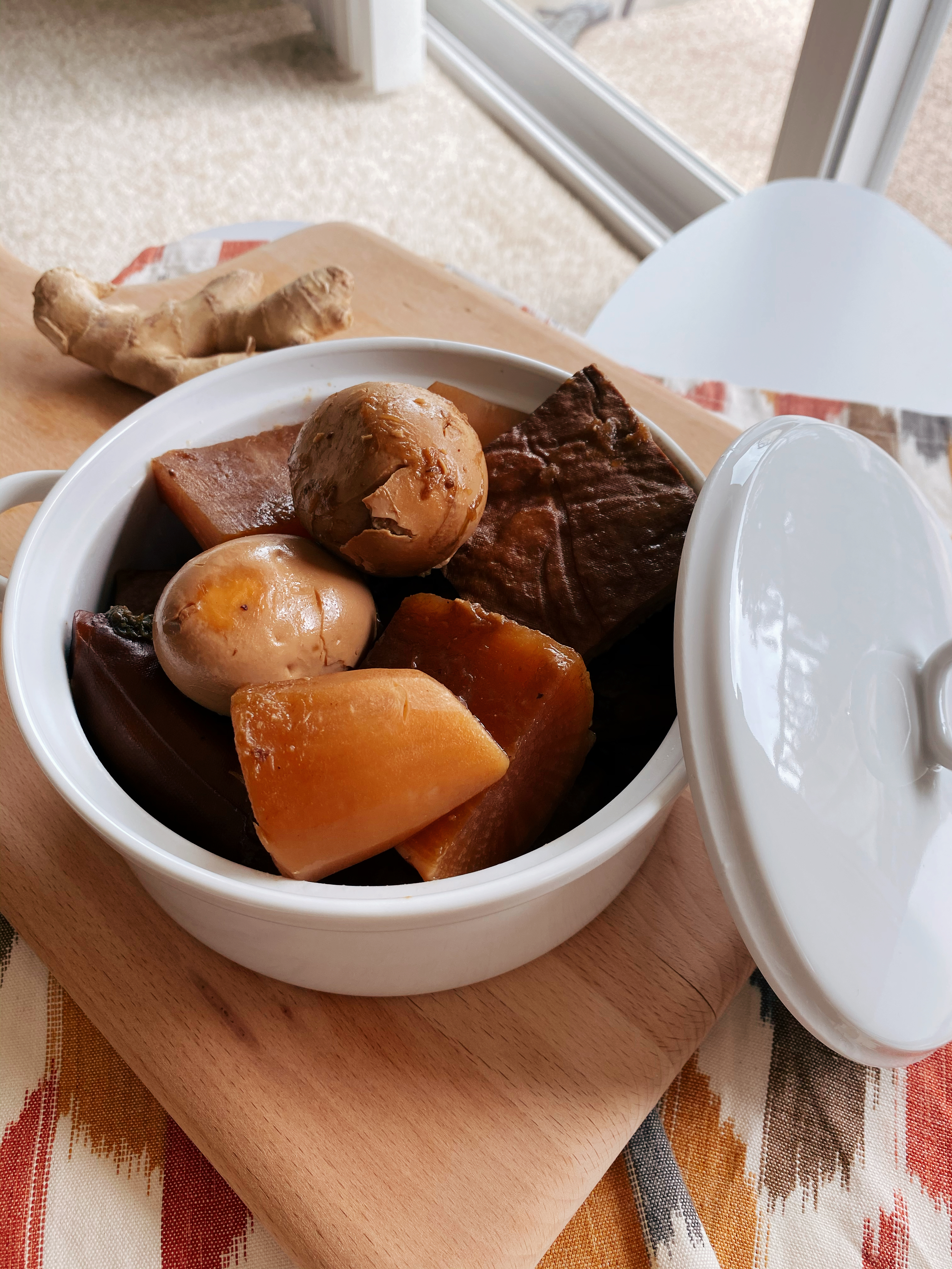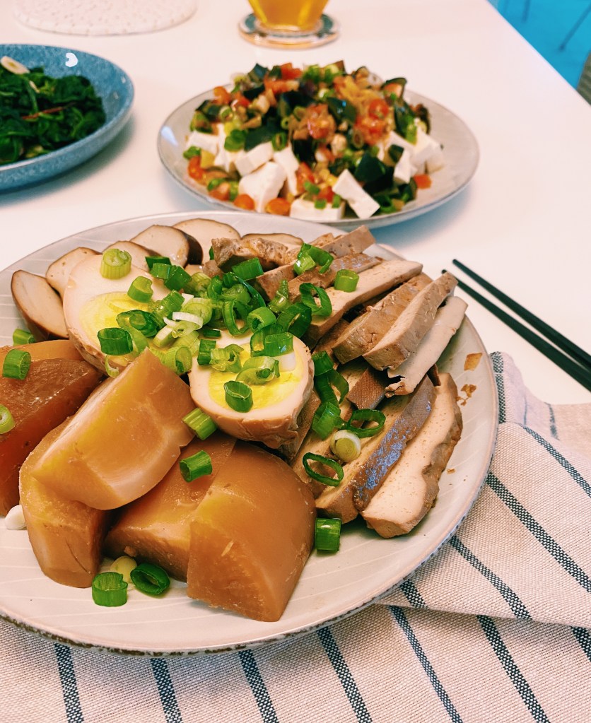 用原鍋加熱,依序把食材都丟入鍋中煮,大火滾了轉小火,煮30分鐘,悶三小時,3~4個循環,(白蘿蔔滿快入味,我有先拿出來)要吃的時候切成拼盤淋上麻油和蔥花,完成!