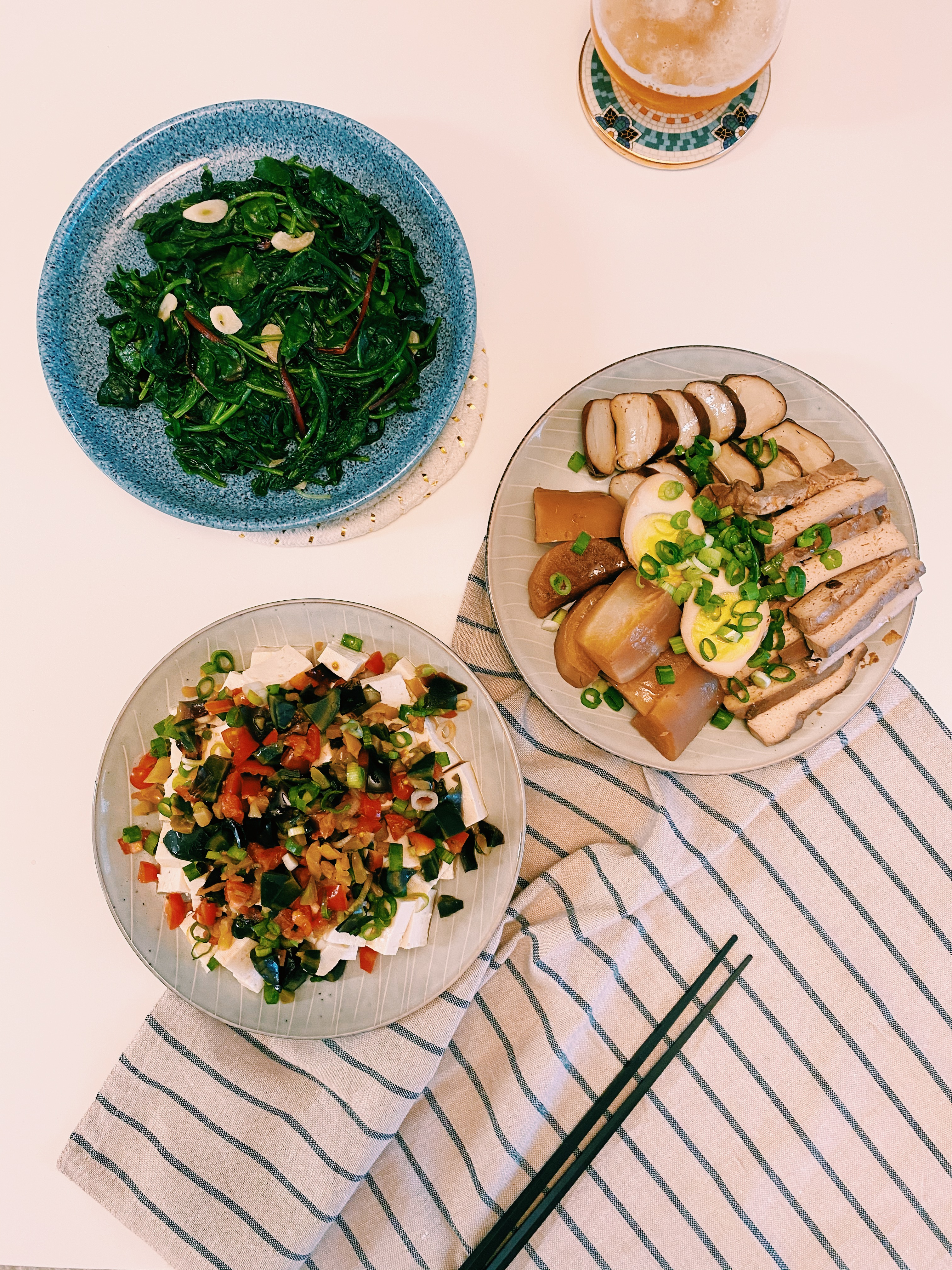☆ 後面是當晚的其他配菜,涼拌豆腐丁、番茄丁、榨菜丁、皮蛋丁+麻油和蔥花(我們家的常備小菜 ♥ )