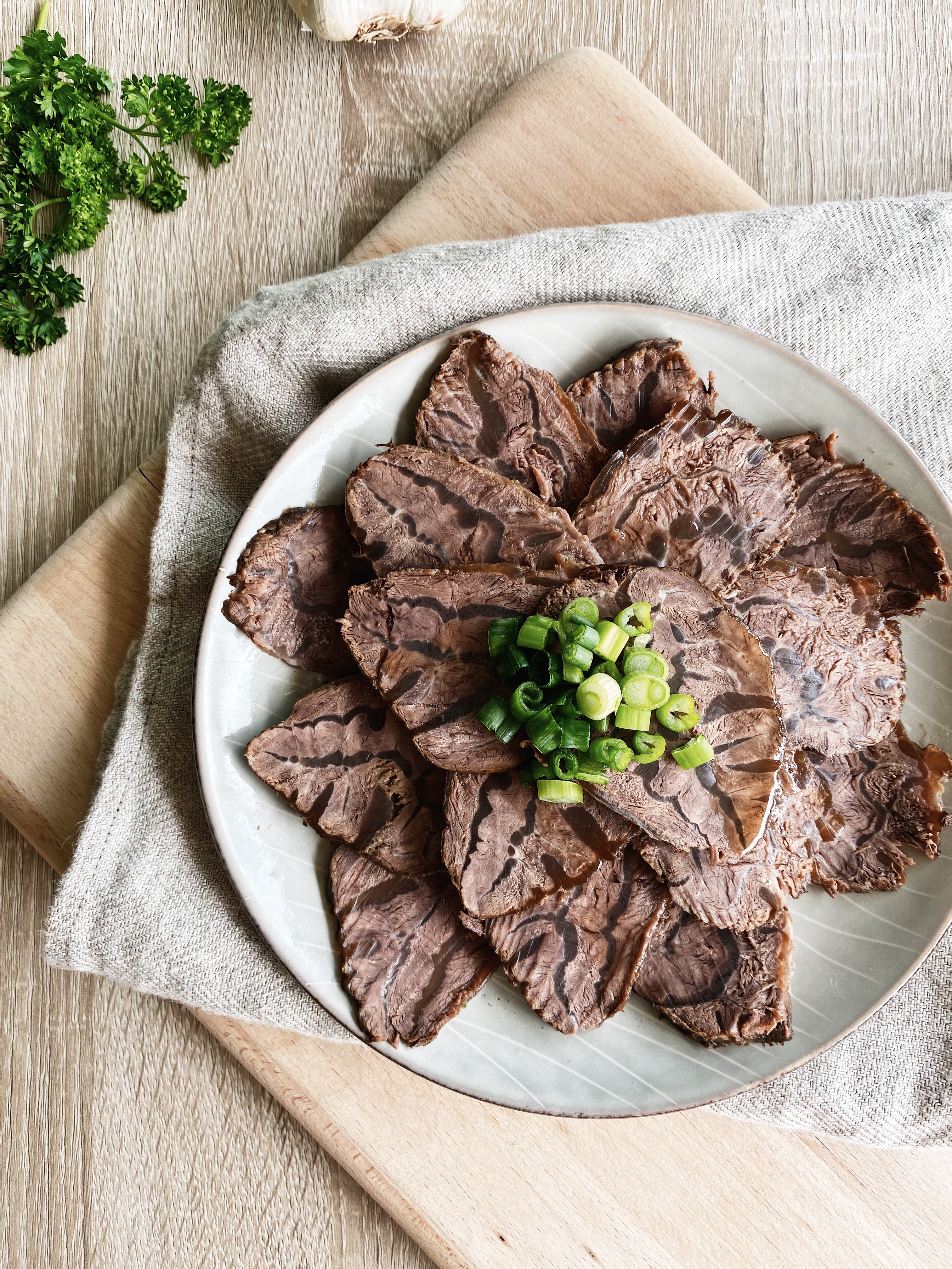 放涼後放冰箱一夜,隔日拿出牛腱切片(冷的比較好切薄哦),完成了!