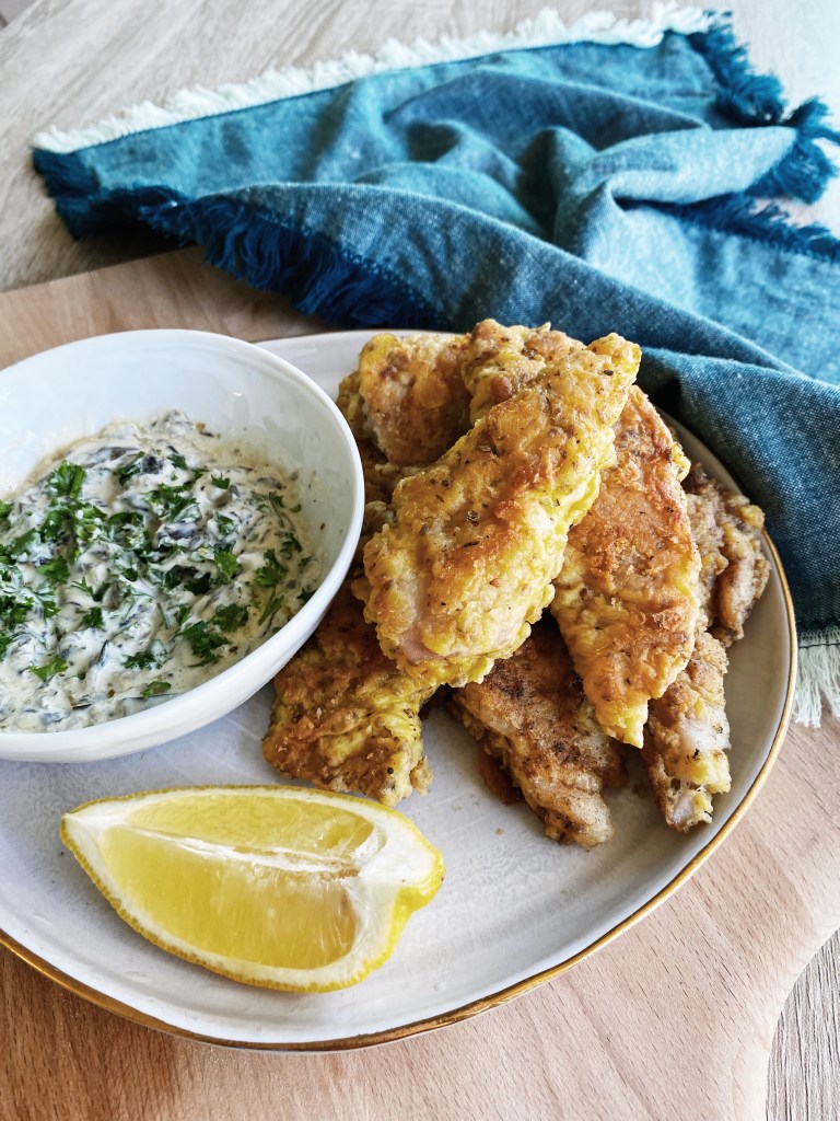 最後擺盤並切上新鮮檸檬隨時淋在魚條上,完成了!