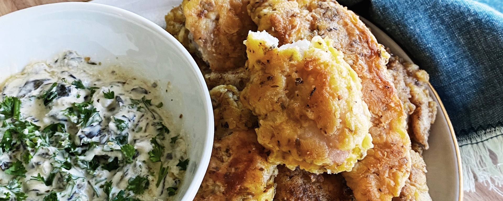 ⦿ 把去骨魚片清洗乾淨雙面灑鹽並切偏長條狀(好入口的size),裹上蛋汁→乾燥奧勒岡葉和麵粉→蛋汁→ 乾燥奧勒岡葉和麵粉,下油鍋煎到表面金黃取出(我用煎的不是用炸的)。
