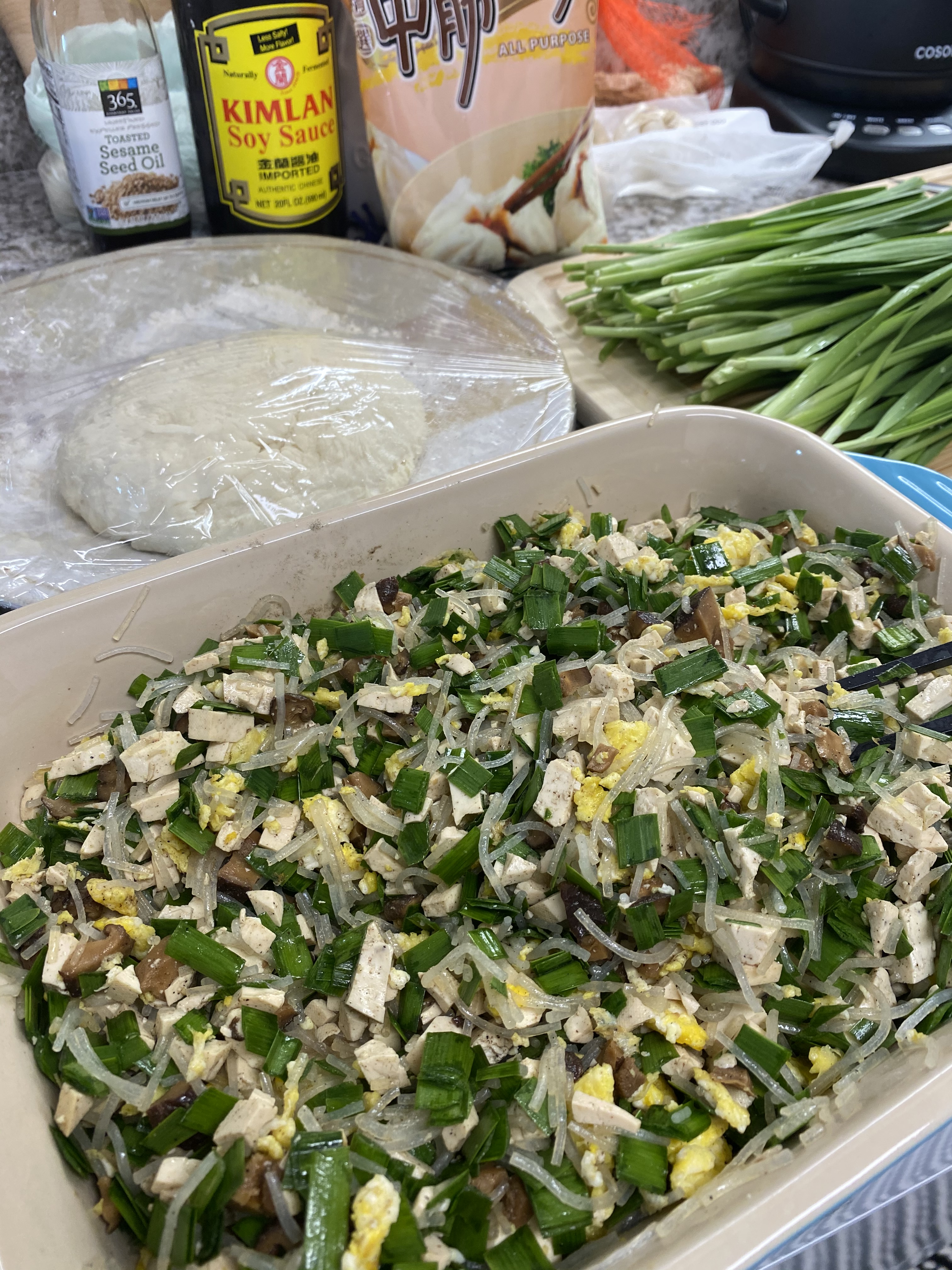 本來買了韭菜是想做花素蒸餃的,但我們沒有買蒸籠也沒有電鍋,索性就選擇做韭菜盒子直接用鍋子煎,做起來不會難,一樣是備料的部分比較麻煩,最後的成果真的滿像外面賣的!