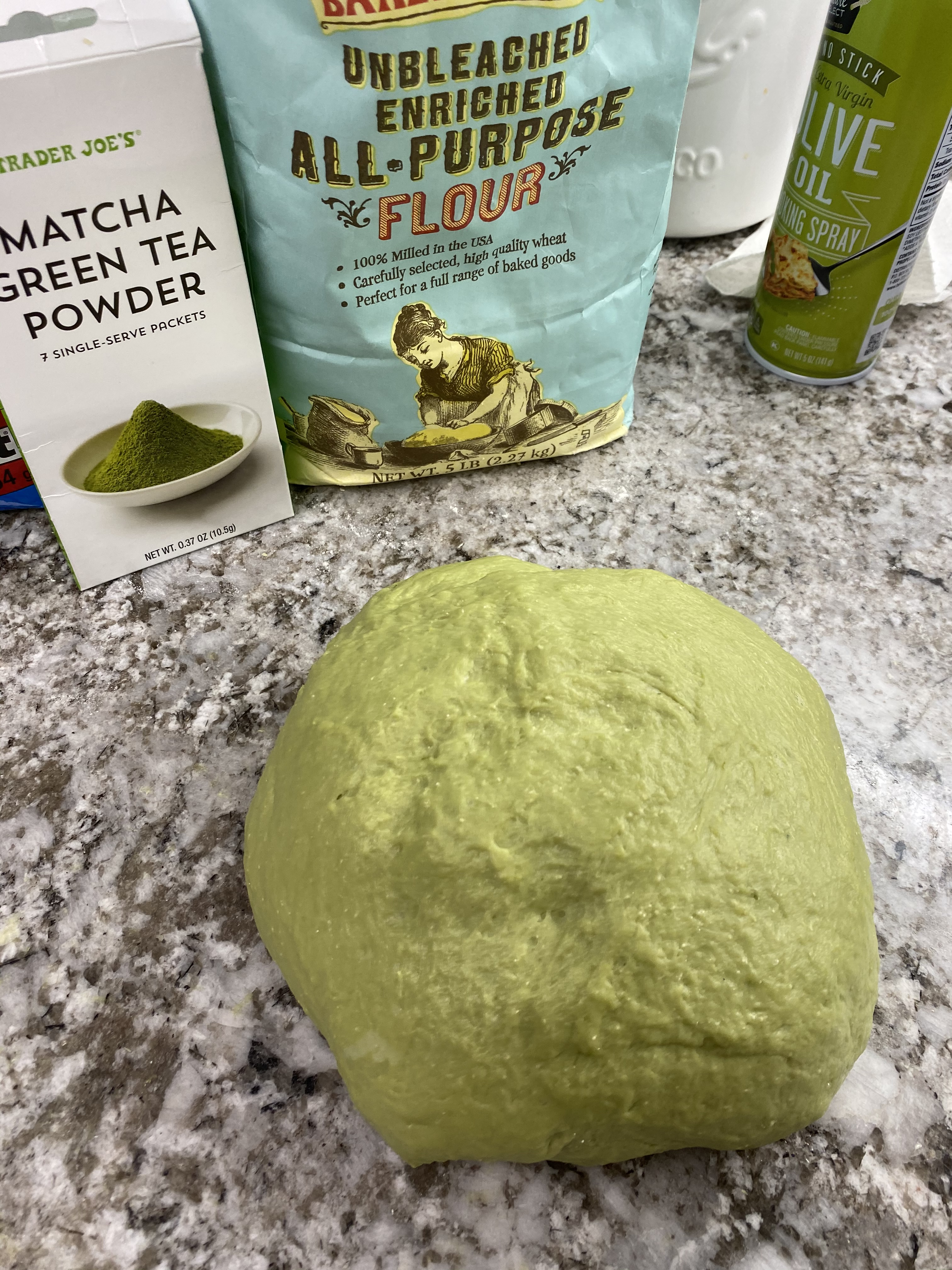 在all purpose flour中加入少許鹽、糖、抹茶粉(喜歡甜一些味道濃郁些可以多點一點)、酵母粉拌勻,再加入兩顆雞蛋、牛奶(適量讓麵粉和勻),開始揉麵10分鐘,慢慢加入奶油後繼續揉10~15分鐘,放室溫發酵1小時左右等麵團發到2倍大。