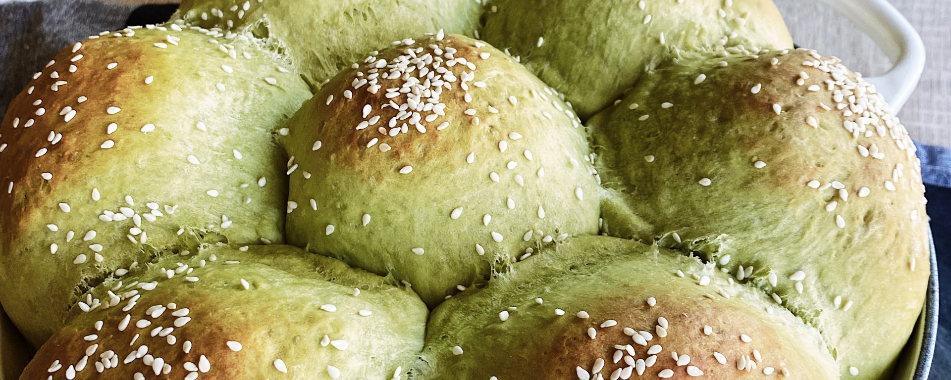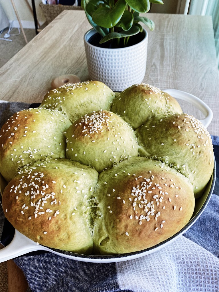 發酵好拿出來稍微揉一下並排氣,揉成7個光滑的小圓,收口朝下,放到抹過奶油的鑄鐵鍋中,再發酵10~15分鐘,並撒上白芝麻。