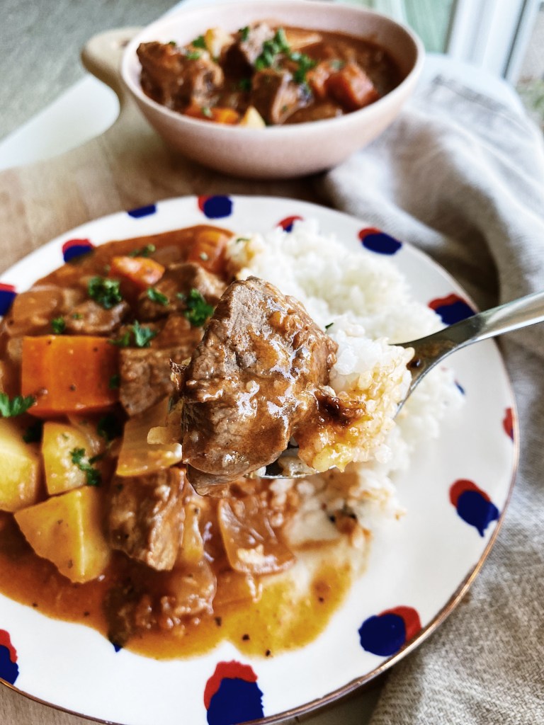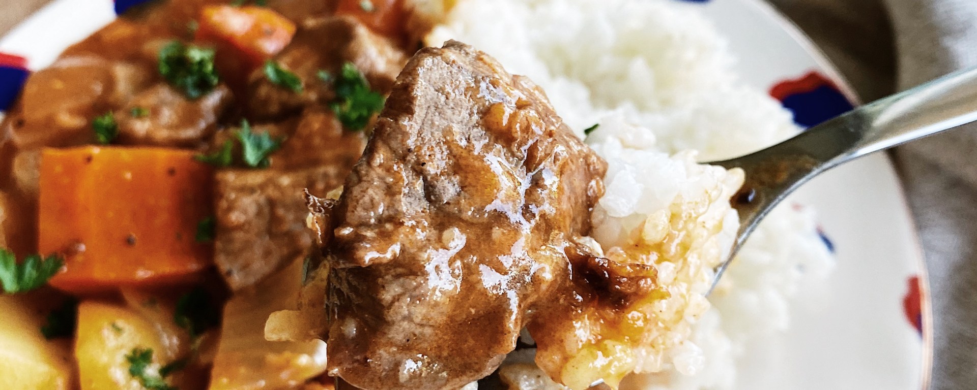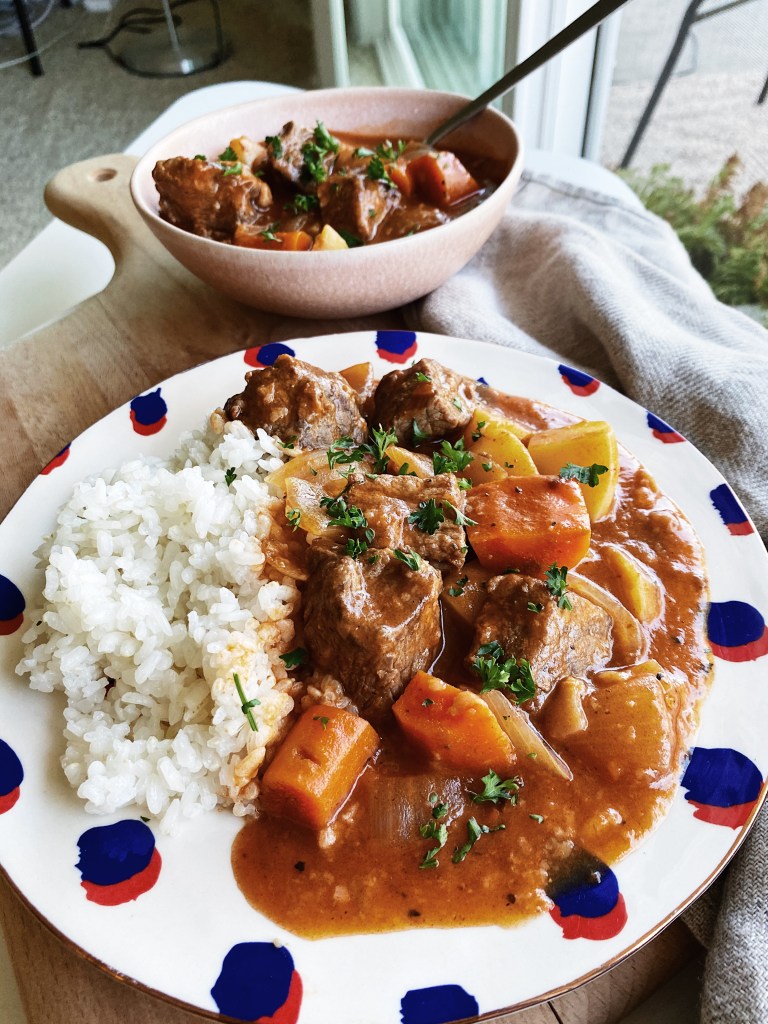Beef stew裹上麵粉和少許鹽放入鍋中煎至表面熟取出,用原鍋炒洋蔥,加入兩大匙番茄糊拌炒均勻、再加入少許麵粉、再倒入米酒(有紅酒更好),把牛肉放回鍋中一起炒再加入牛骨高湯蓋過所有料,放入月桂葉一片,加入鹽、胡椒調味,放入紅蘿蔔塊、馬鈴薯塊一起蓋上鍋蓋煮25分鐘。