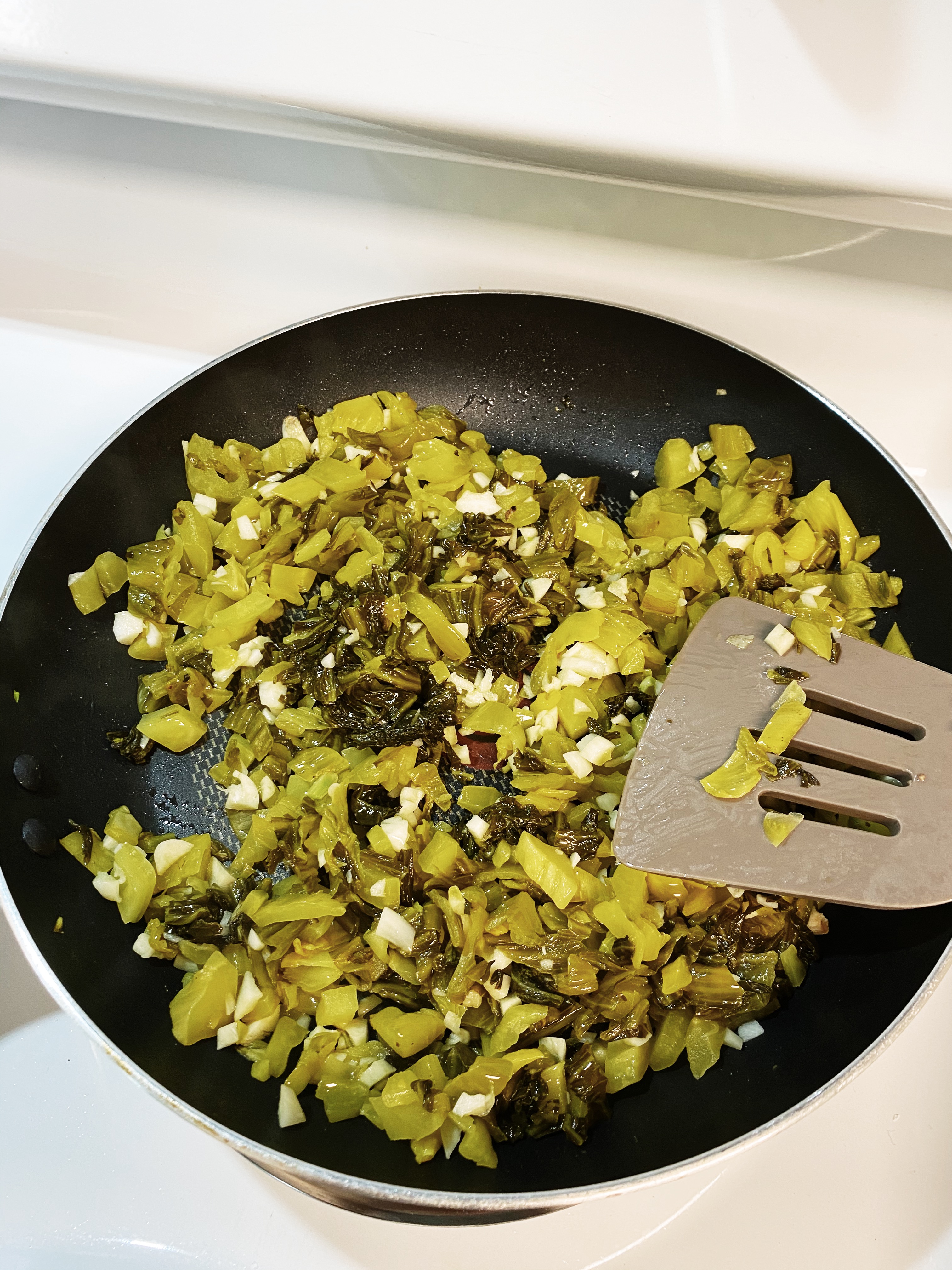 超市買來的酸菜一片一片撥下來用水仔細沖洗乾淨,稍擰乾厚切成丁丁,大量的蒜頭也切成蒜末,熱鍋加油炒酸菜丁,炒香後加入蒜末繼續炒、加麻油、砂糖(炒酸菜可多一點點油)