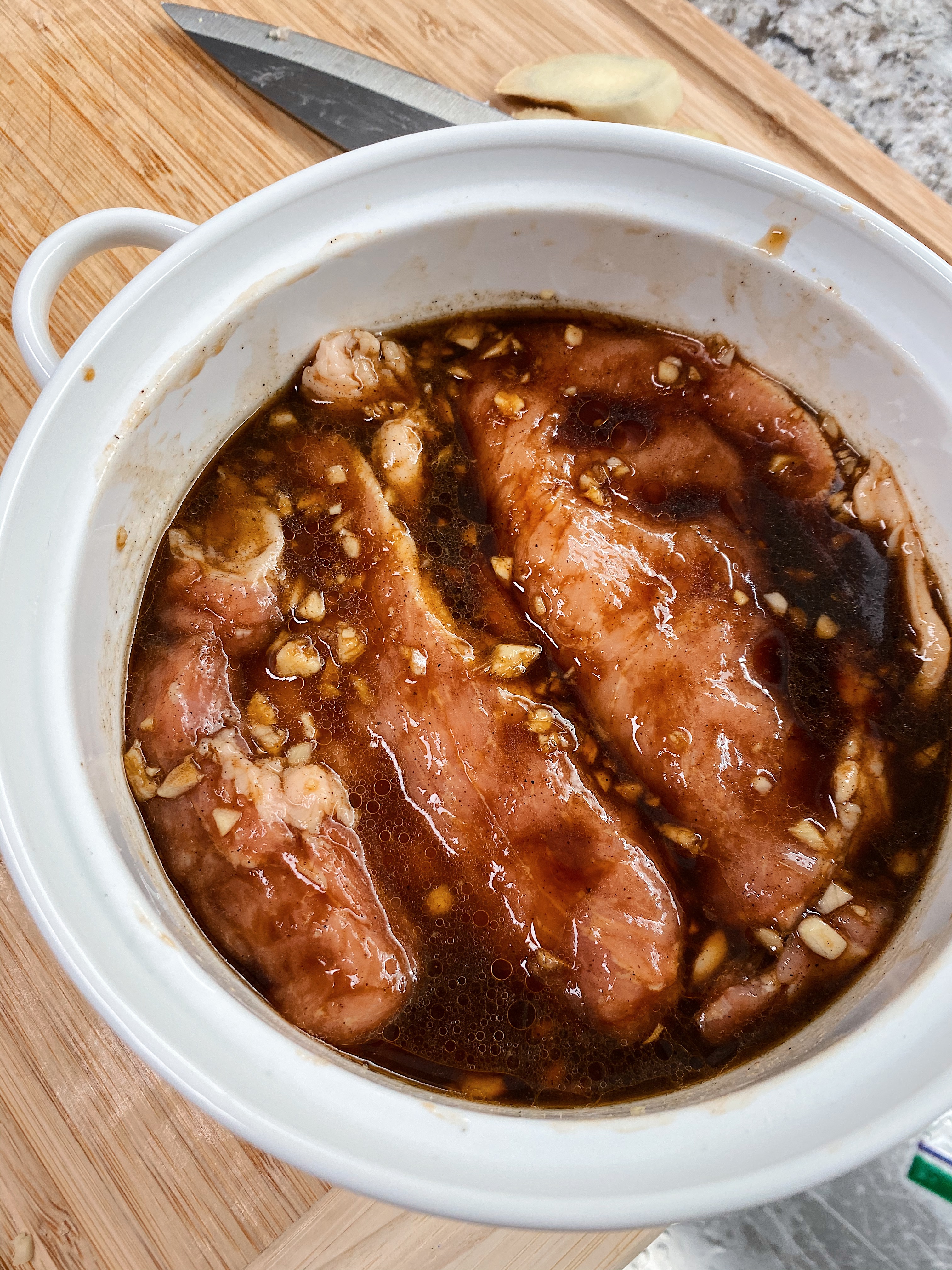 里肌肉用錘子敲打至一半厚(我沒有專業肉槌,就用塑膠袋套住小型榔頭🔨來敲)用薑泥、蒜泥、醬油、米酒、砂糖、麻油、白胡椒按摩抓醃放冰箱一整晚(我喜歡蒜味重所以蒜泥可多加,看自己喜好)。