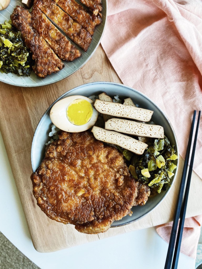 ➔ 在大碗中盛飯,依序放入炸排骨、切片豆乾、對切的滷蛋、一坨炒酸菜,🚞鐵路排骨便當完成了!!