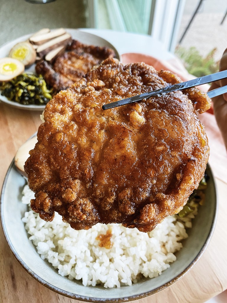 先生當天本來說不餓,但在我盛好一碗拍照後留給他(通常都是這樣,拍完照後給他吃)他強烈建議我可以拿來賣,咬下去排骨肉是滿滿的古早味香,配上煎過脆脆的口感(上圖),夠入味又不油膩,一口排骨肉一口自己炒的酸菜,自己做出古早味料理一點都不難!