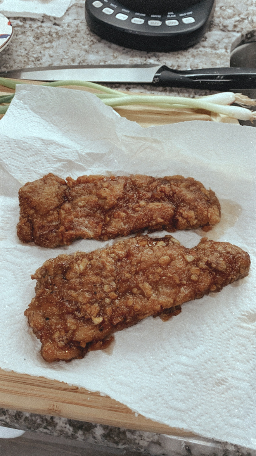 醃過一晚的里肌肉片取出,雙面都均勻抹上混了白胡椒和鹽的太白粉,用熱鍋煎(注意火候,煎到金黃最漂亮,速度滿快的)
