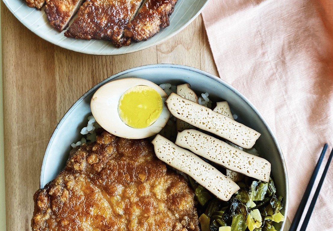 ➔ 在大碗中盛飯,依序放入炸排骨、切片豆乾、對切的滷蛋、一坨炒酸菜,🚞鐵路排骨便當完成了!!