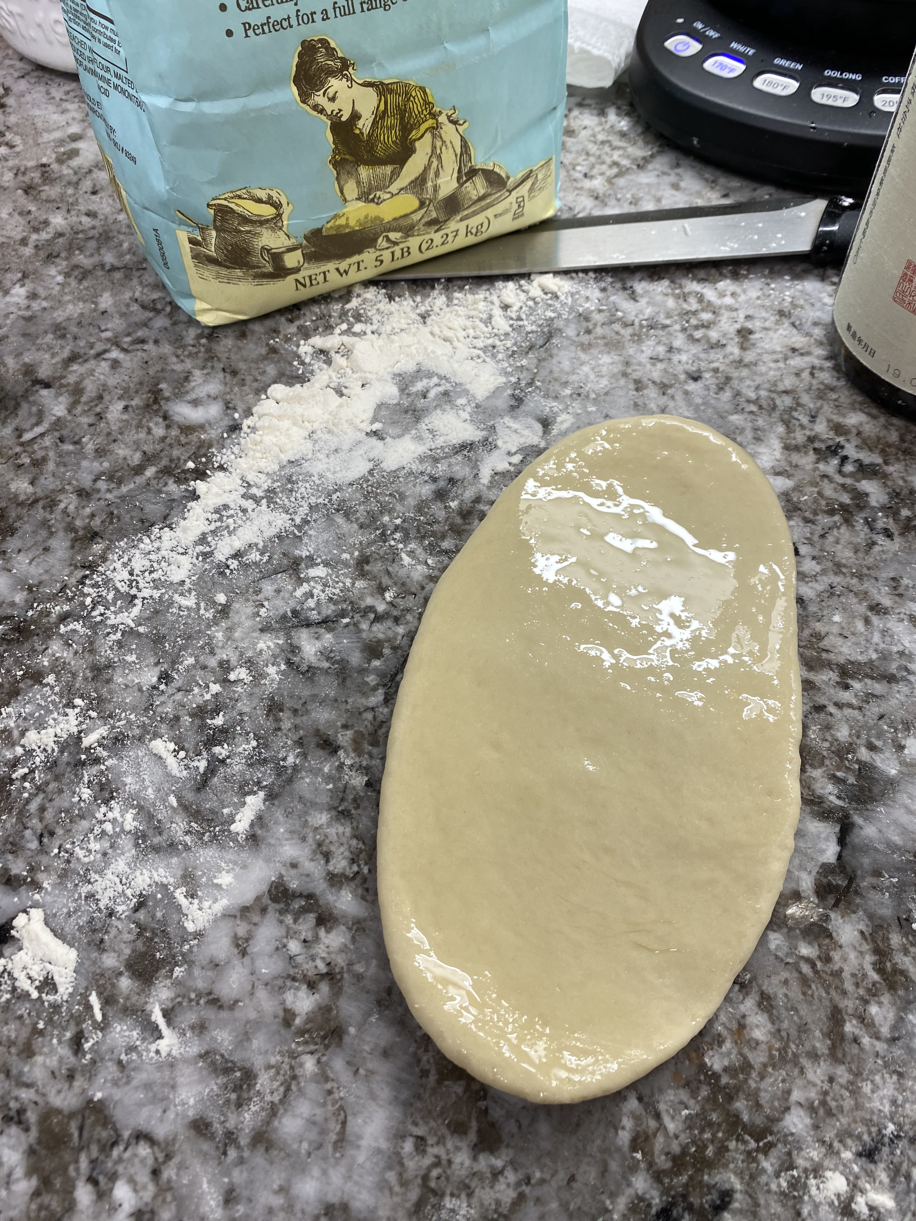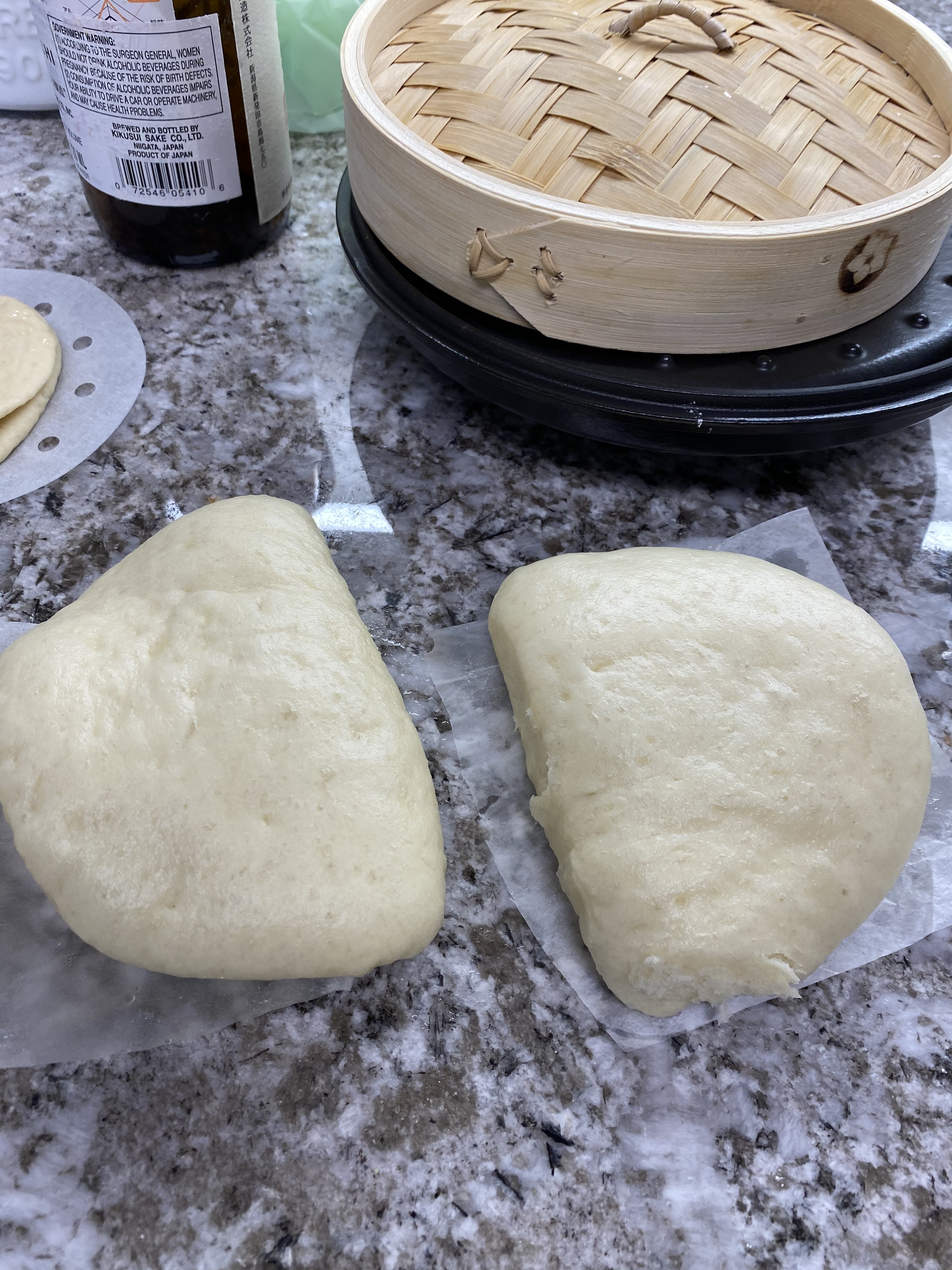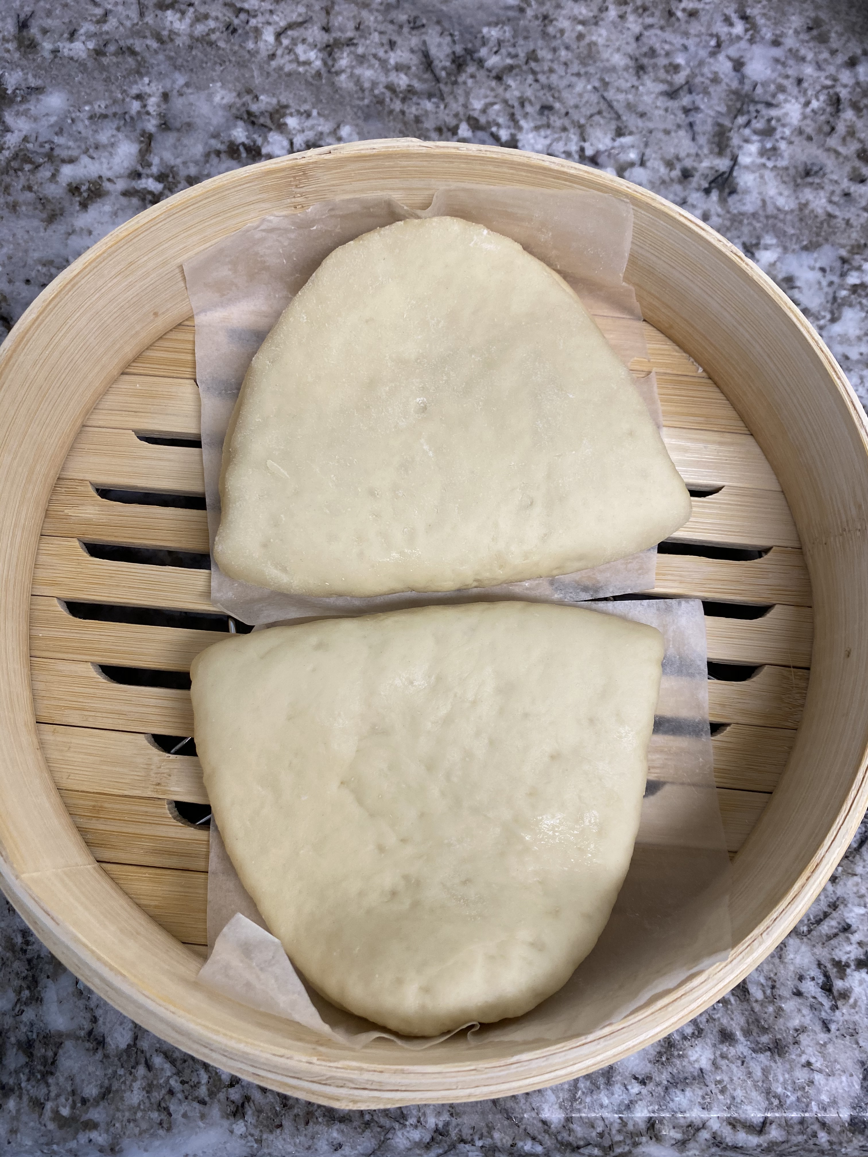 在all purpose flour(20cm鑄鐵鍋裝1/3)中加入酵母粉2匙、水、砂糖3匙、橄欖油2匙,攪拌均勻並揉至光滑,分成6等份左右,每一個麵團都滾成光滑的圓,把蒸籠紙剪成適當大小6張,把小麵團滾成長條狀單面抹一點油並摺疊起來,放入蒸籠讓它發酵至2倍大,開火中火蒸15分鐘,完成。(用電鍋蒸也可以)