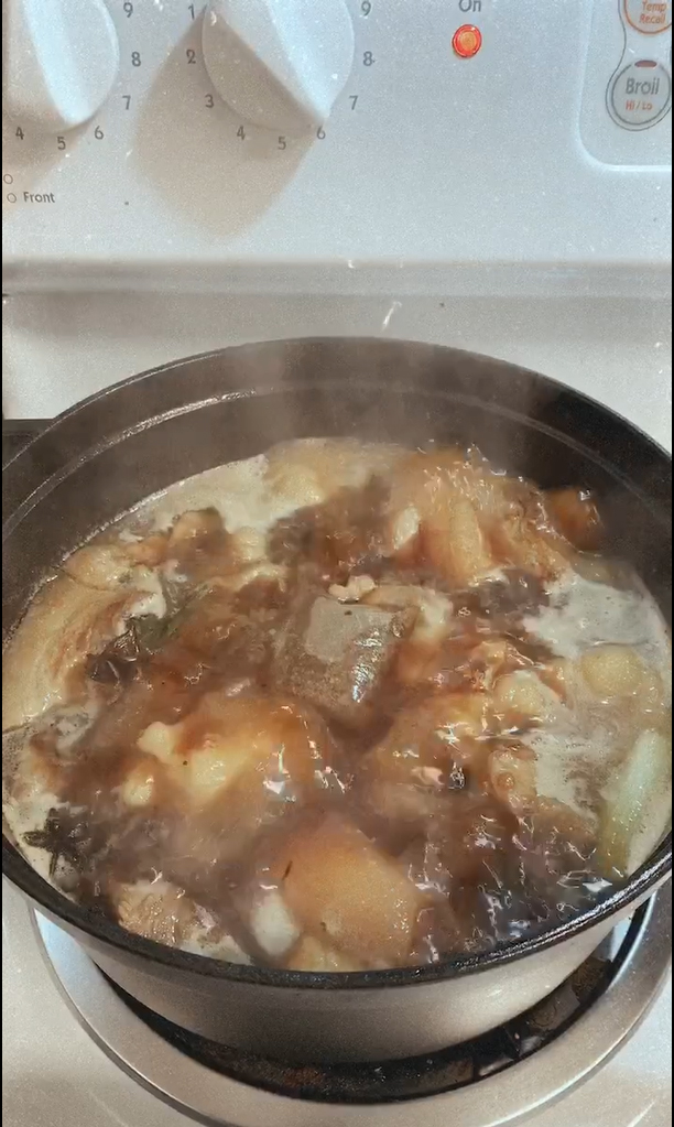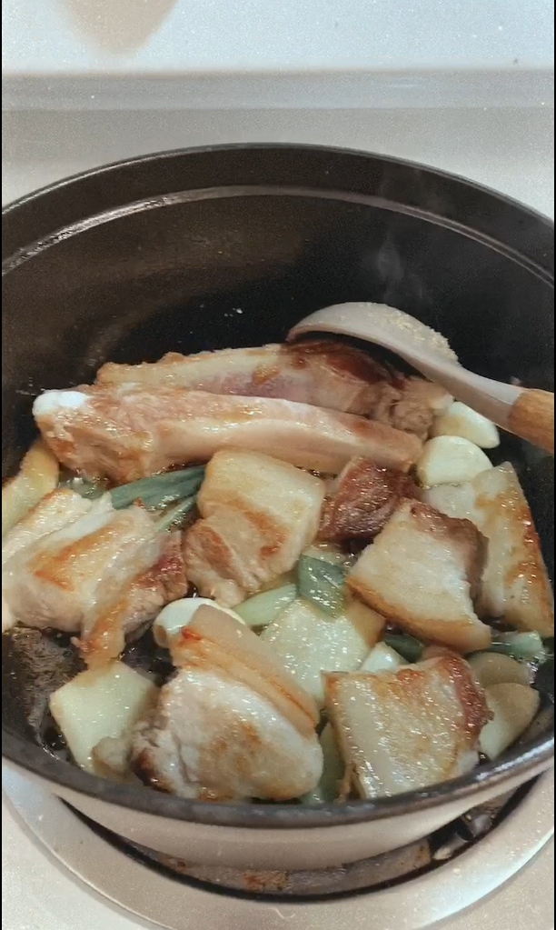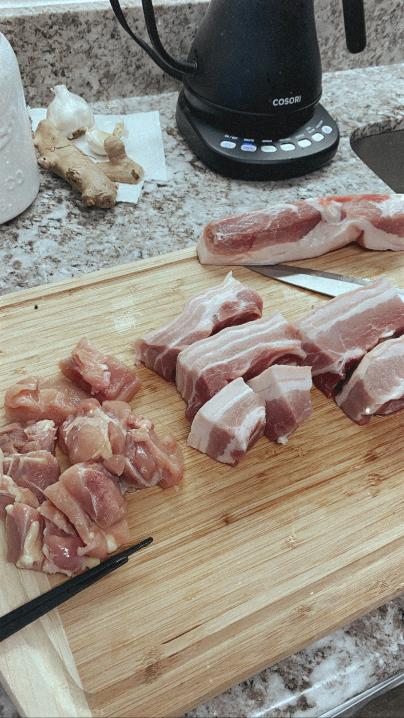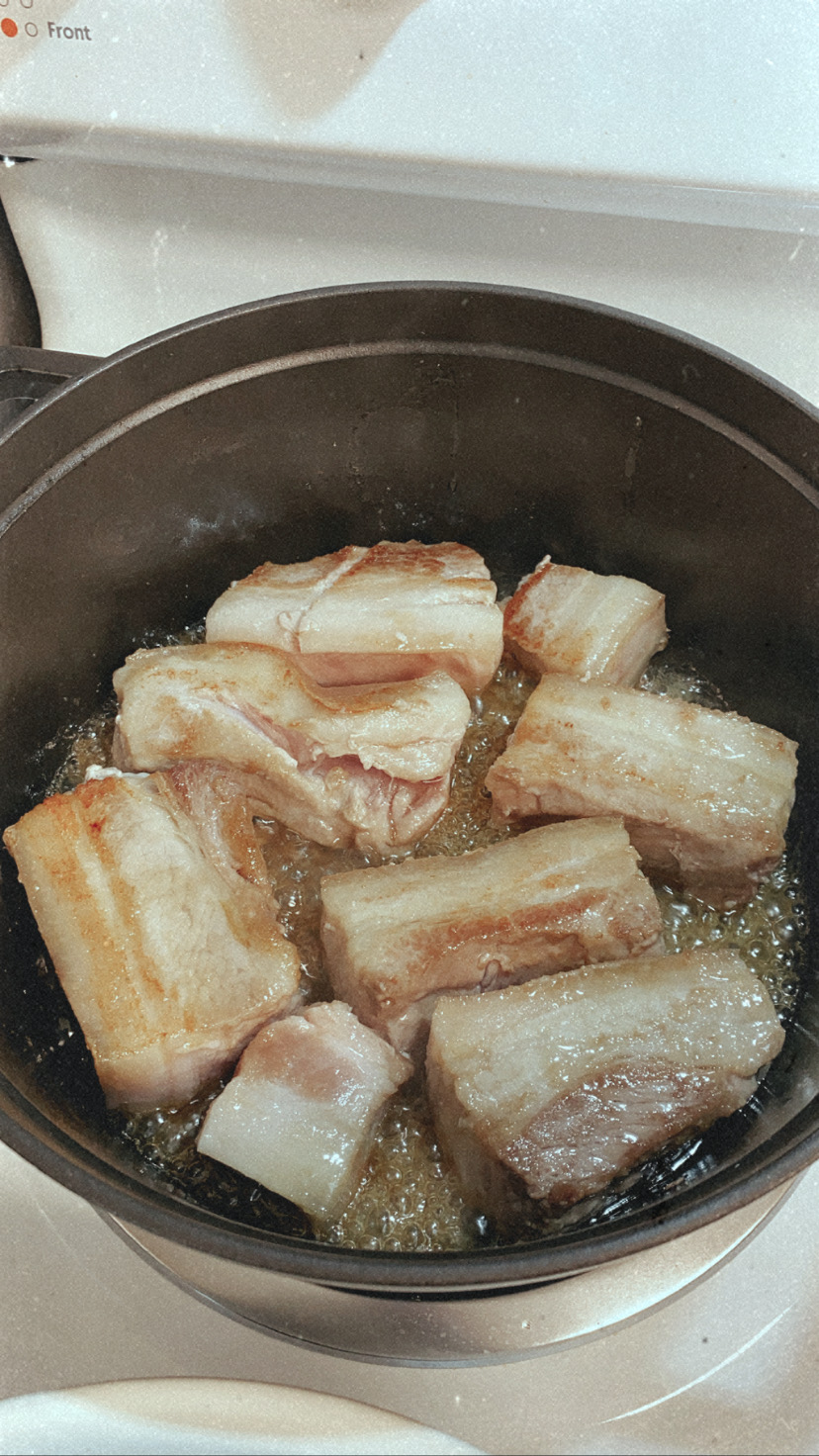 把五花肉切成4~5cm左右等塊(下圖步驟)加油下鍋煎至表皮微焦並放入砂糖一起拌炒上色,再放入蒜頭、薑片、八角、蔥段一起炒香,倒入醬油、水(蓋過肉)、米酒、滷包中大火煮滾,煮滾後關小火燉煮1小時,關火放涼到隔天再來煮(我覺得放一夜真的有差,會更Q軟入味)。隔天中小火加入就完成了。