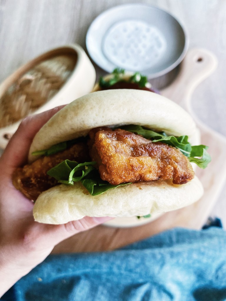 ➔ 取一張蒸好的刈包皮,放入芝麻葉→鹹酥雞→芝麻葉,【鹹酥雞刈包】完成了!