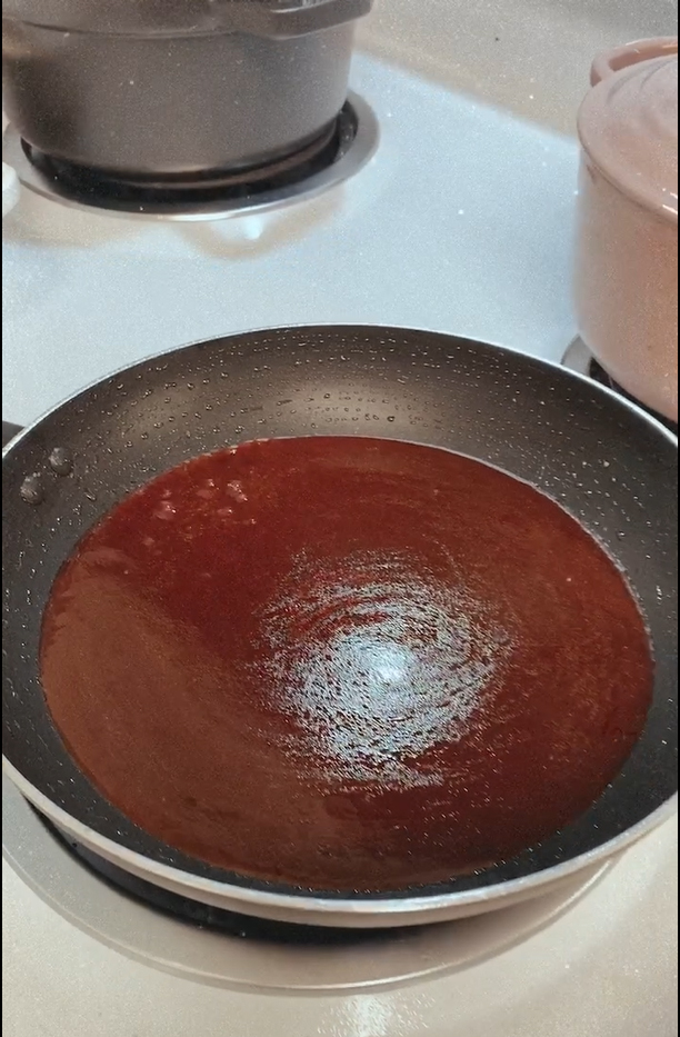 同時開始調醬料,把韓式辣醬1匙、番茄sauce 、醬油、白醋、楓糖漿、蜂蜜、麻油、攪拌均勻,邊調邊試味道哦。(像我喜歡酸甜一點,辣醬就放比較少)。