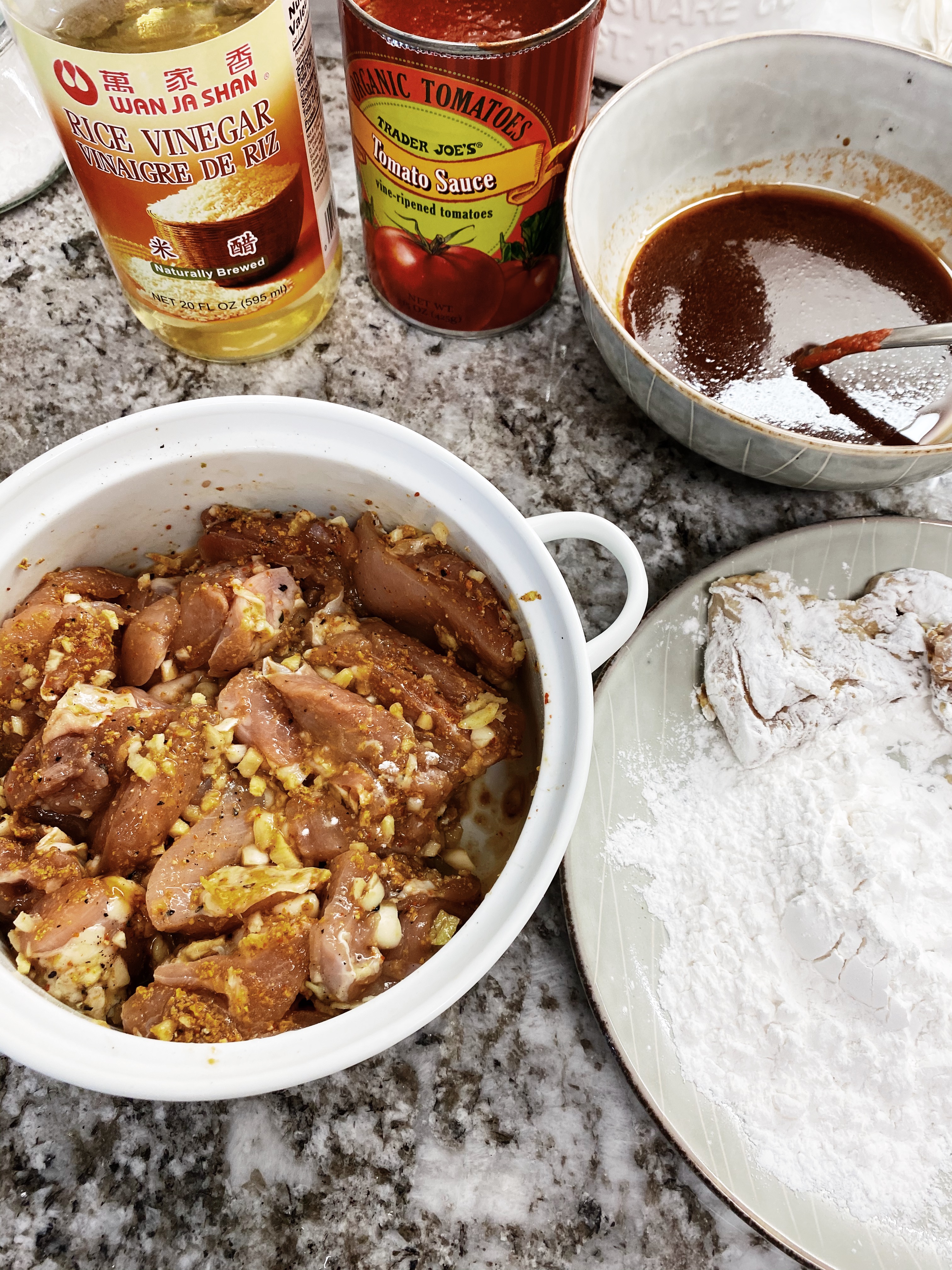 把醃過的雞肉沾太白粉靜置5分鐘,在平底鍋中倒入油,熱鍋後煎雞肉,煎到表面金黃取出,倒掉多餘的油,把調好的醬汁煮30秒微滾關火,