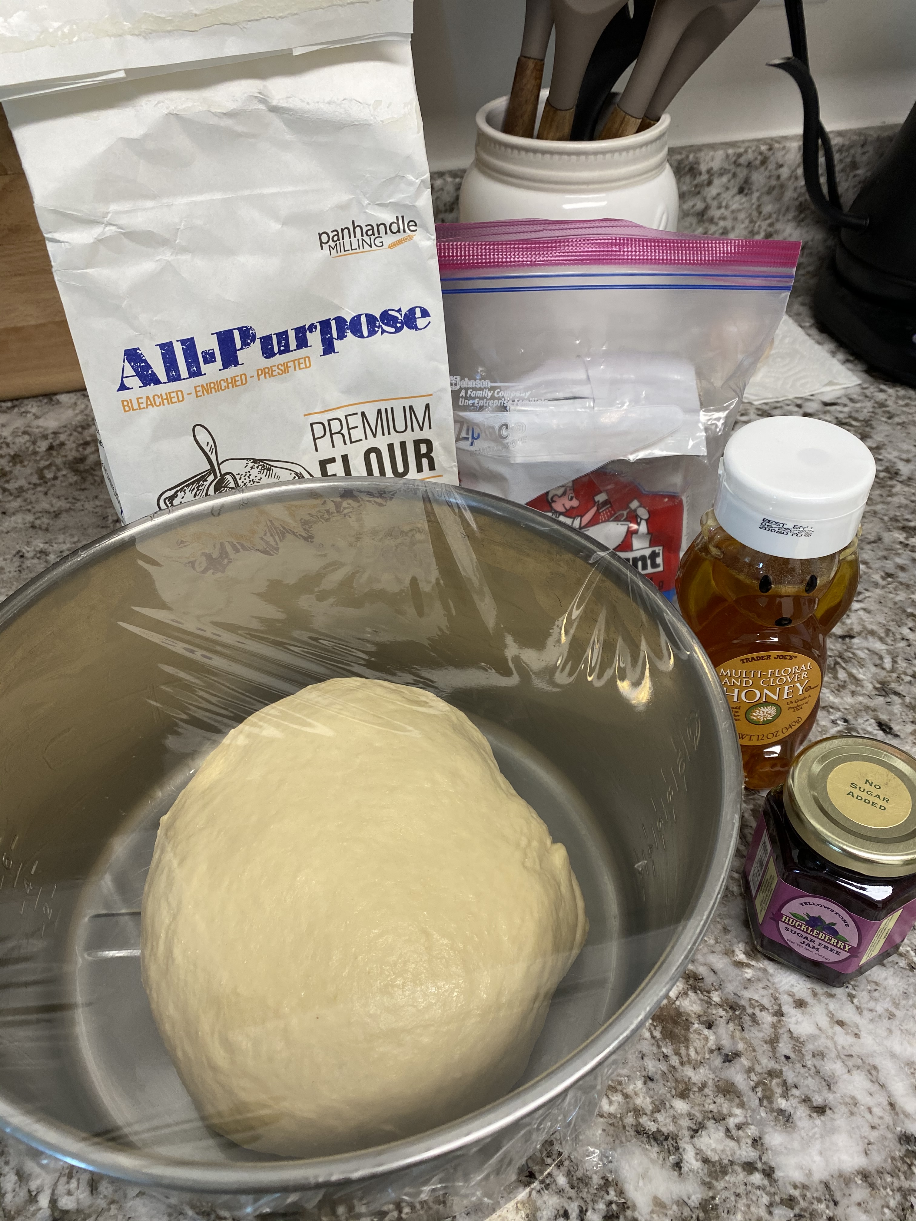 在all purpose flour中加入蜂蜜、豆漿(一點一點加)、奶油、三匙酵母粉、砂糖、一點點鹽攪拌均勻,和勻後揉15分鐘成一個光滑的麵團,把麵團蓋上保鮮膜,放室溫發酵至兩倍大約1小時(下圖順序),發至兩倍大後取出排氣,稍微再揉一下。