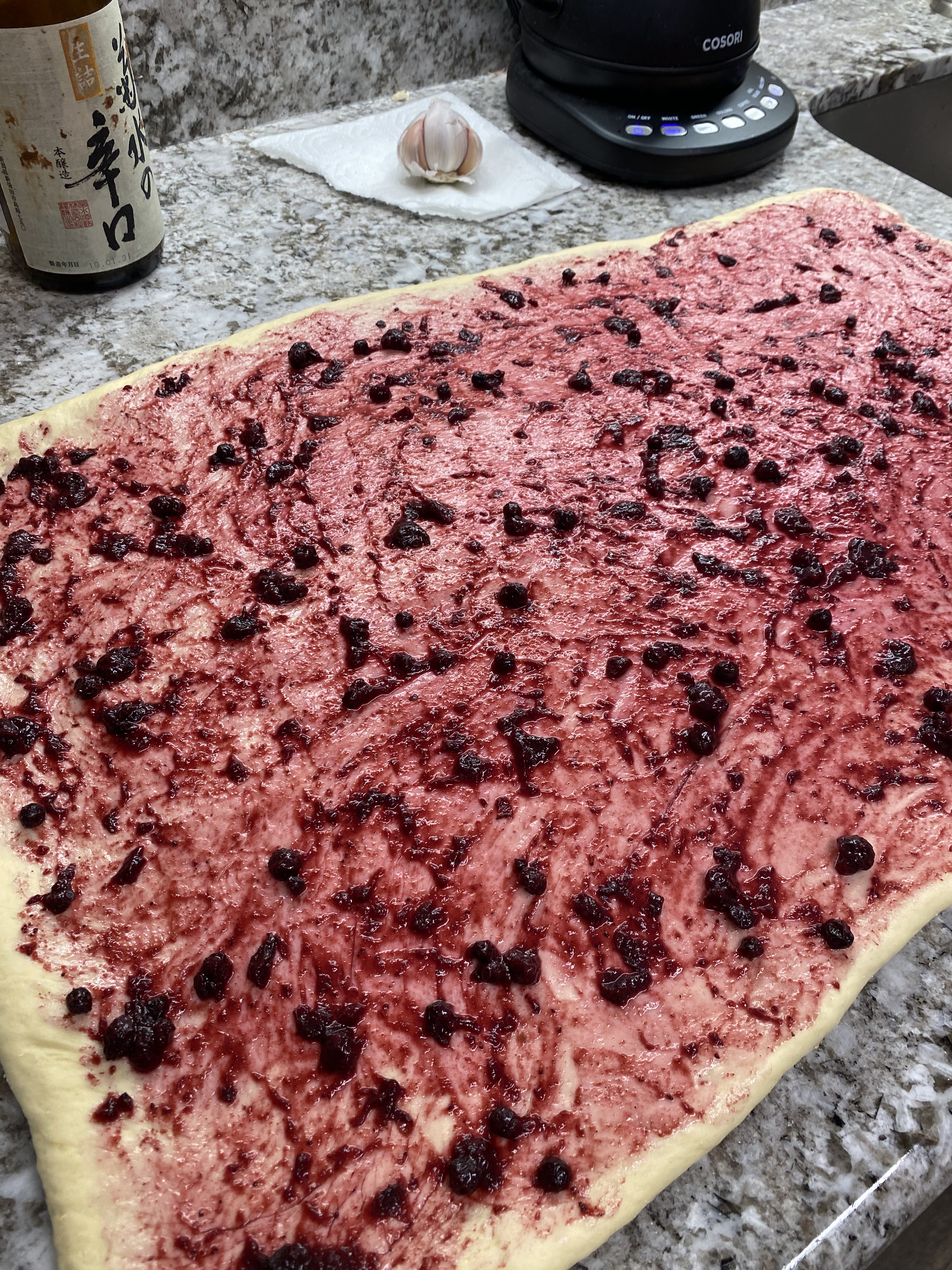 接著桿成一張長方形,上面抹滿滿的huckleberry果醬,再慢慢捲起來成,最後切成3cm左右一個寬度,擺進抹好油的烤盤中,蓋上保鮮膜再發酵2倍大,放入預熱好的烤箱華氏355度烤25分鐘。
