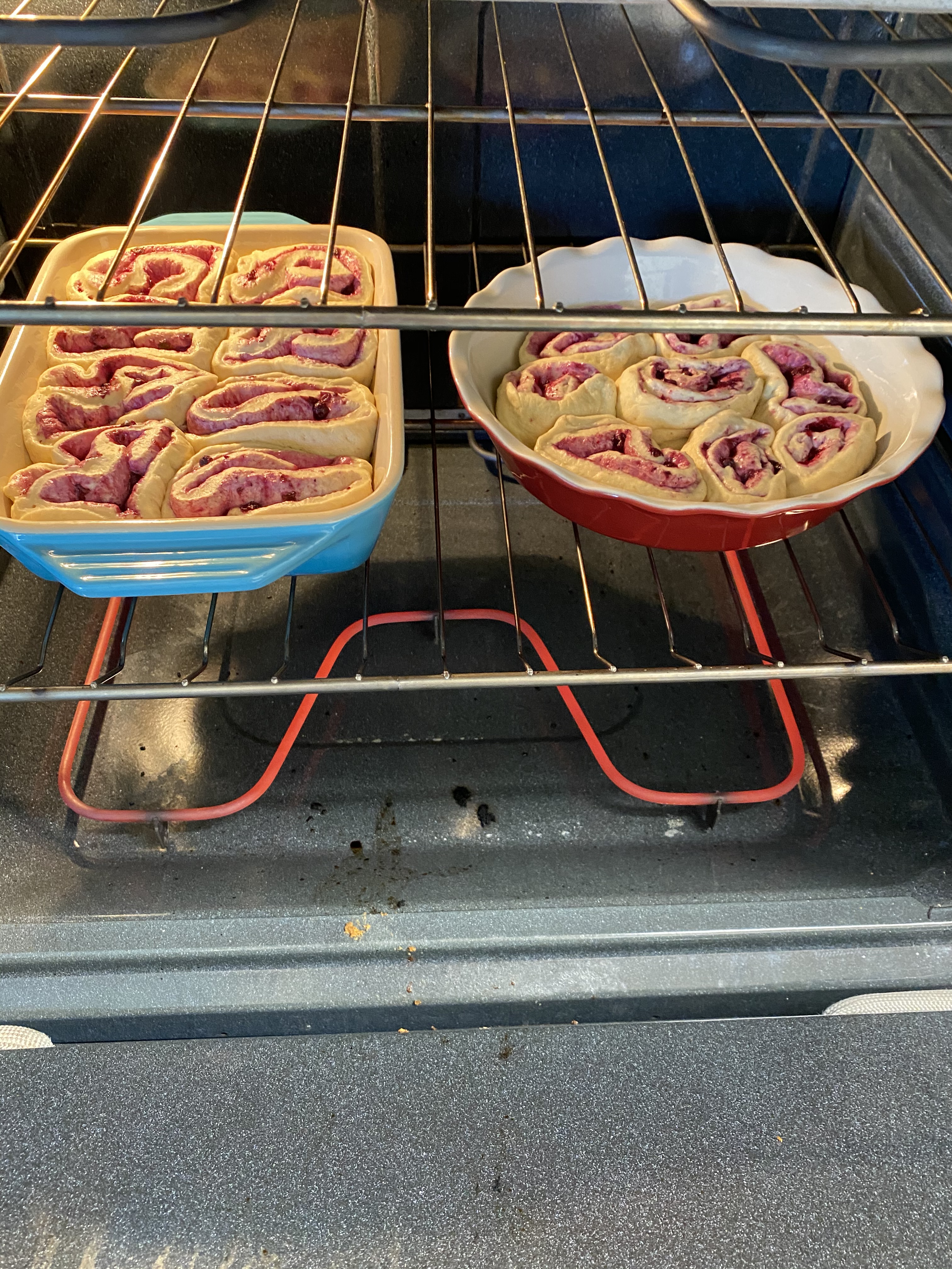 作法跟做肉桂捲一樣,只是把撒肉桂粉的步驟換成抹上滿滿的huckleberry果醬(我整罐倒下去)烤25分鐘,出爐的麵包真的超~香!撕開來都是濃濃的果醬,酸酸甜甜鬆軟好吃,要吃之前我再淋上一點楓糖漿,配上一杯咖啡好滿足😌