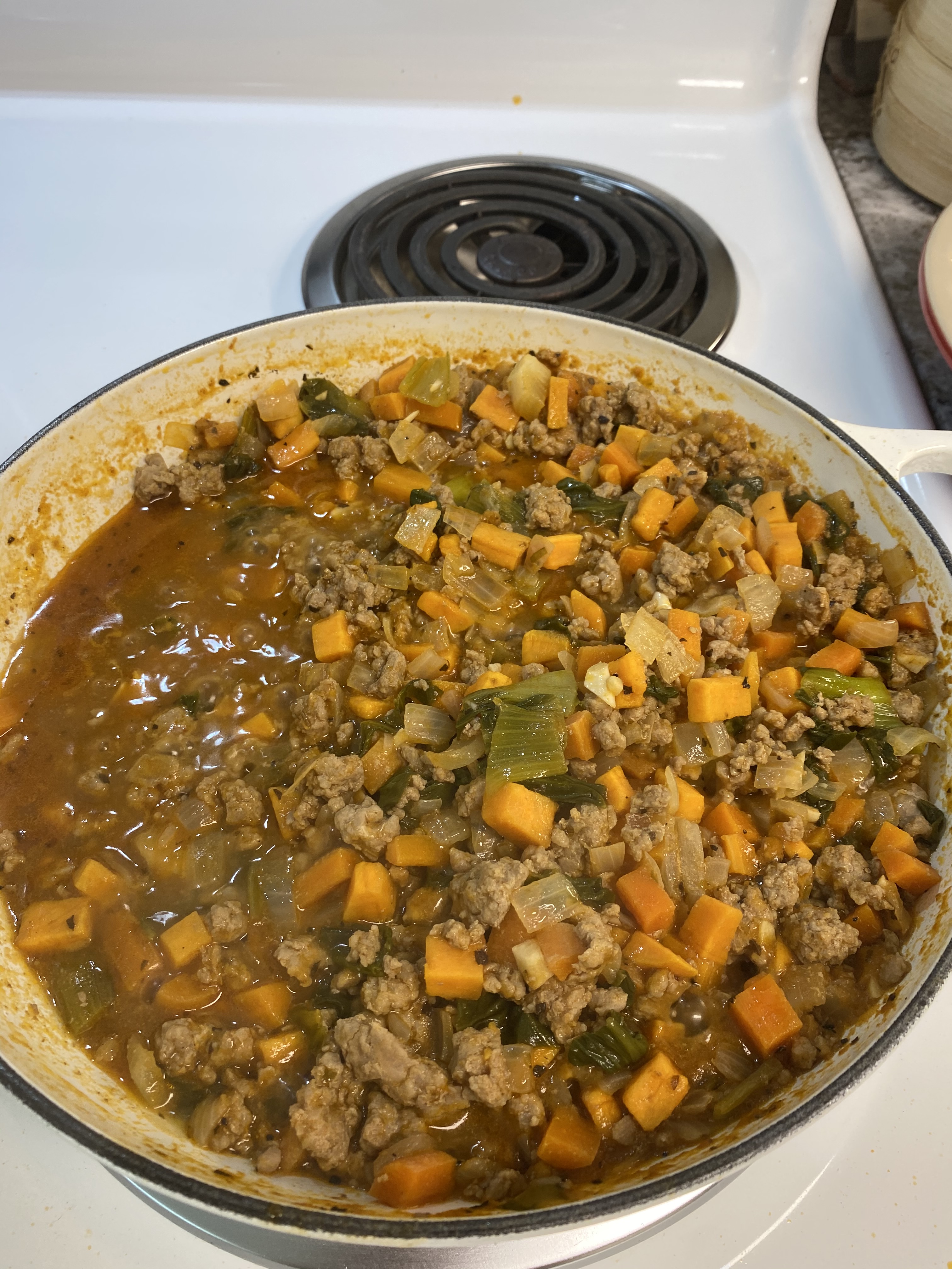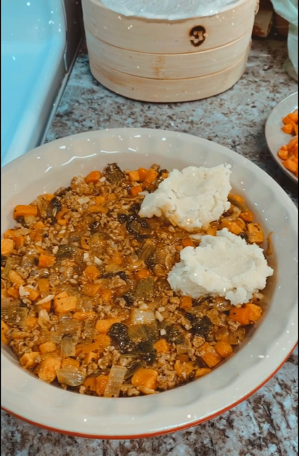 因為前面兩道都是中菜,這道我選擇做西式的【牧羊人派】,鋪底的是豬絞肉、紅蘿蔔、洋蔥丁、青江菜丁(取代西芹),上面鋪了滿滿的奶油馬鈴薯泥+mozzarella cheese,因為燉煮了2小時再送烤箱烤20分鐘,整體口感又香又綿密!