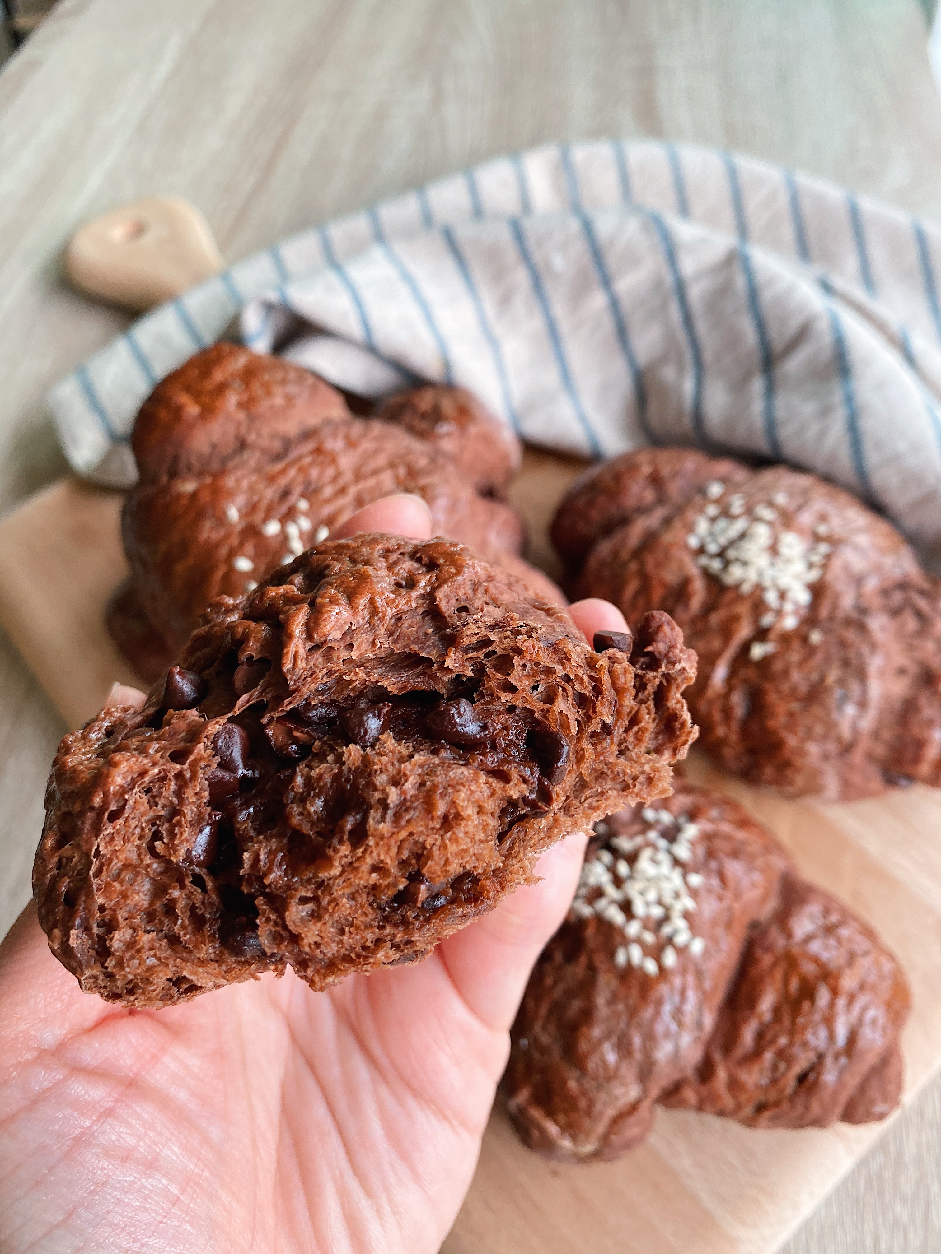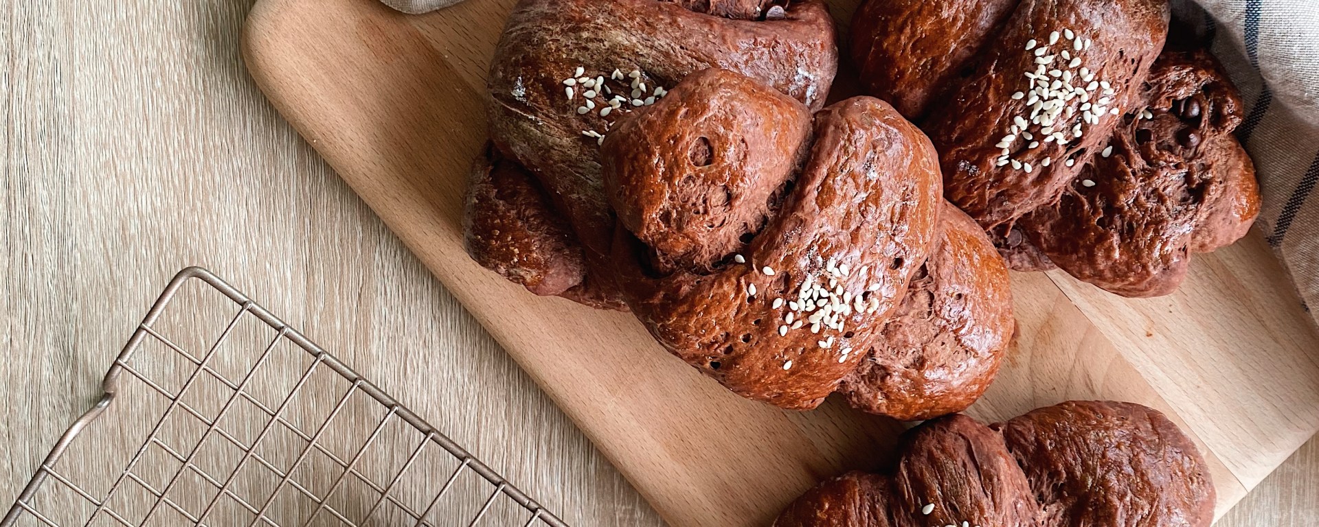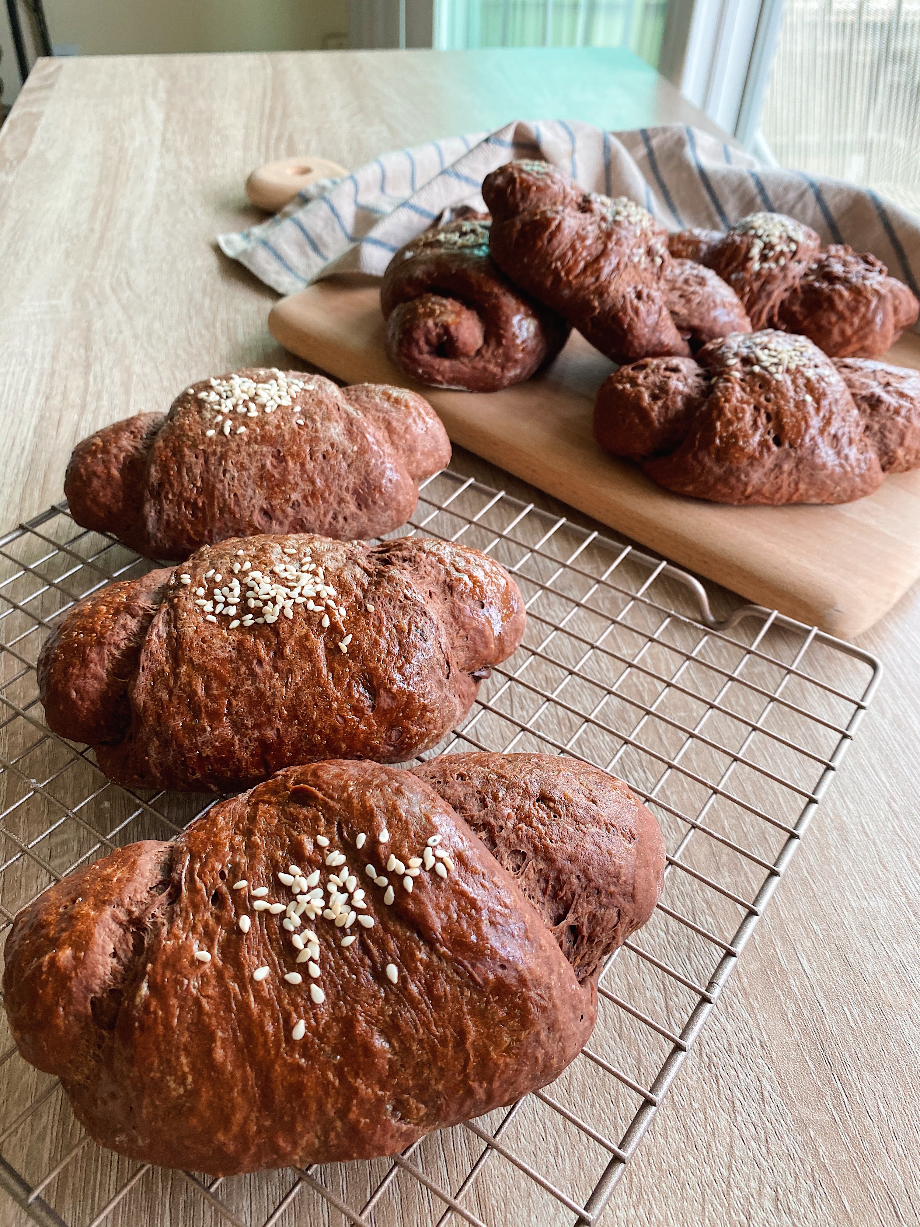 帶有濃濃可可香的麵包,咬下去裡面有鋪滿滿的水滴巧克力豆,吃起來真的很滿足!(就是捲捲版的黑眼豆豆麵包)