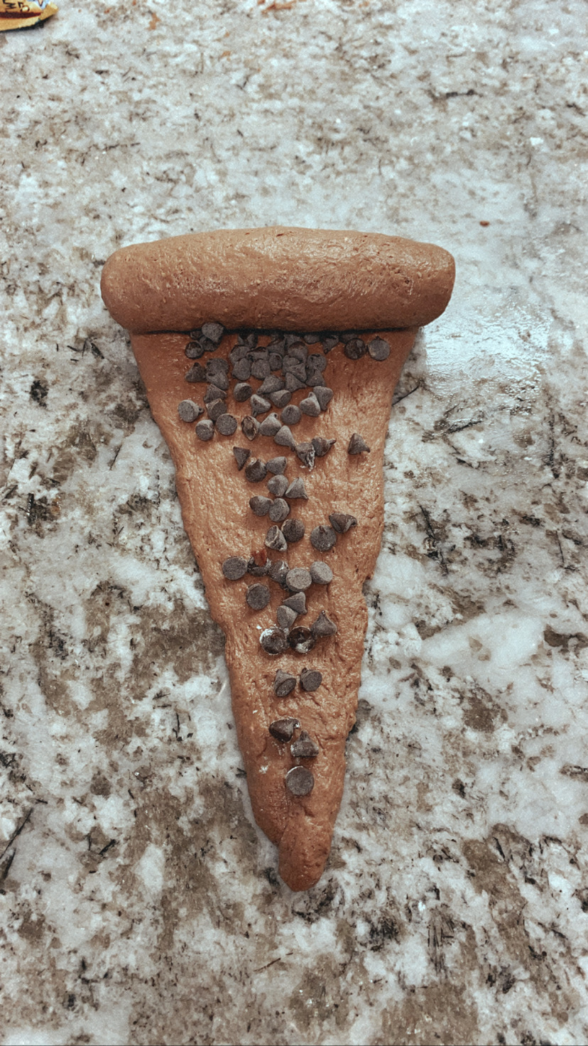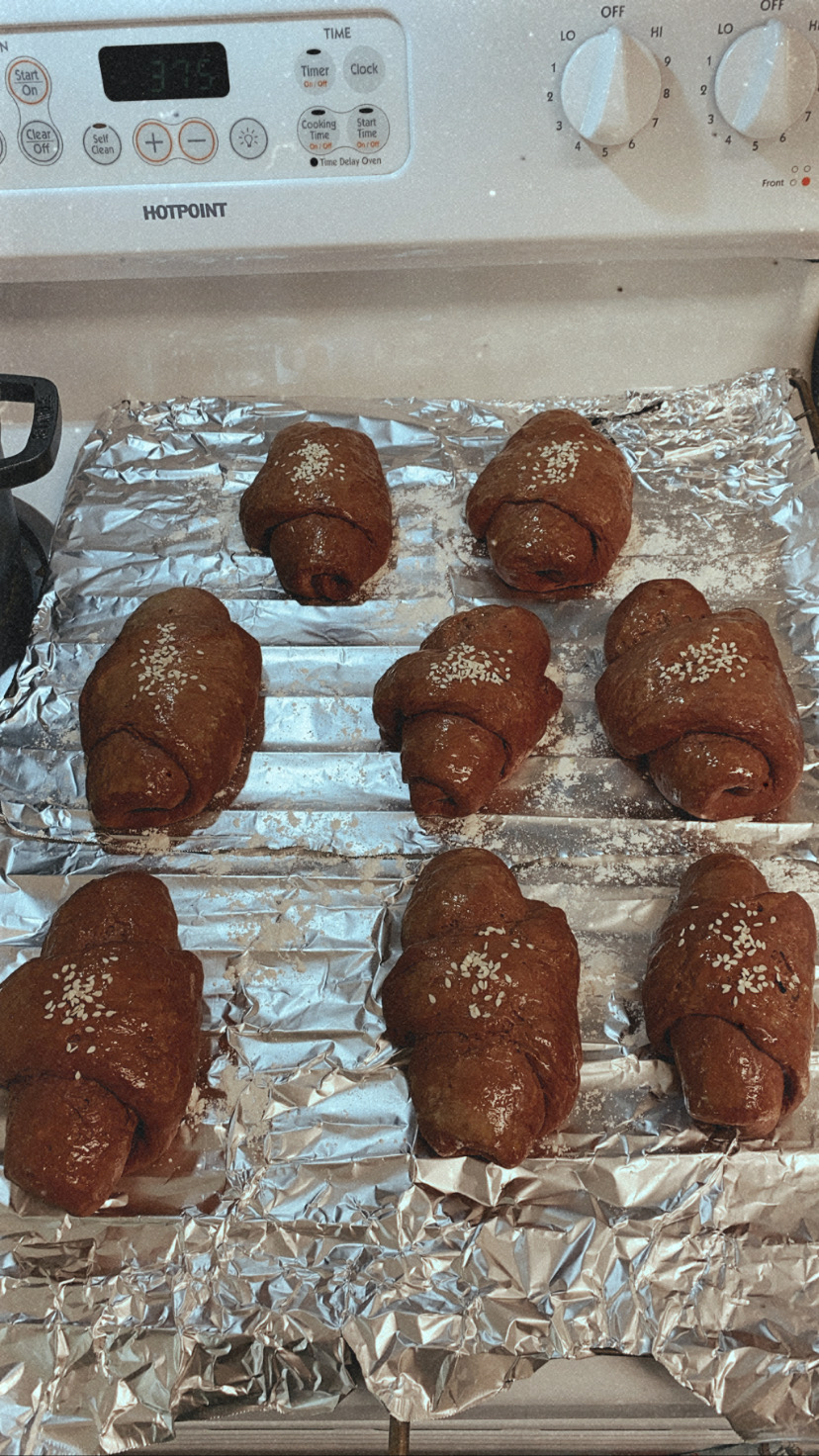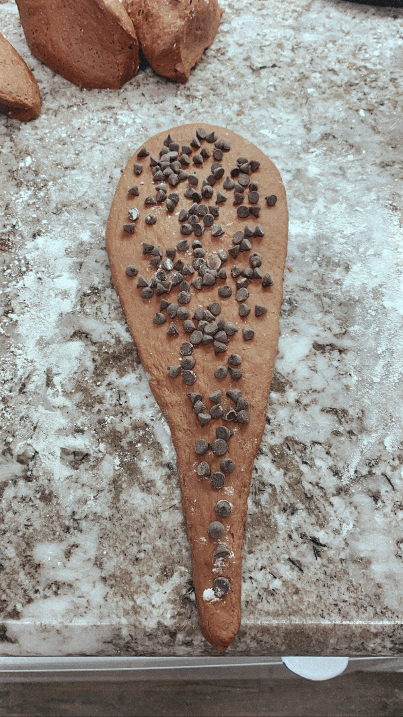 把小麵團每個桿平成頭大尾端細對長條狀,每個撒上滿滿的水滴巧克力豆,再從寬至細把麵團捲起來,總共差不多可以做了8個,蓋上保鮮膜讓它再發酵1小時,送進烤箱前抹上薄薄蛋液再撒上白芝麻。