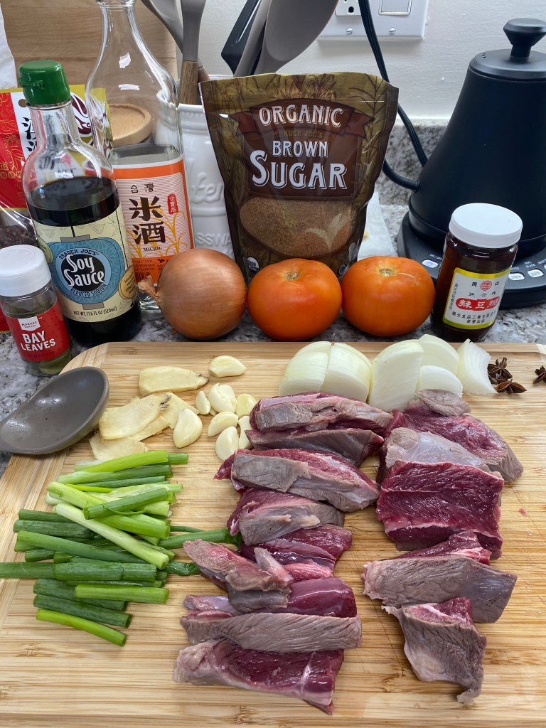 把650克牛腱放入水中川燙(不用太熟)取出,放砧板上切塊(可以切厚一點點),把薑切片、洋蔥、番茄切塊備用。
