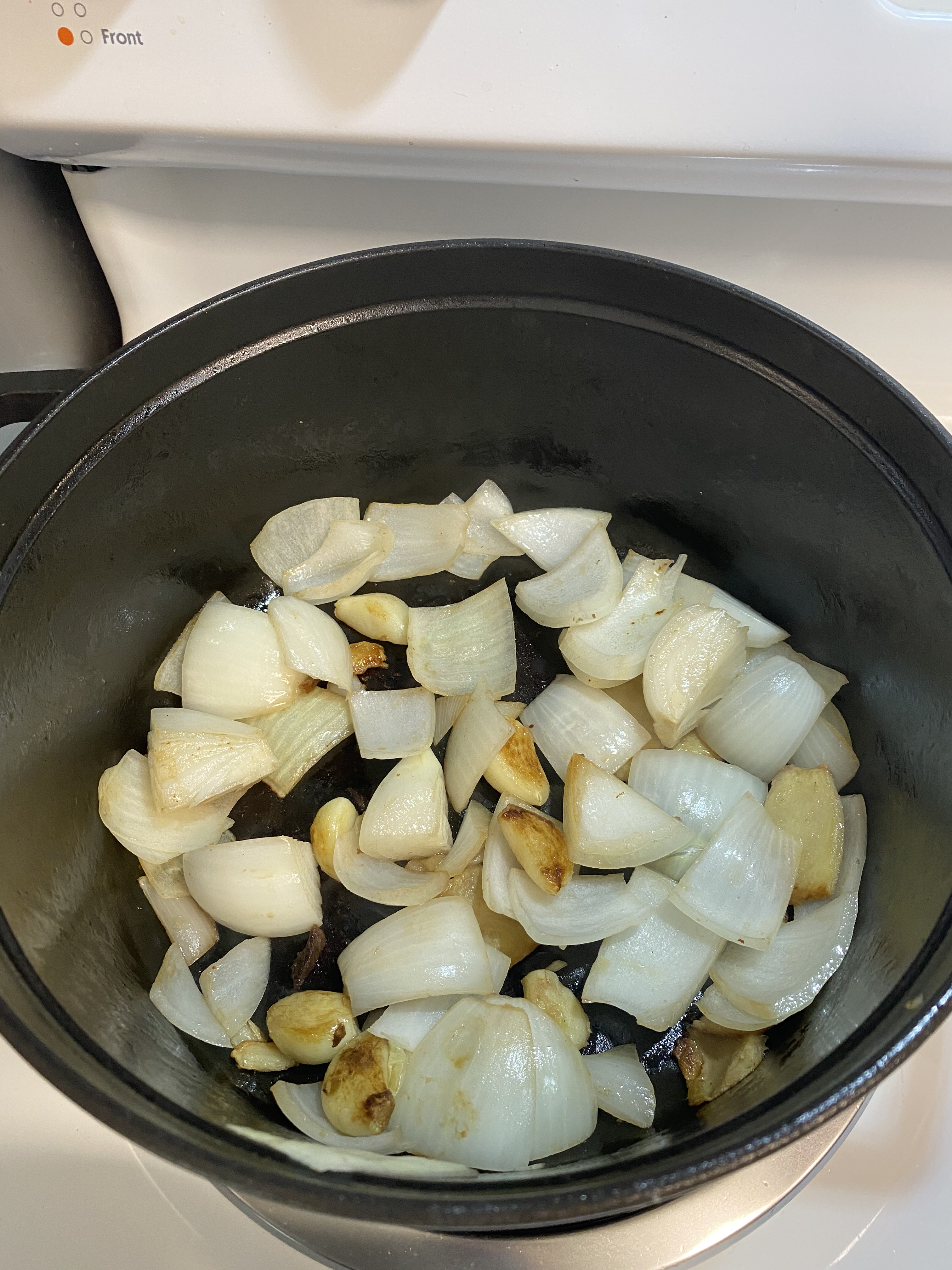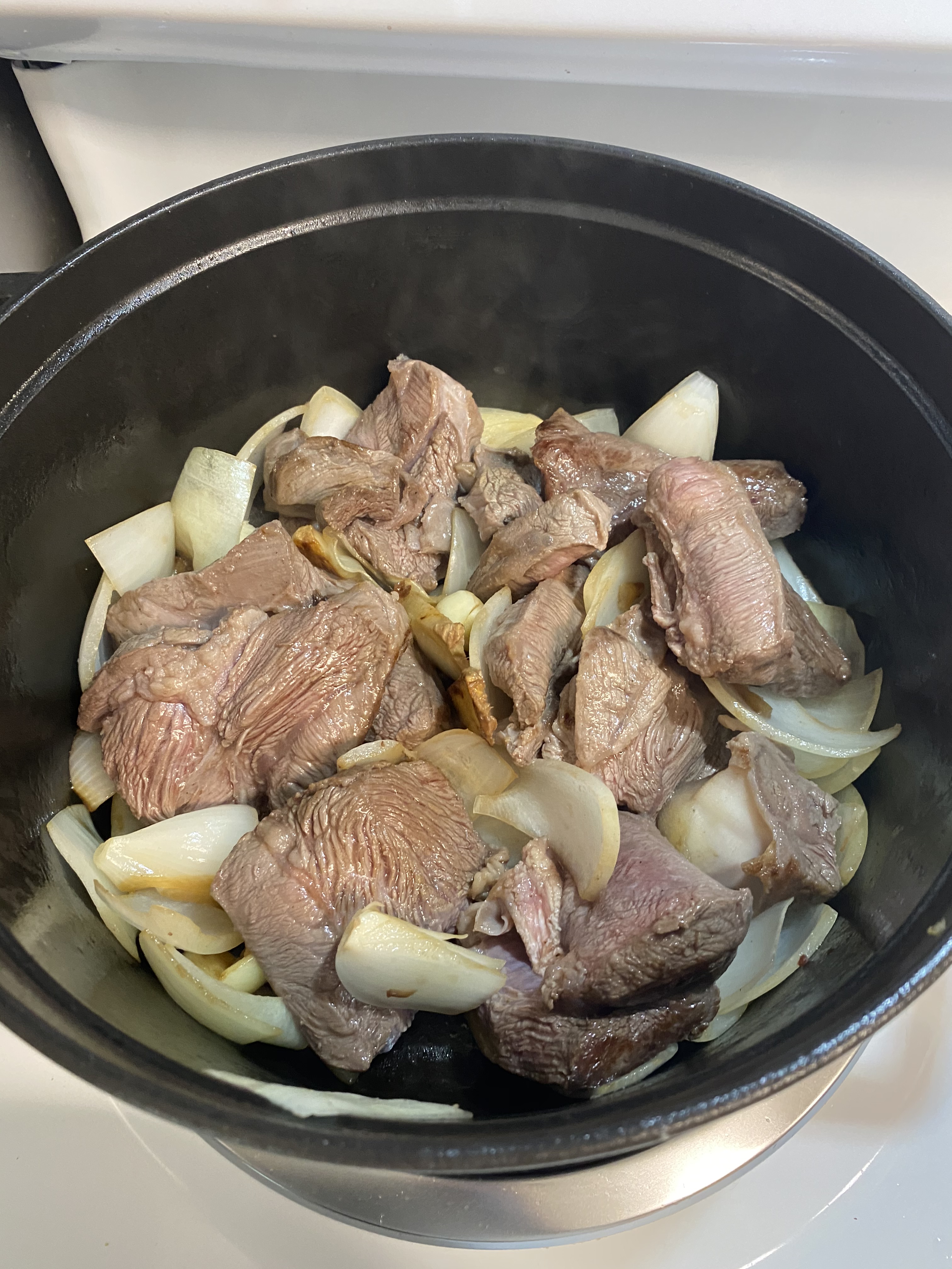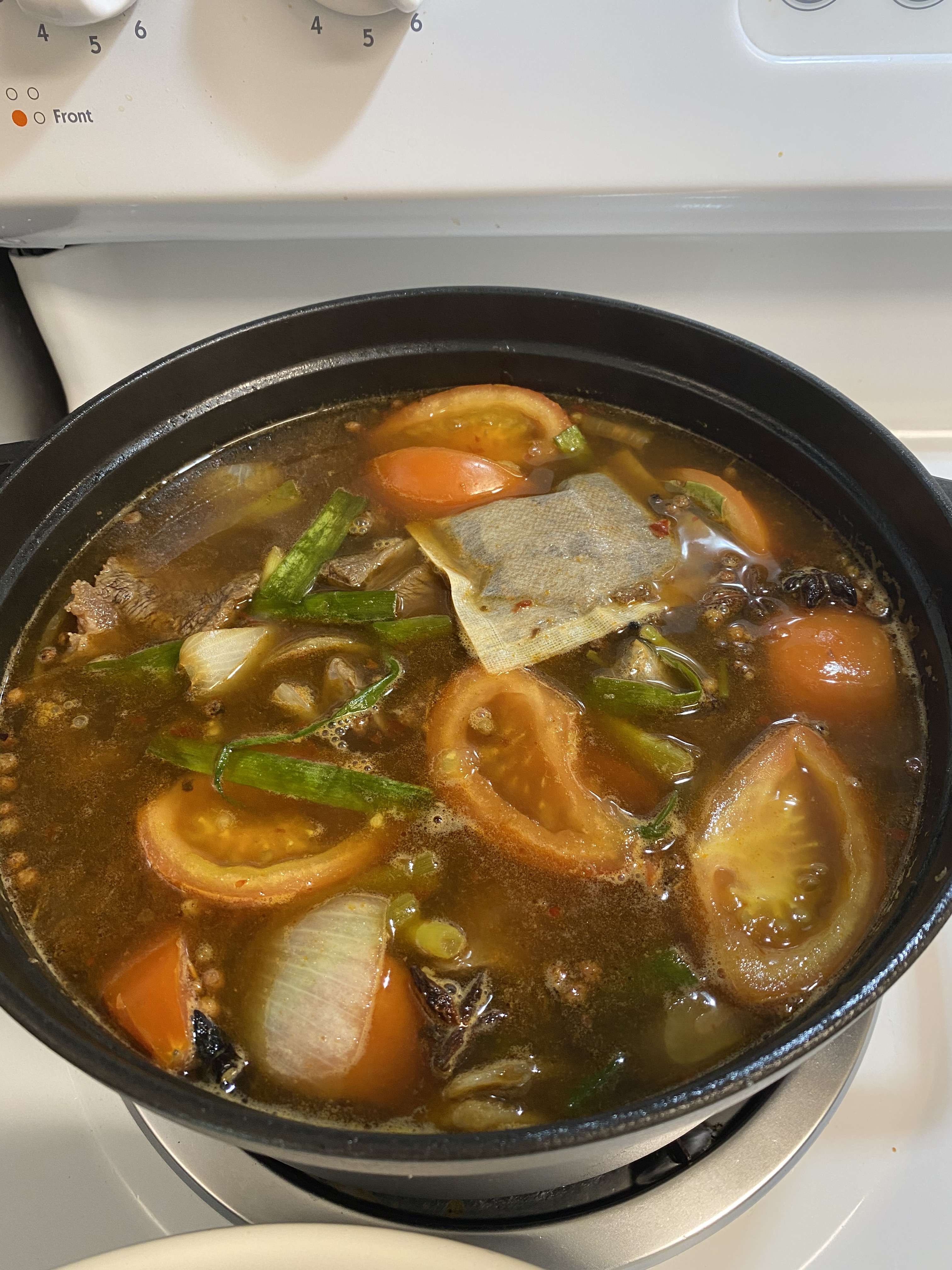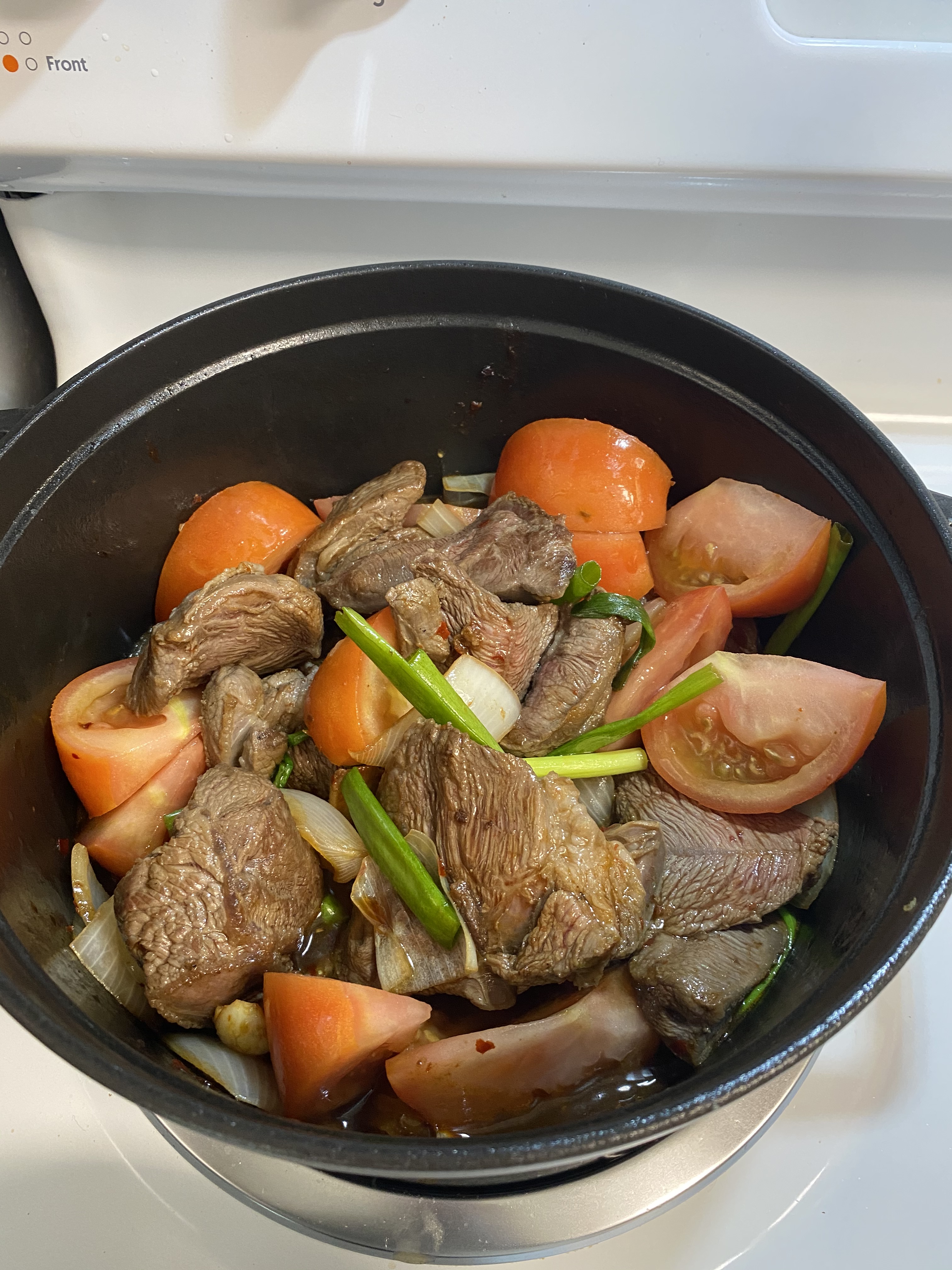 中火鑄鐵鍋加油,放入薑片5片、蒜粒5顆爆香、再放入洋蔥炒香,把牛腱肉塊放回鍋中一起拌炒並加入兩匙辣豆瓣醬、醬油50cc、砂糖2匙、米酒2匙拌炒,把番茄塊也加入煮滾,倒入熱水蓋過所有材料,放入八角3粒、花椒粒半匙、滷包、月桂葉一片,煮滾後轉中小火煮60分鐘,再關火悶40分鐘。
