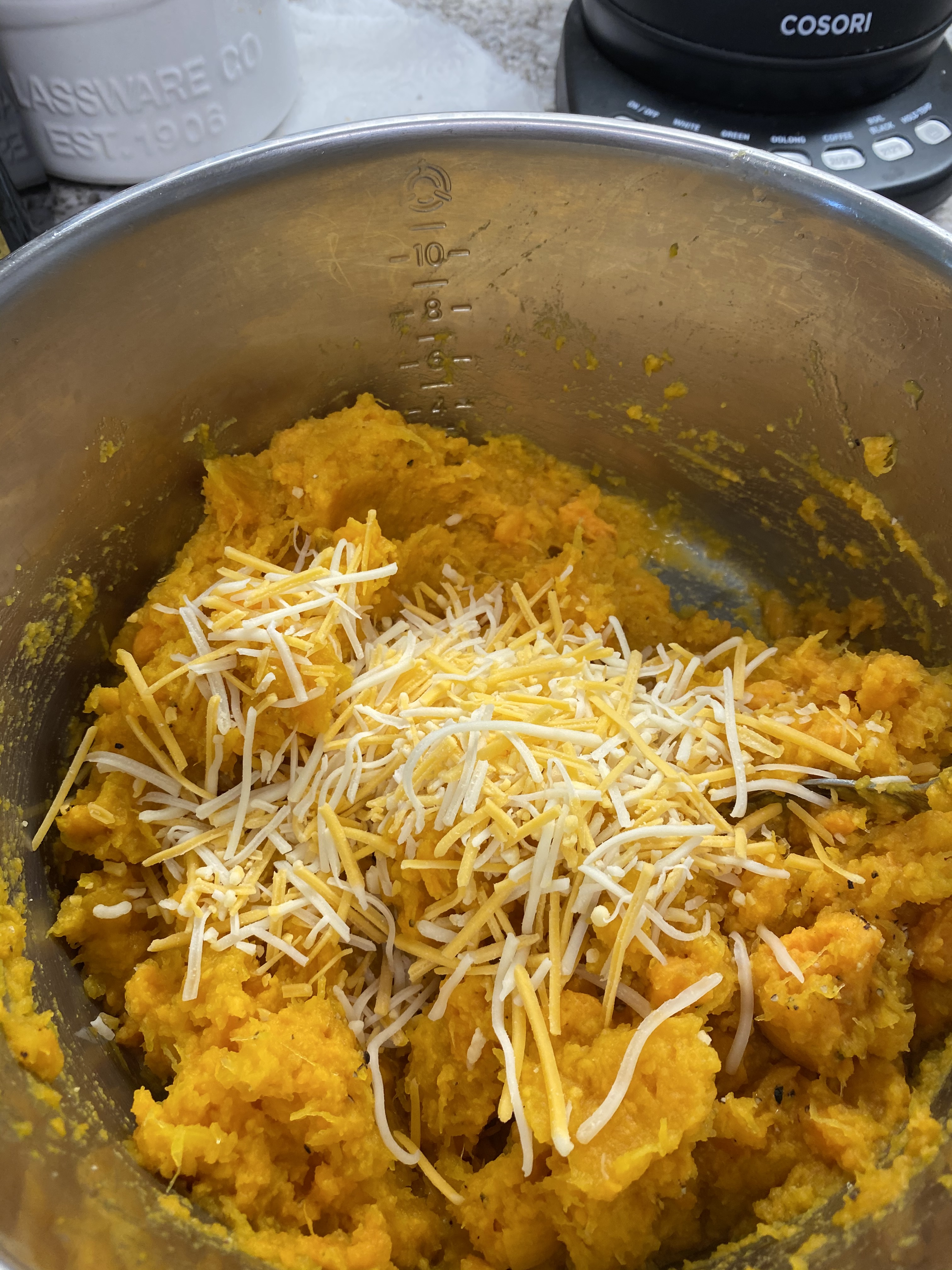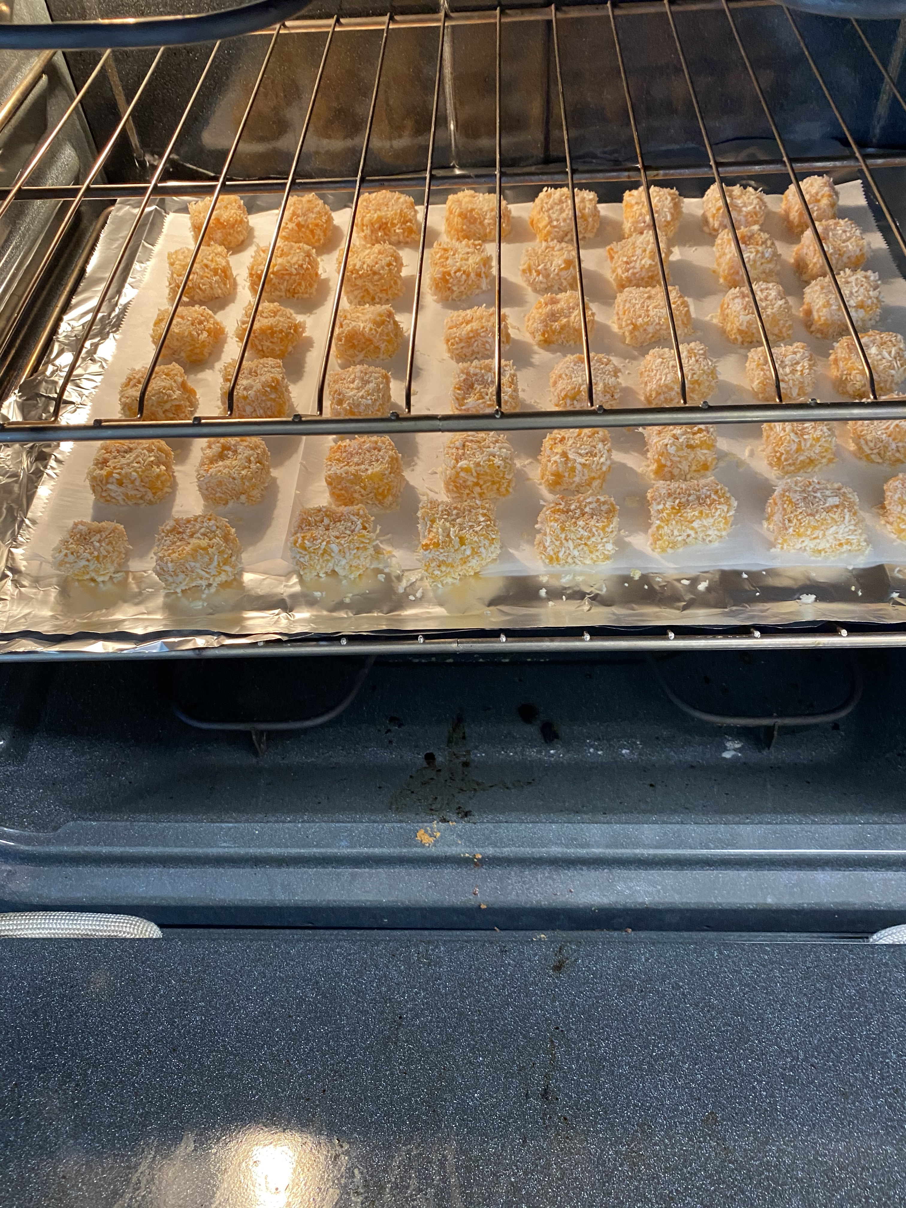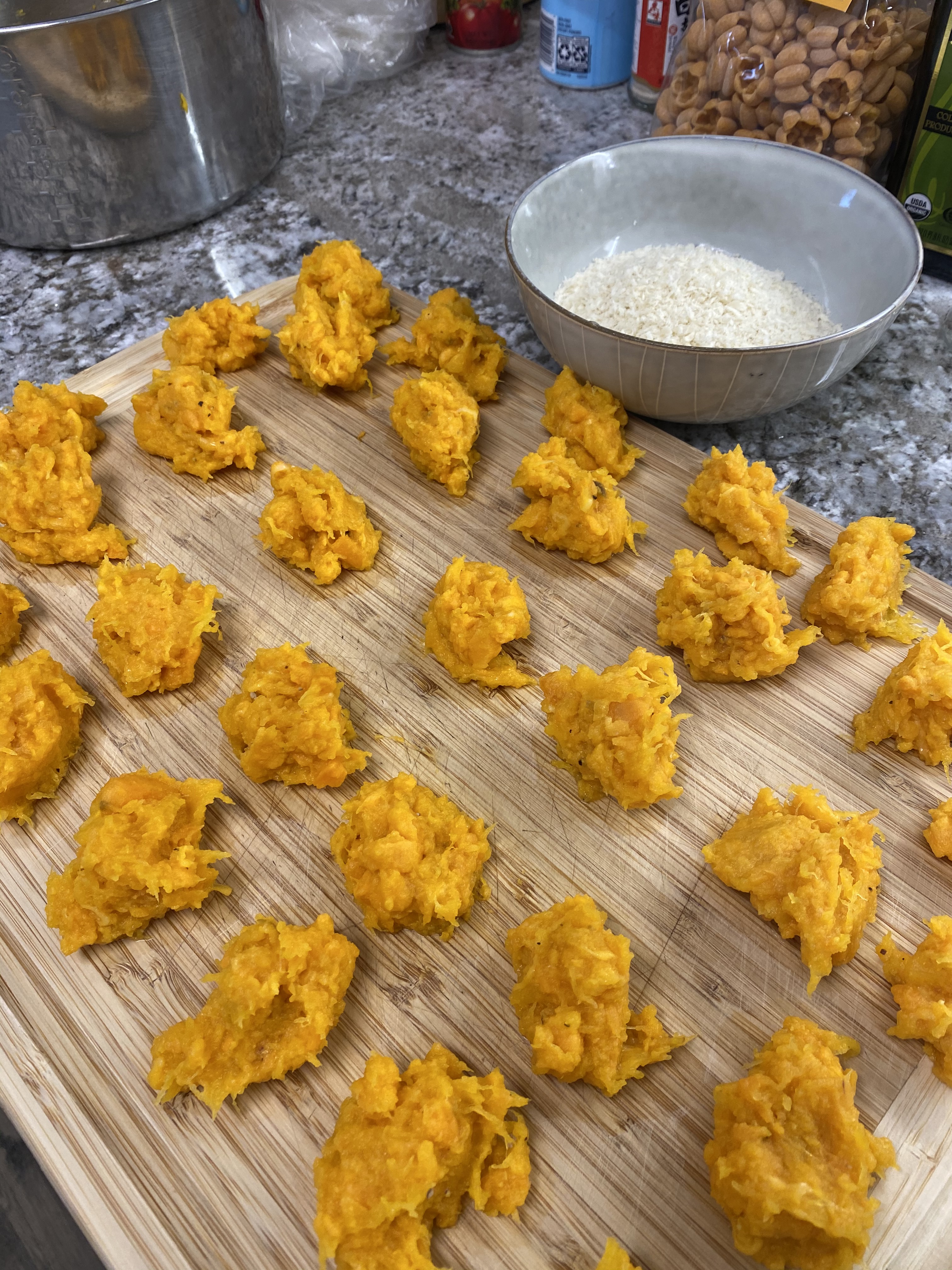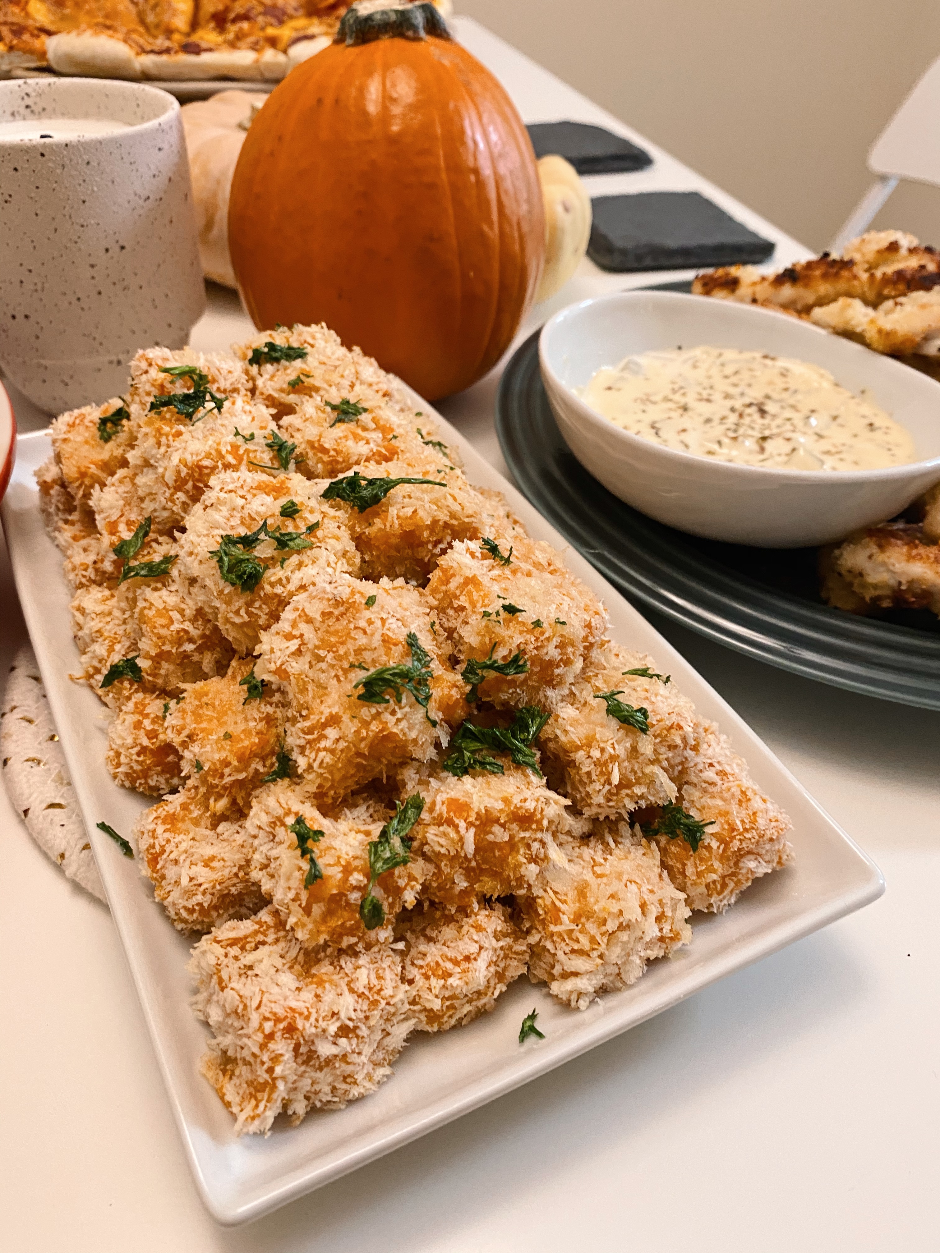 我開胃菜的選擇是【酥烤南瓜番薯球 + 酥炸雞柳條佐美乃滋】,首先開胃菜我想要做一道派對小食料理,我用南瓜 + 番薯一起放進電鍋蒸,並加入帕瑪森起司稍做調味,捏成一個個小方塊裹上麵包粉,放進烤箱烤1小時,這時就可以開始準備另一道菜。