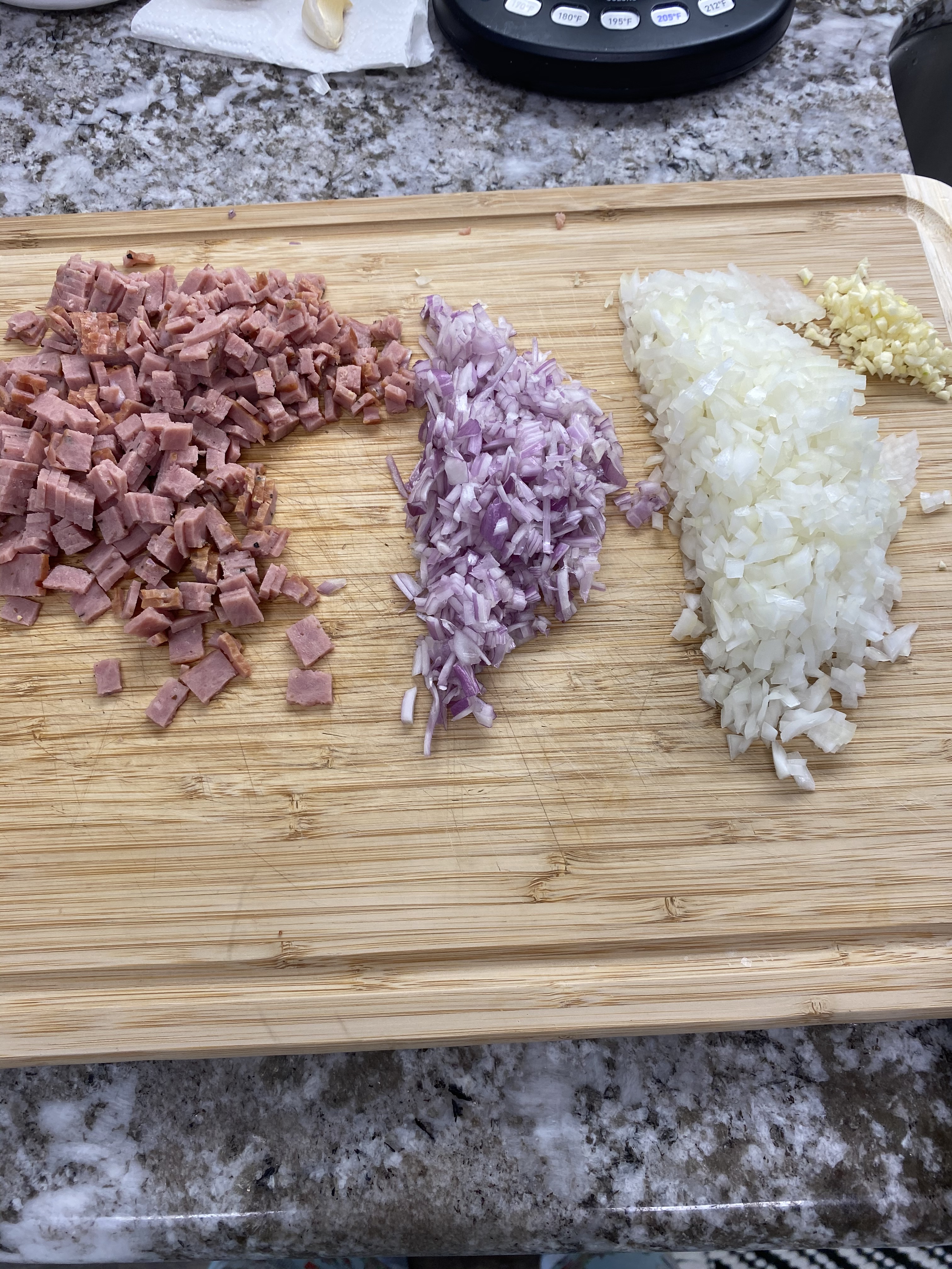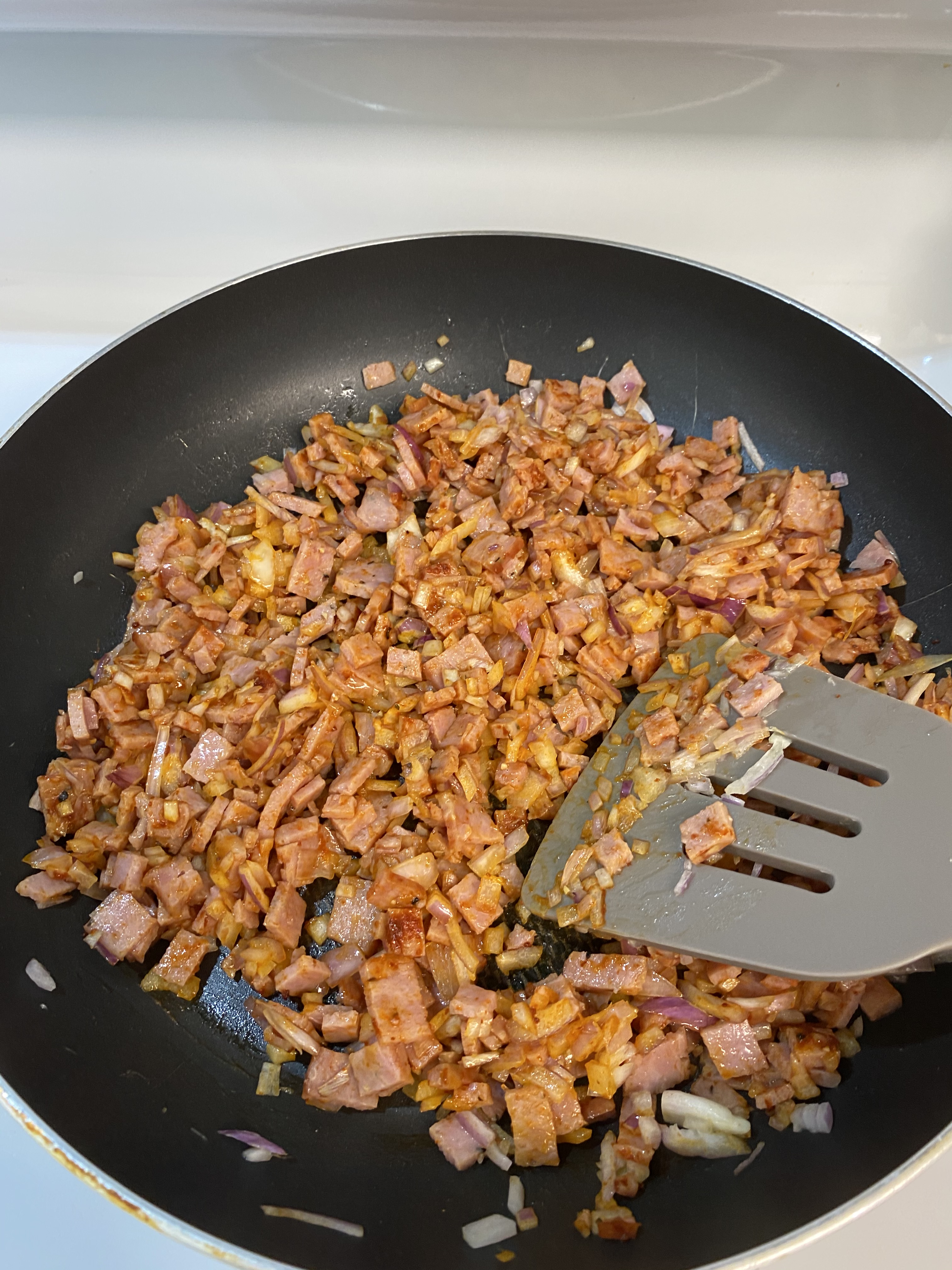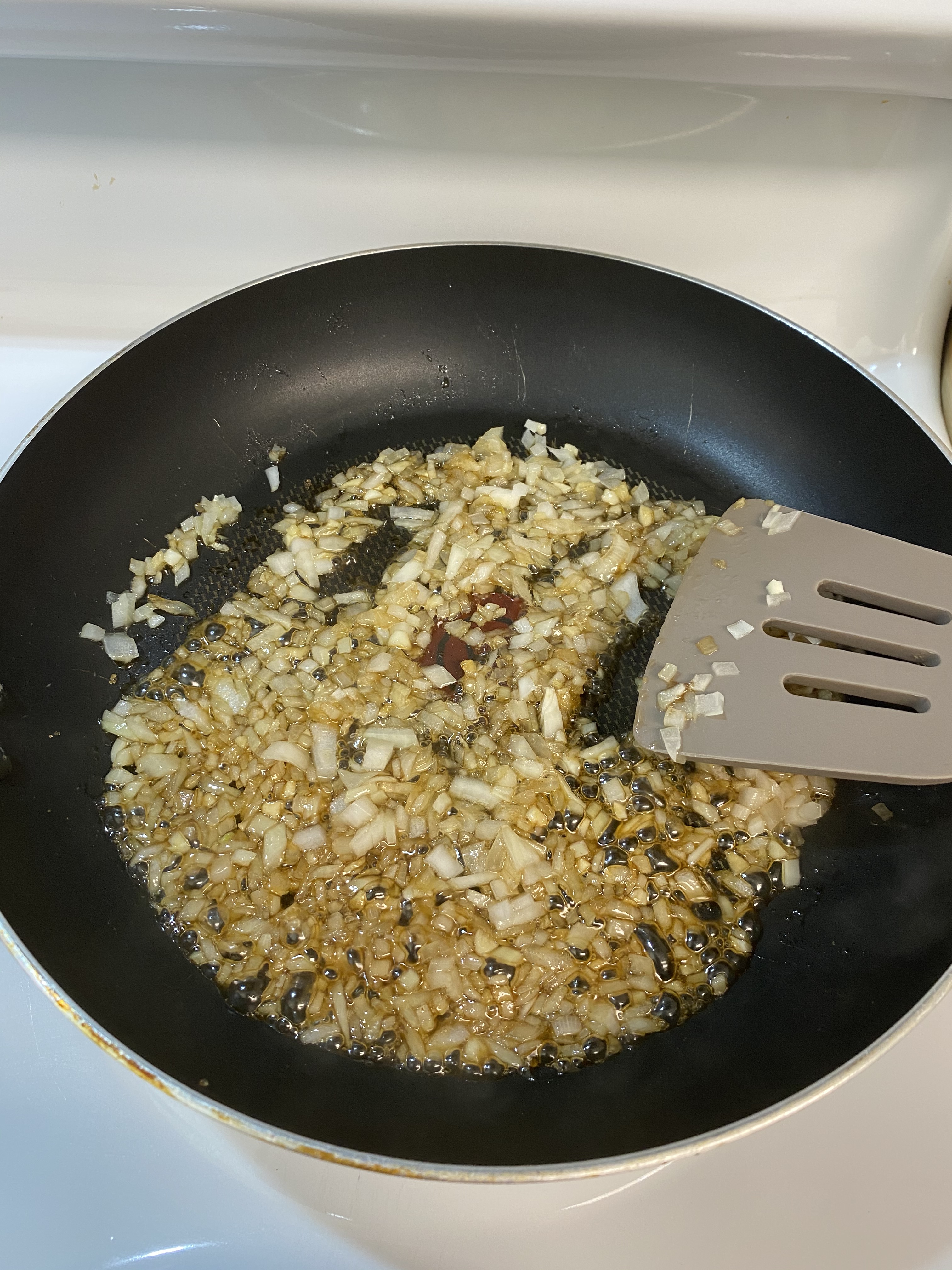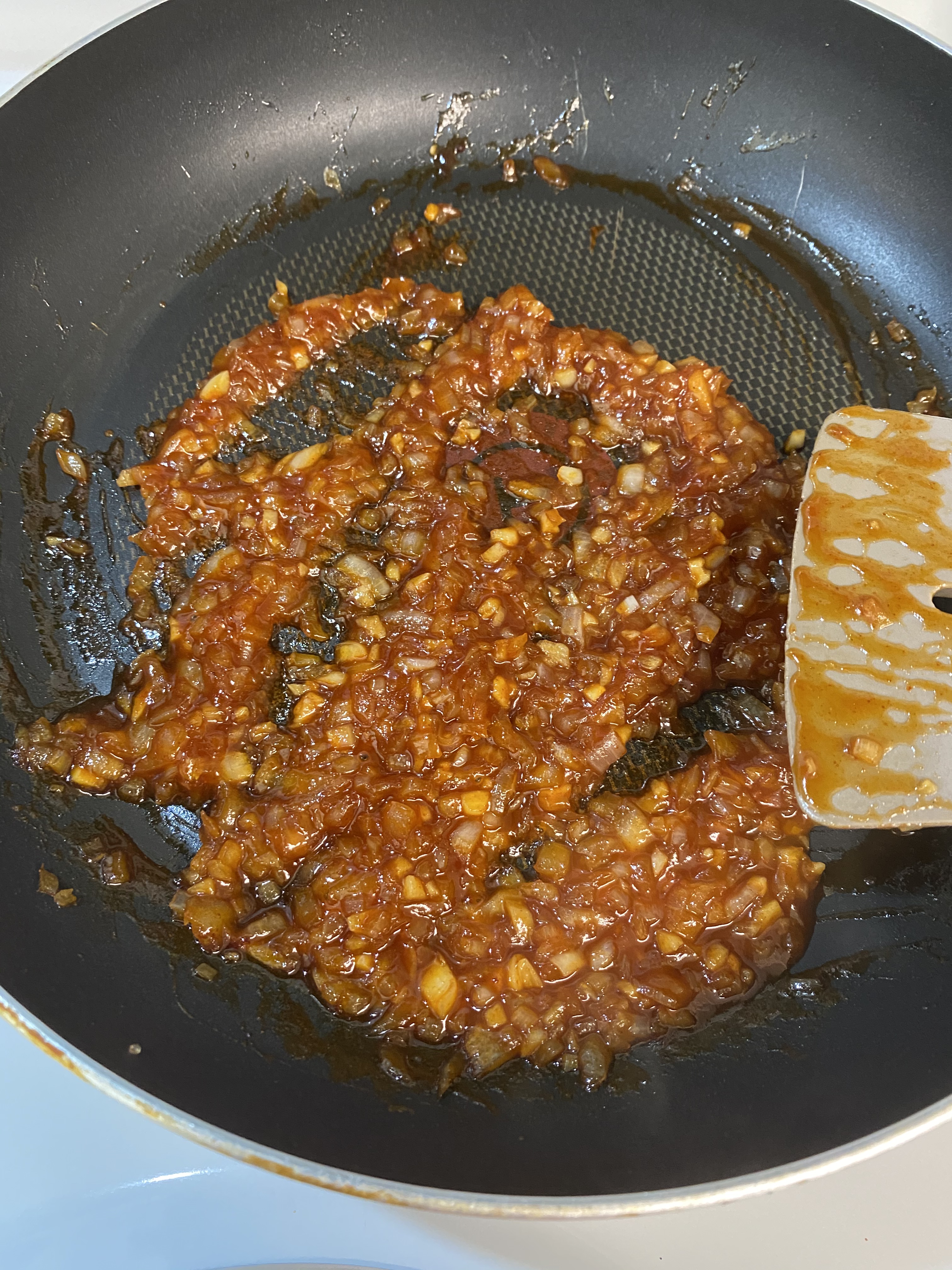 把半顆洋蔥切丁、3顆蒜粒切丁,放入平底鍋中用橄欖油炒香,加入少許鹽和黑胡椒、砂糖1匙、煙燻紅辣椒粉1匙,再加入2匙醋、2匙番茄醬混合,炒至自己喜歡的濃稠度就倒入碗裡備用。