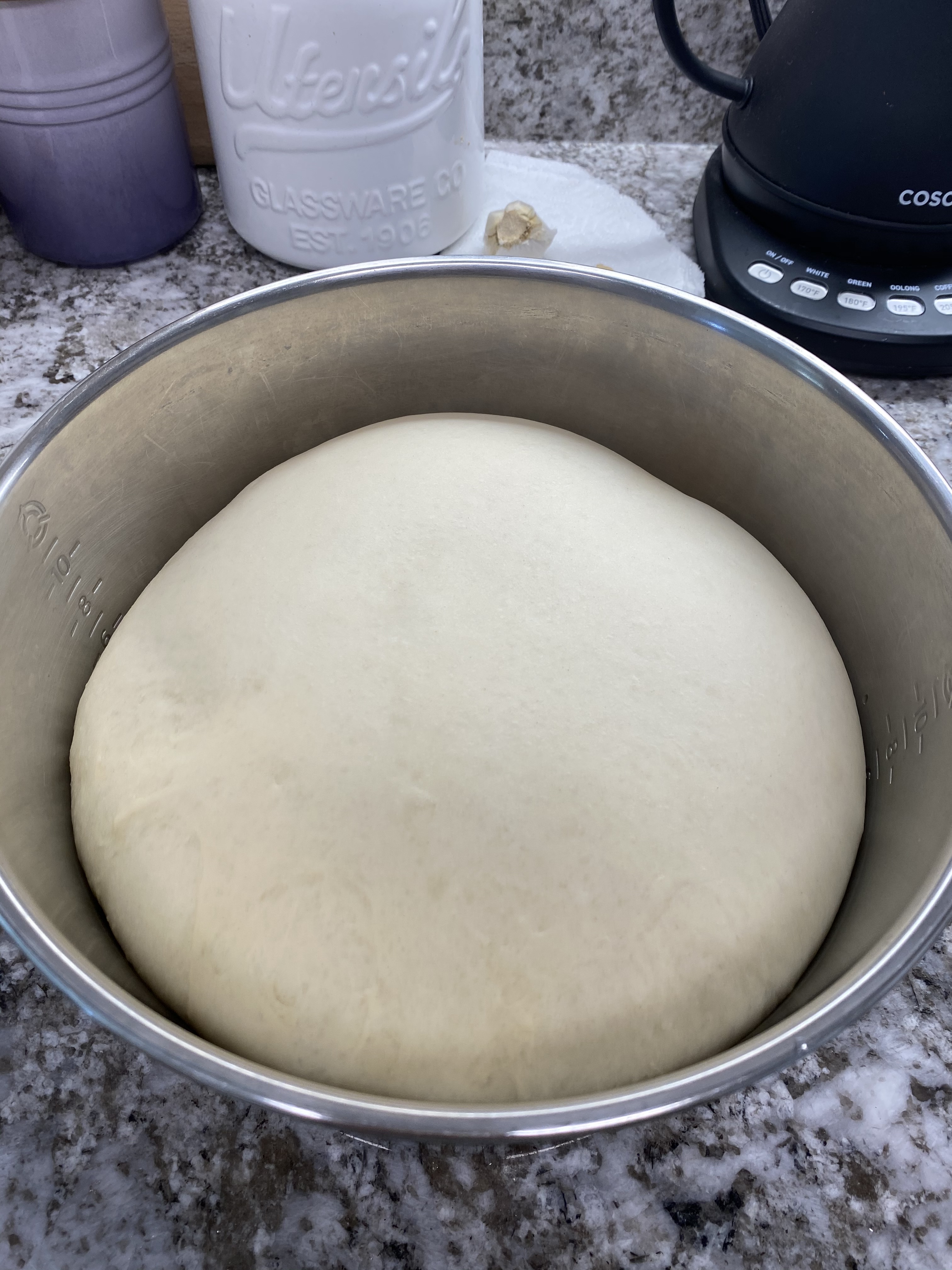 把all purpose flour 300克、砂糖2匙、酵母粉1匙、鹽1/2匙、鮮奶120ml攪拌均勻並搓揉10分鐘,麵團揉至不沾手後加入奶油20克,繼續揉10~15分鐘,放入鐵盆收口朝下用保鮮膜包住發酵至2倍大。