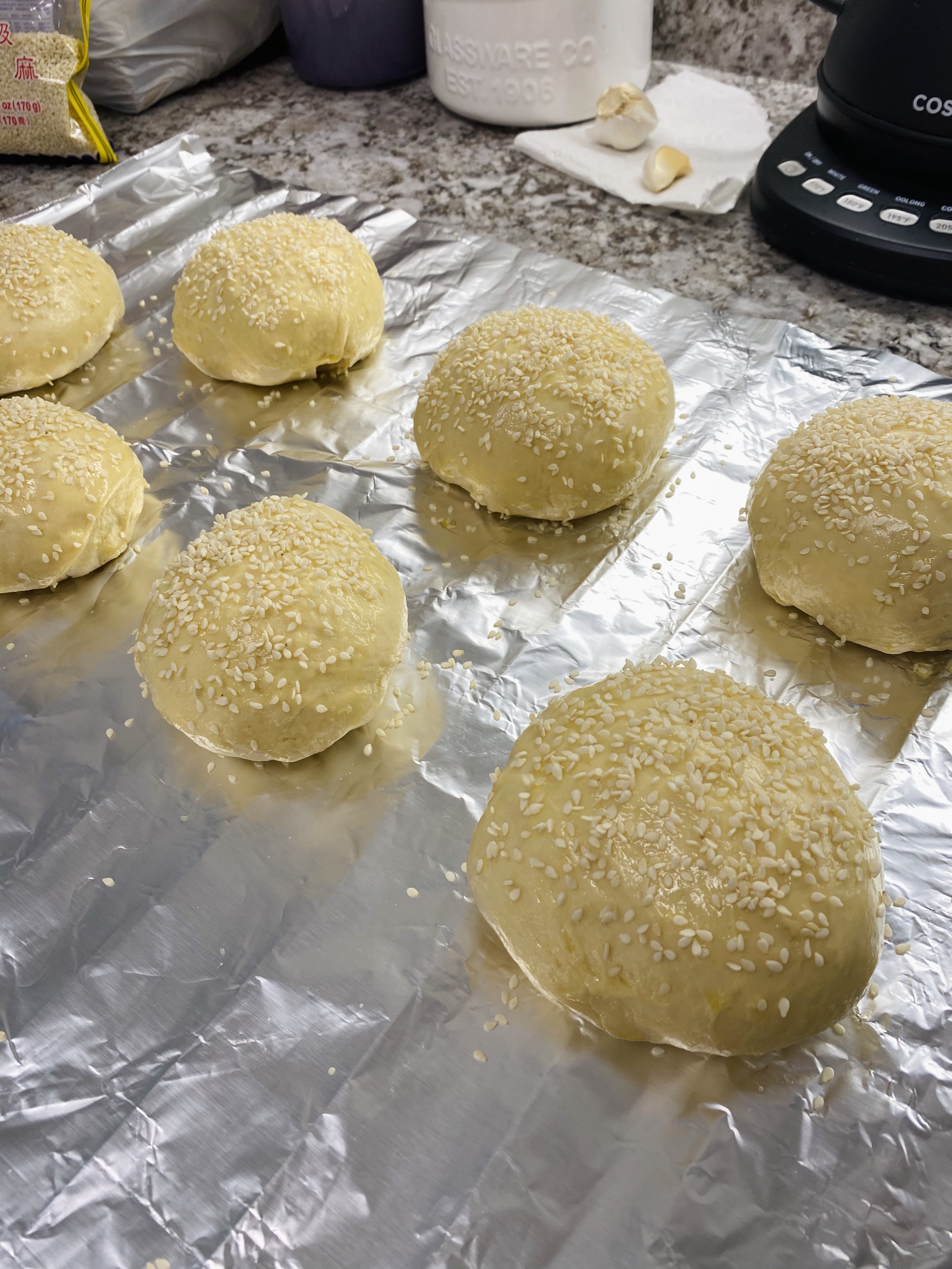 時間到取出排氣,切成6等份的圓,稍為壓扁一點圓,收口朝下,再醒15分鐘,表面刷上蛋液並灑上白芝麻,放入預熱好的烤箱390℉烤15分鐘,烤好取出放涼(好澎好可愛~)。