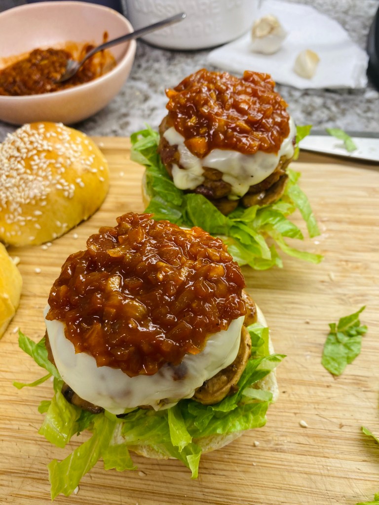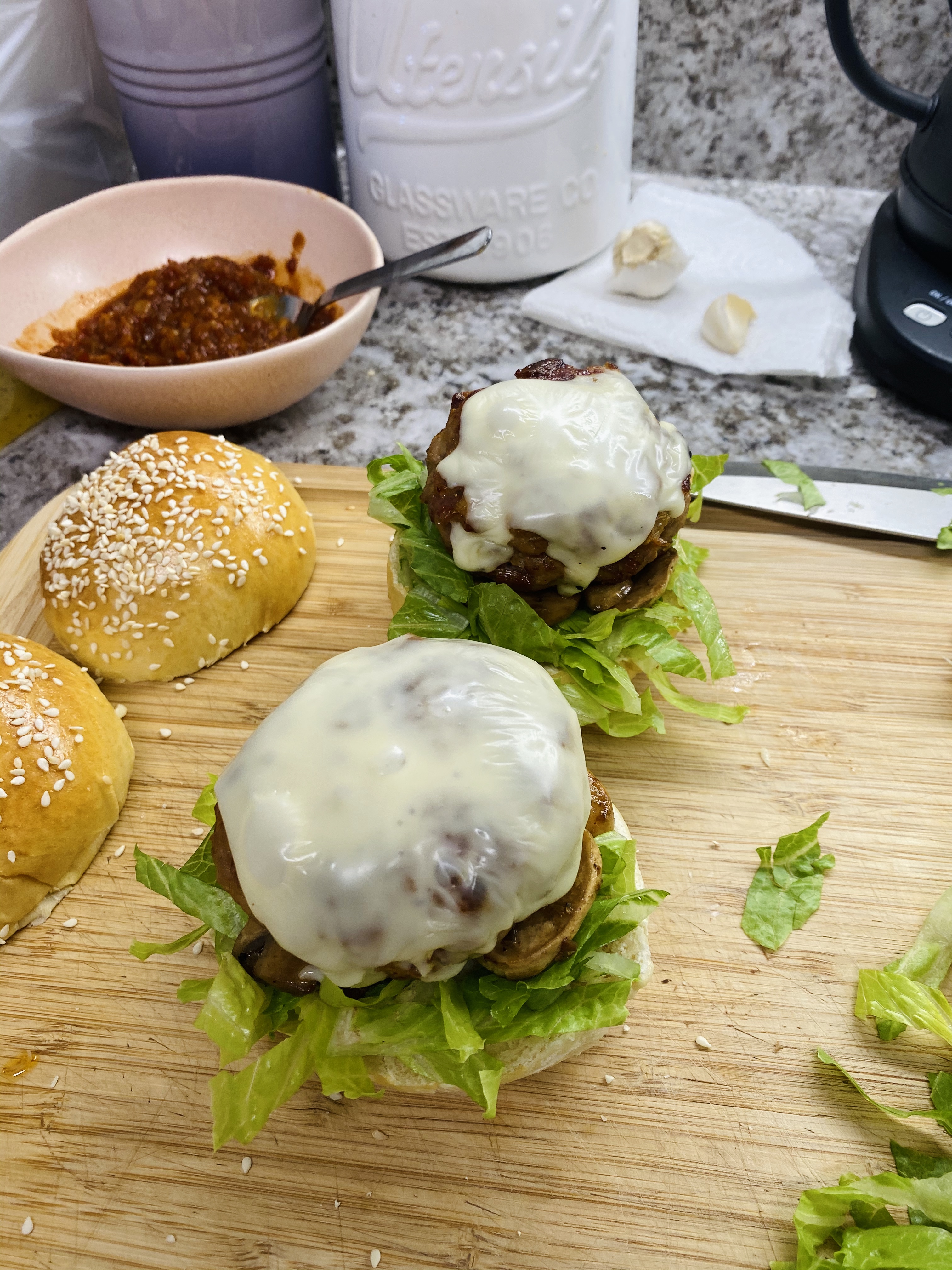 ➔ 最後把烤好的漢堡皮切開 → 放上生菜絲 → 加入炒好的蘑菇 → 放上醃燻豬肉漢堡肉並淋上BBQ醬 → 麵包皮蓋上去,手作BBQ豬肉漢堡完成了!🍔🍔(一口氣做了六個有點累!)