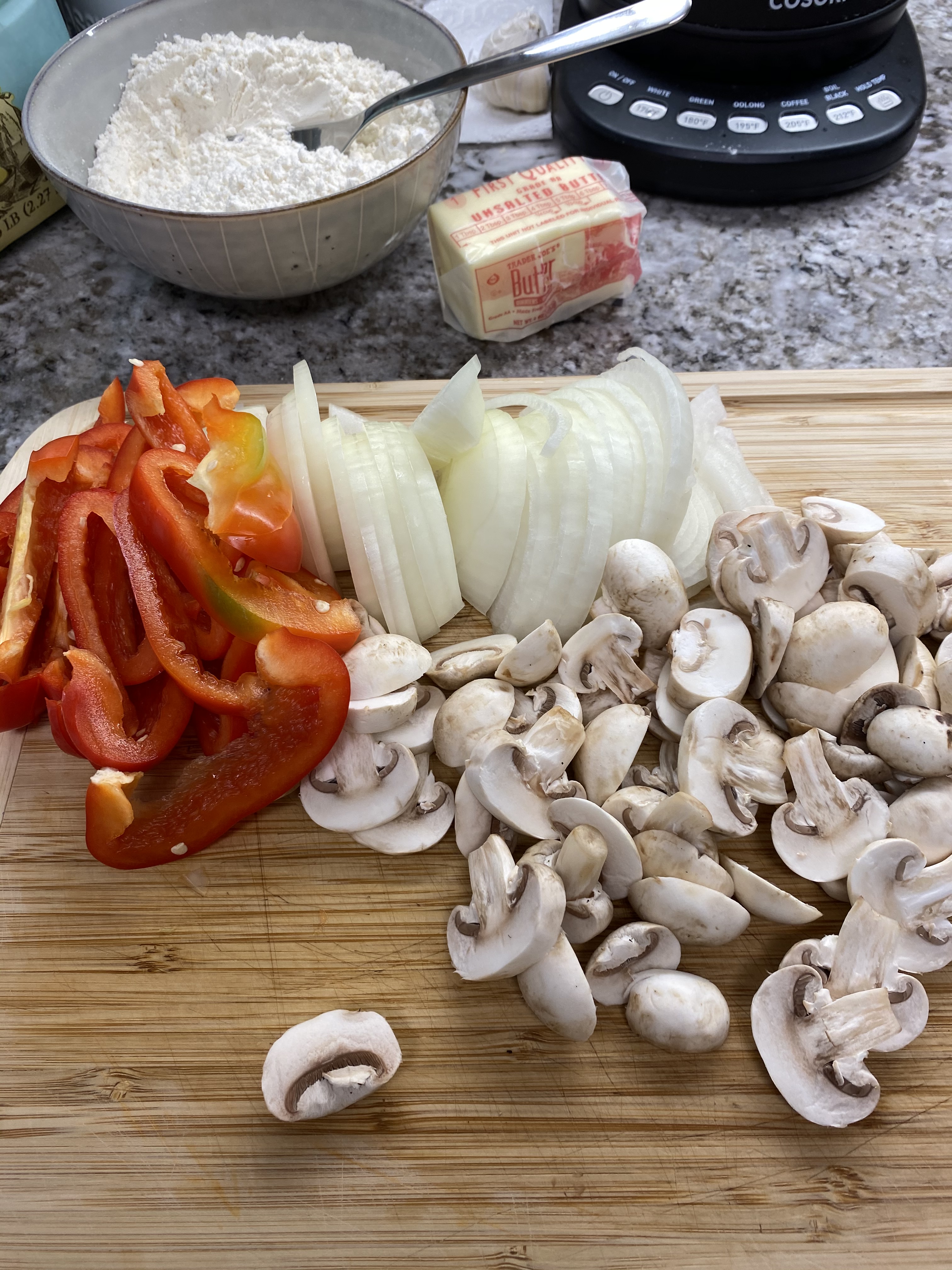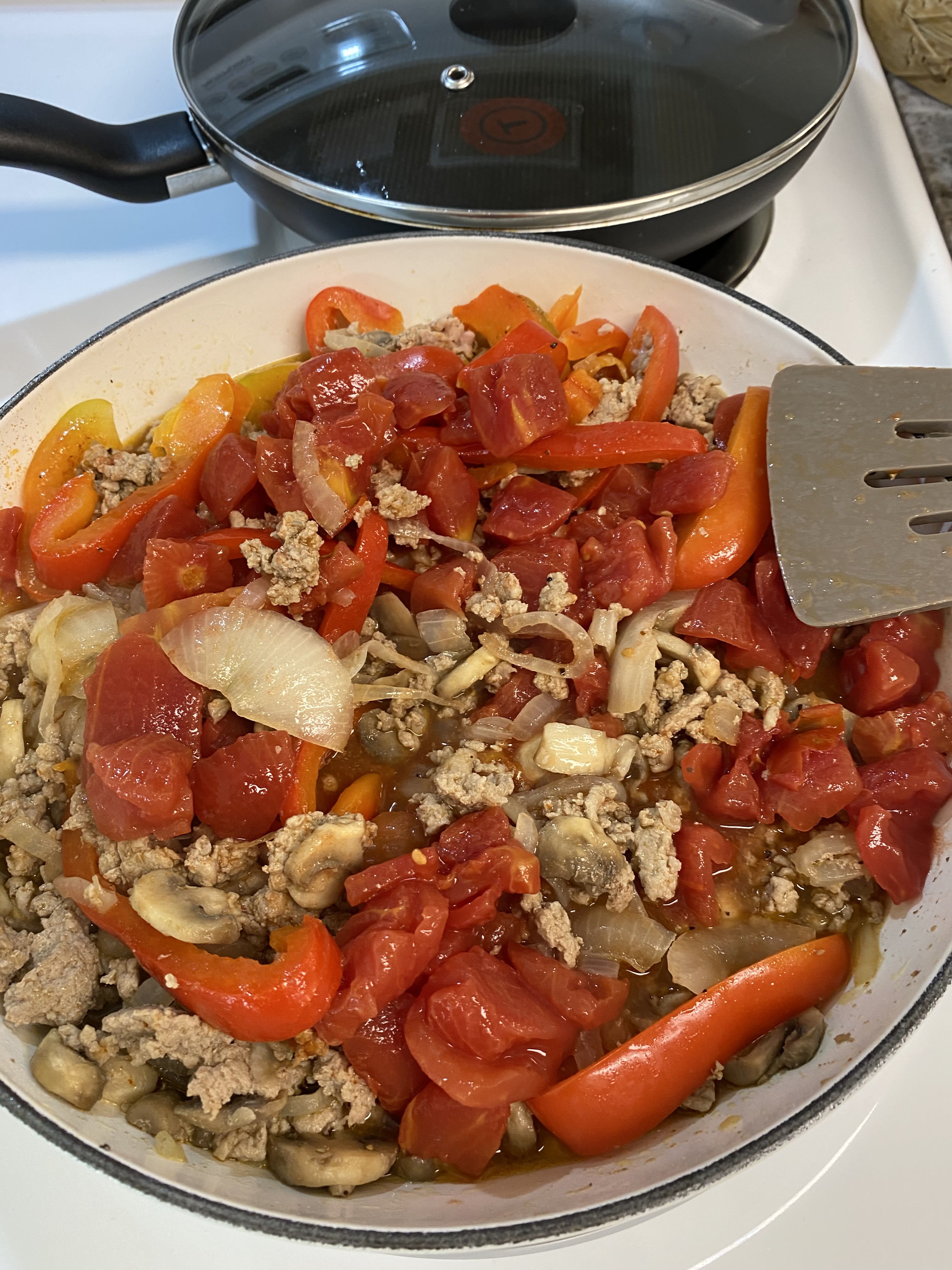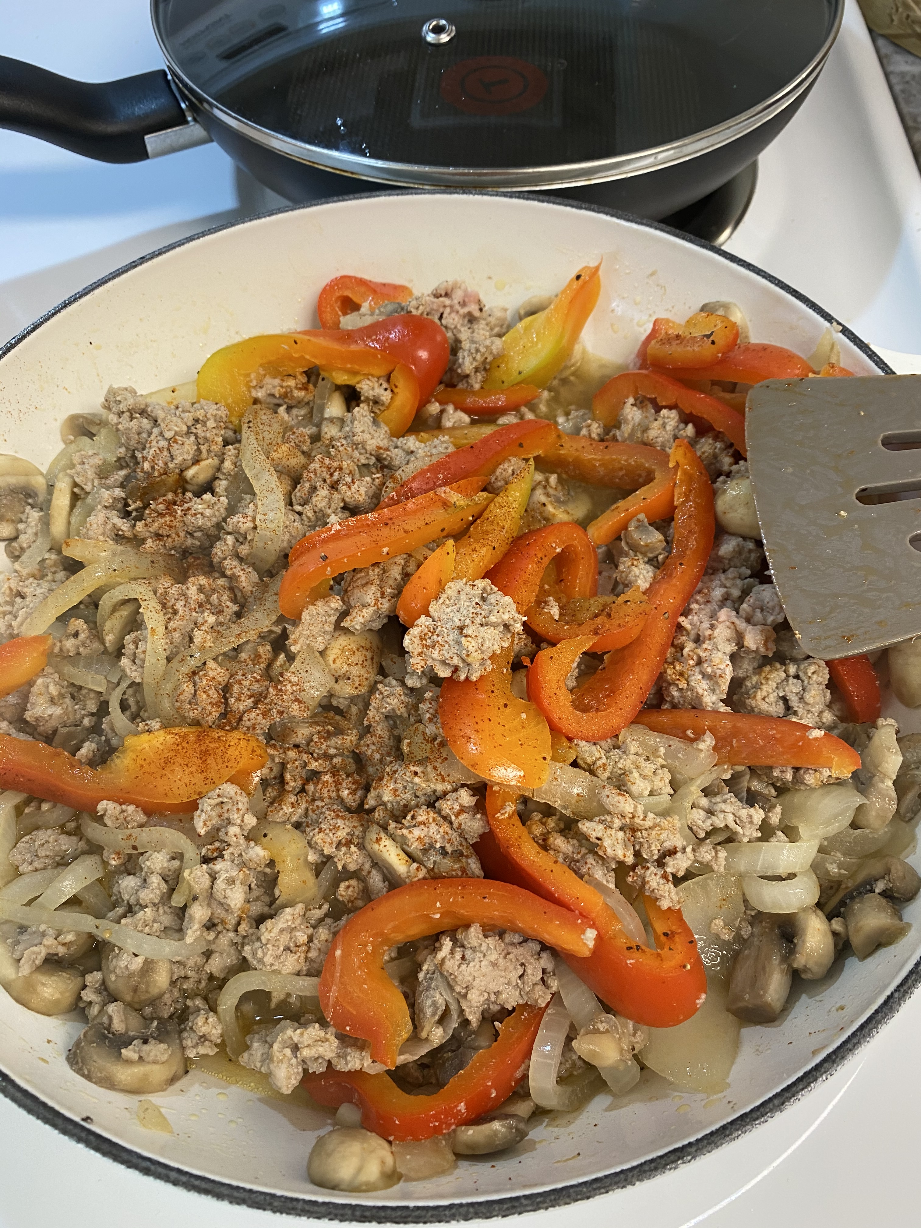 把洋蔥一顆、紅椒一顆、蘑菇一盒切片,在平底鍋中放入橄欖油,加入洋蔥、紅椒、蘑菇拌炒,接著放入火雞絞肉(盡量炒開炒碎來)。