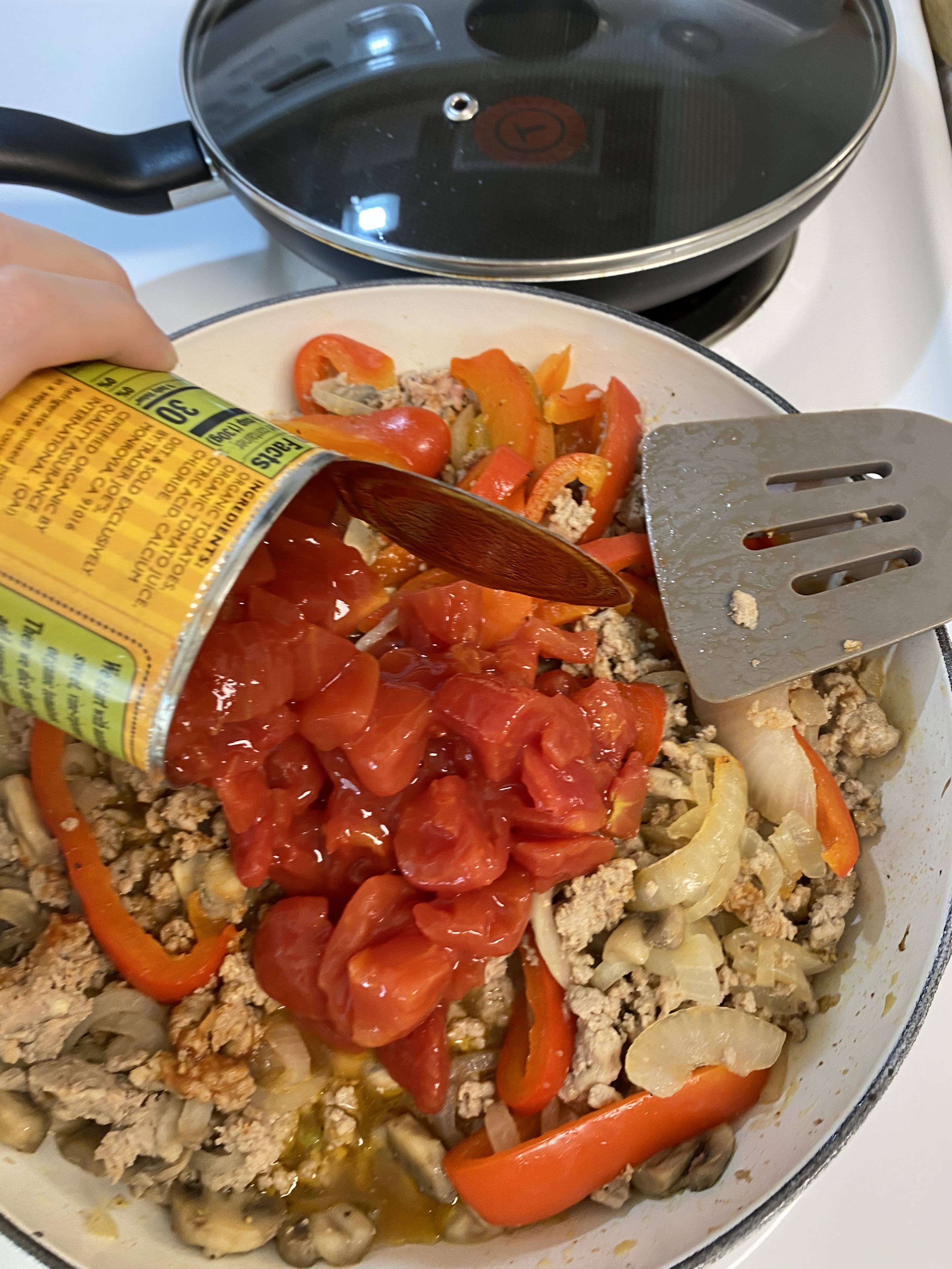 食材拌炒到7分熟左右,倒入熟成番茄丁罐頭(這種罐頭超好用,都切成了丁丁塊保留了口感很方便之餘也去了皮),並加入2~3匙番茄醬、1匙紅椒粉、黑胡椒、鹽調味,這時如果出水比較多我會倒掉一些水避免整體口感太濕潤。