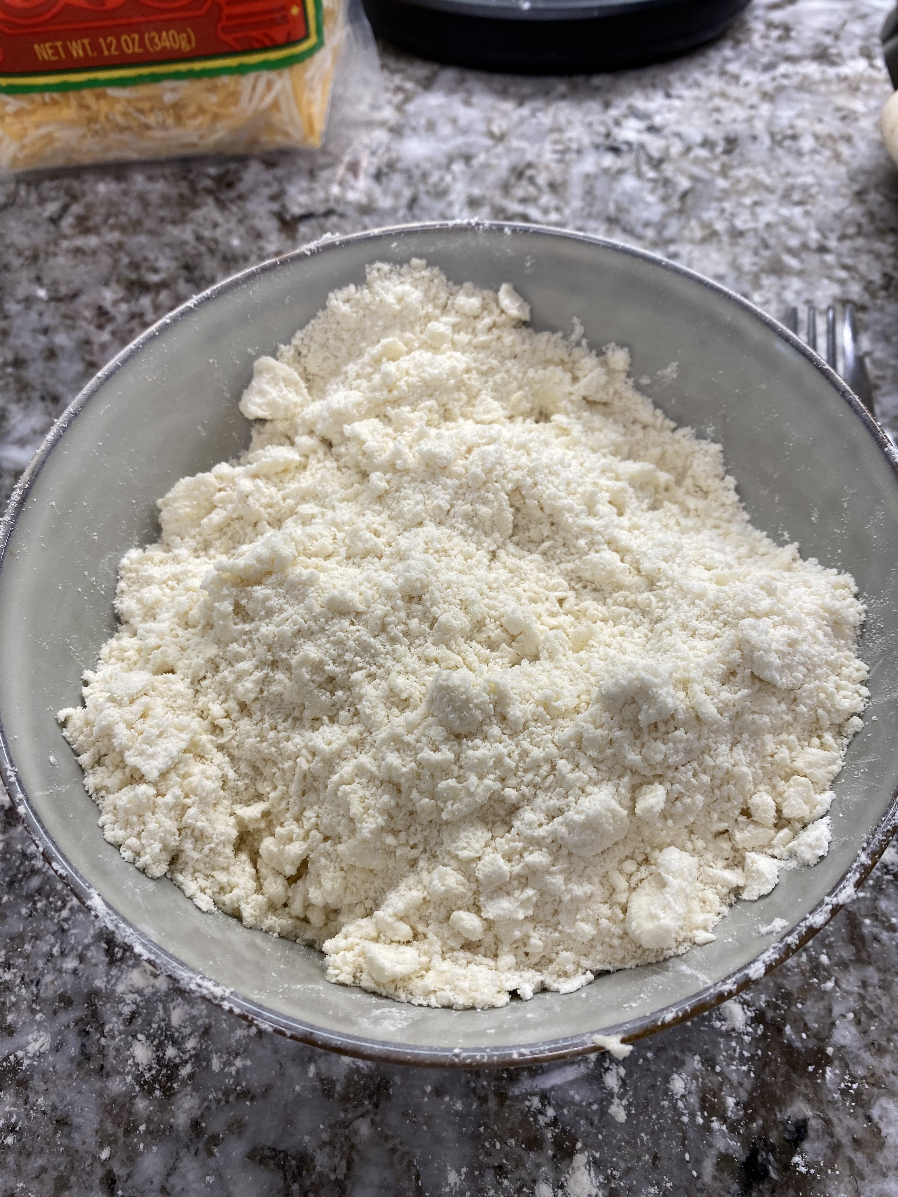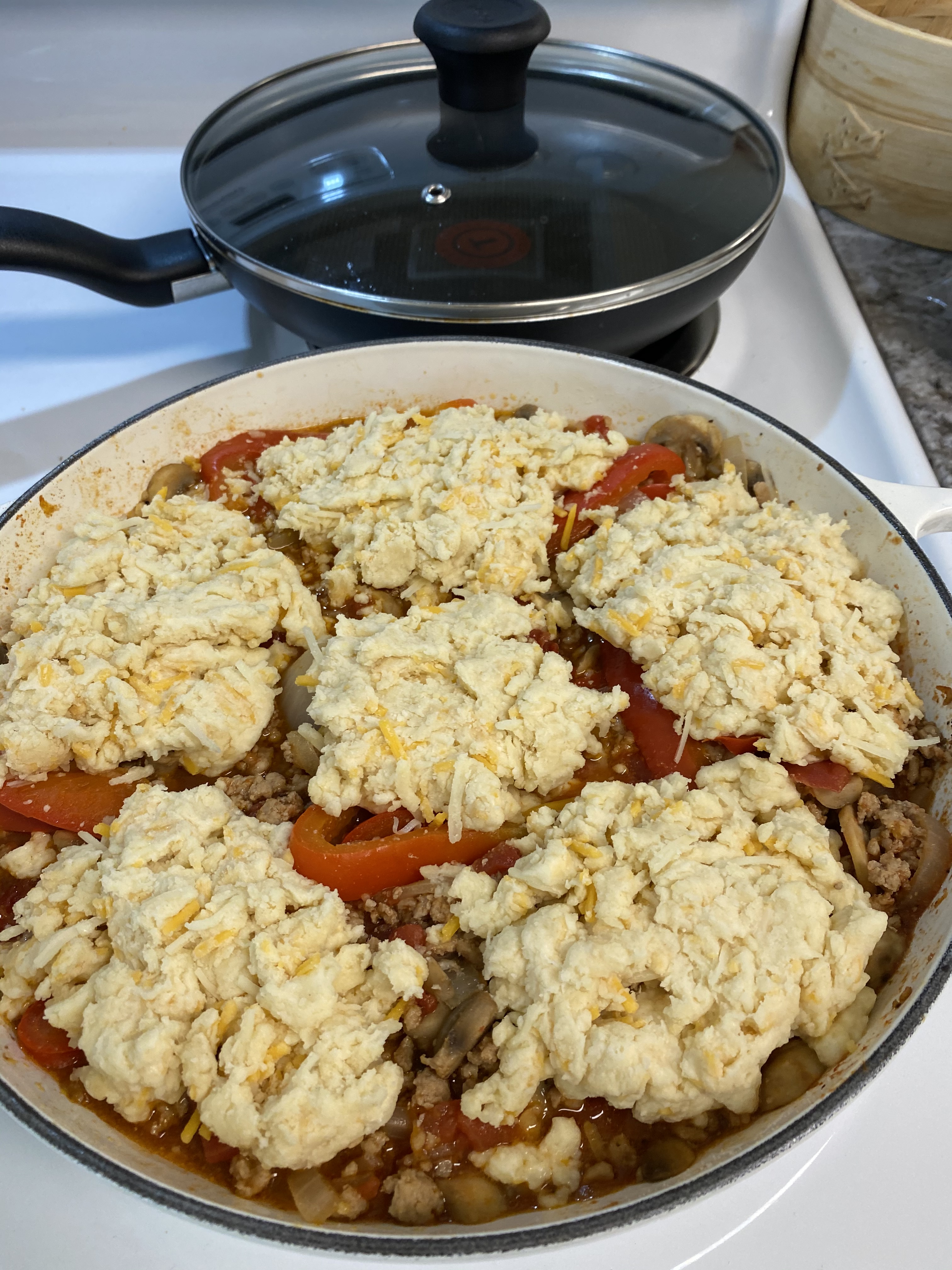 這時可以先熄火,另一邊開始製作比司吉,找一個大碗在碗中倒入一杯中筋麵粉、一匙鹽、1/2匙泡打粉、兩大把cheese左右、牛奶,把上述材料混合均勻後慢慢加入牛奶,牛奶的量不能太多,要讓麵糰呈現稠稠黏黏的(如下圖左3),抓成一坨一坨放在火雞絞肉上(每塊比司吉之間可以留一點點空隙),放入預熱425 ℉的烤箱,烤20分鐘。