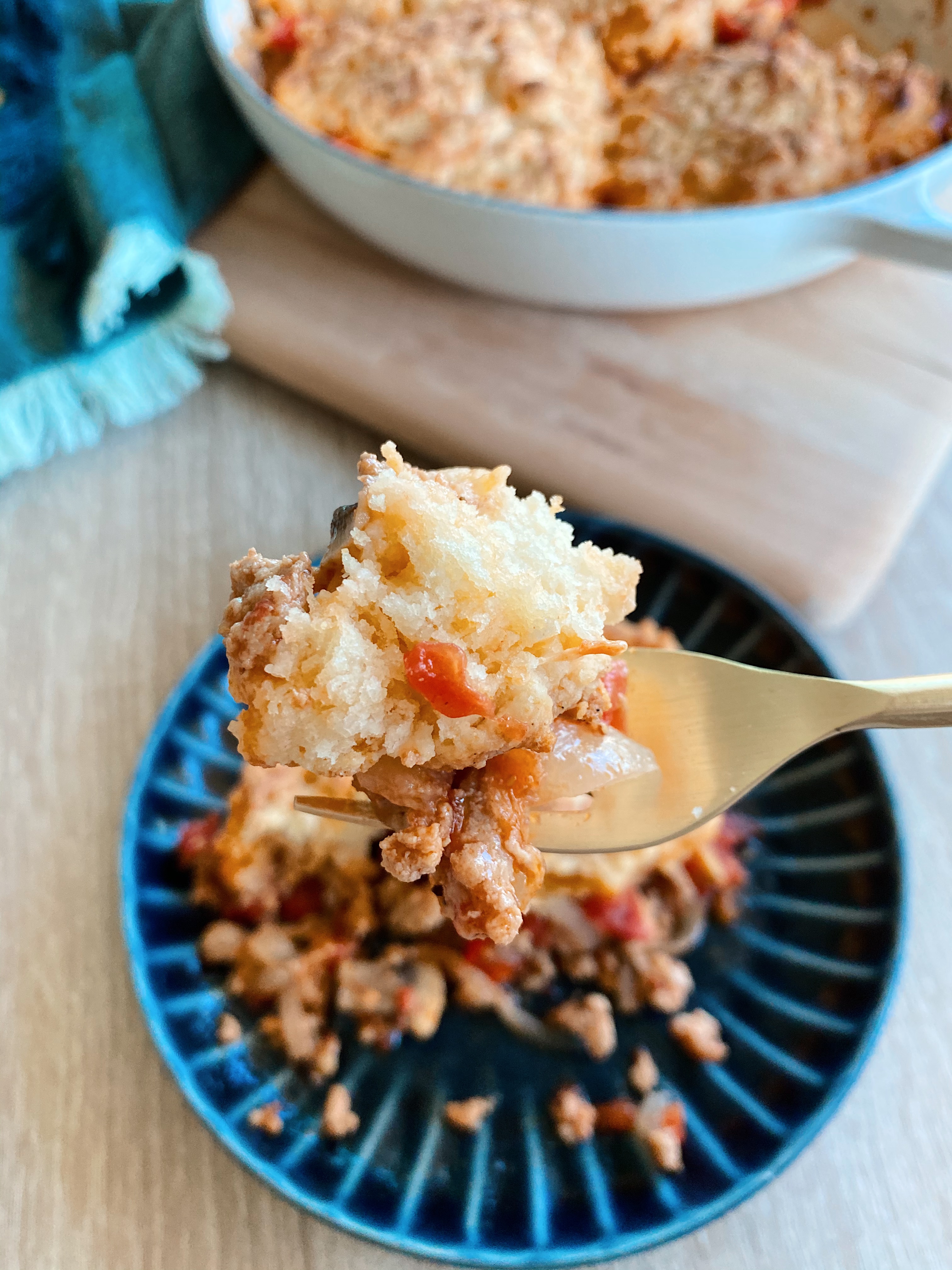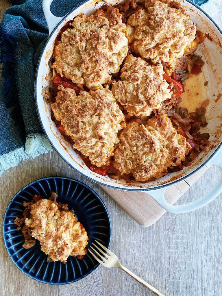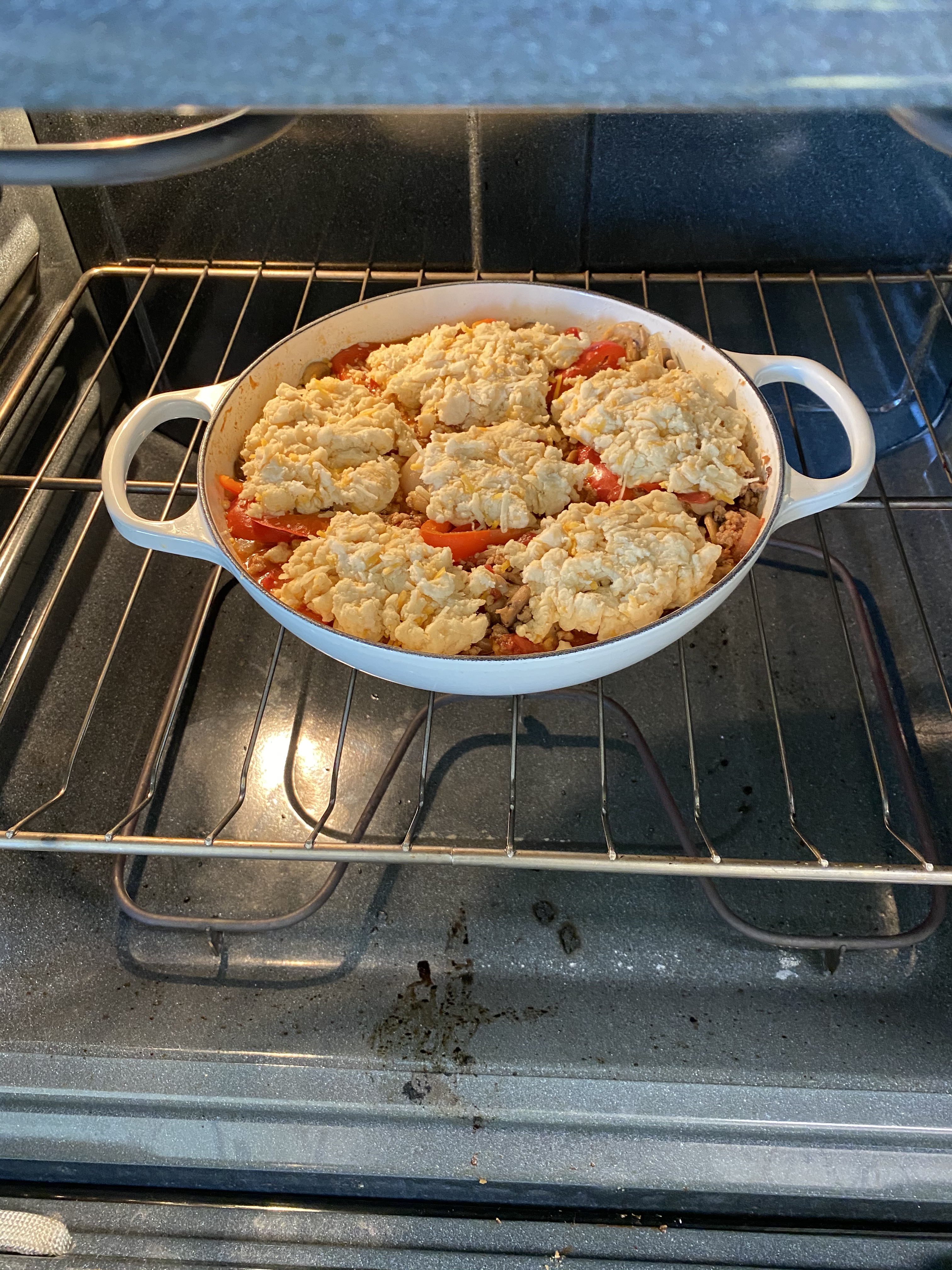 回到主題,🥘感恩節快到了,我想大多數的人可能會以烤雞做節慶主食,在我看過食譜後覺得這道『火雞肉派Turkey Skillet Pie 』也超級應景,我也由實作這道菜中發現原來比司吉是這樣製作的~底層炒的軟透的蔬菜和火雞肉完美融合在一起,上方放上混合了cheese和牛奶的比司吉,整體口感肉汁香濃口感鬆軟(看看文末的圖片),這真的是一道簡單、美味又快速的料理!