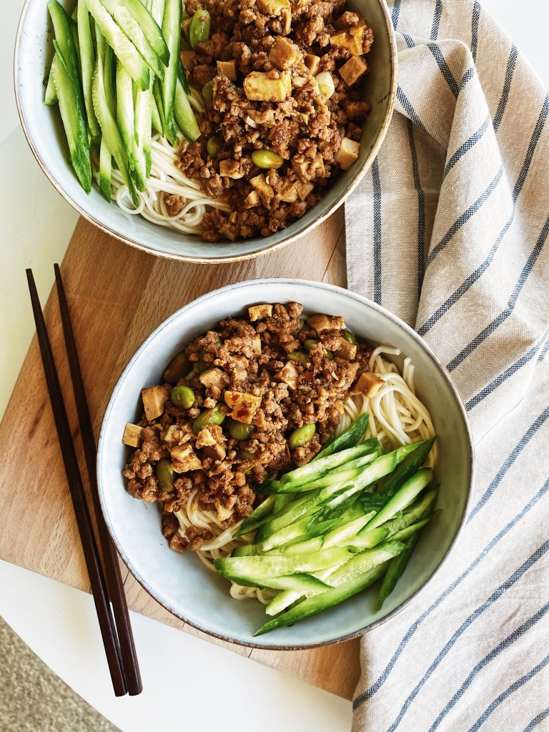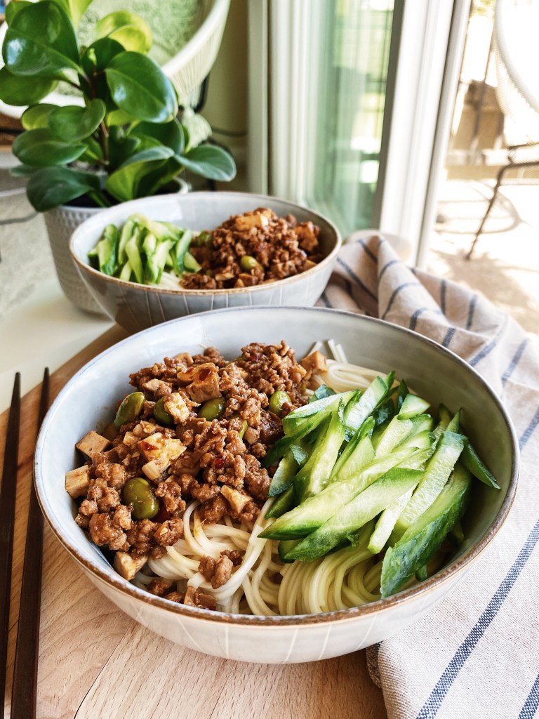 很方便的是在Trader Joe’s就能買到主要食材 : 毛豆、豬絞肉、小黃瓜,這次我用詹姆士教的比例,甜麵醬1:豆瓣醬2,甜麵醬我一樣用海鮮醬代替,(海鮮醬又再次派上用場了👍🏻)花個1小時不到就能完成這道記憶中的味道了!這鍋炸醬不只拌麵、配飯好吃和其他菜炒在一起都百搭!
