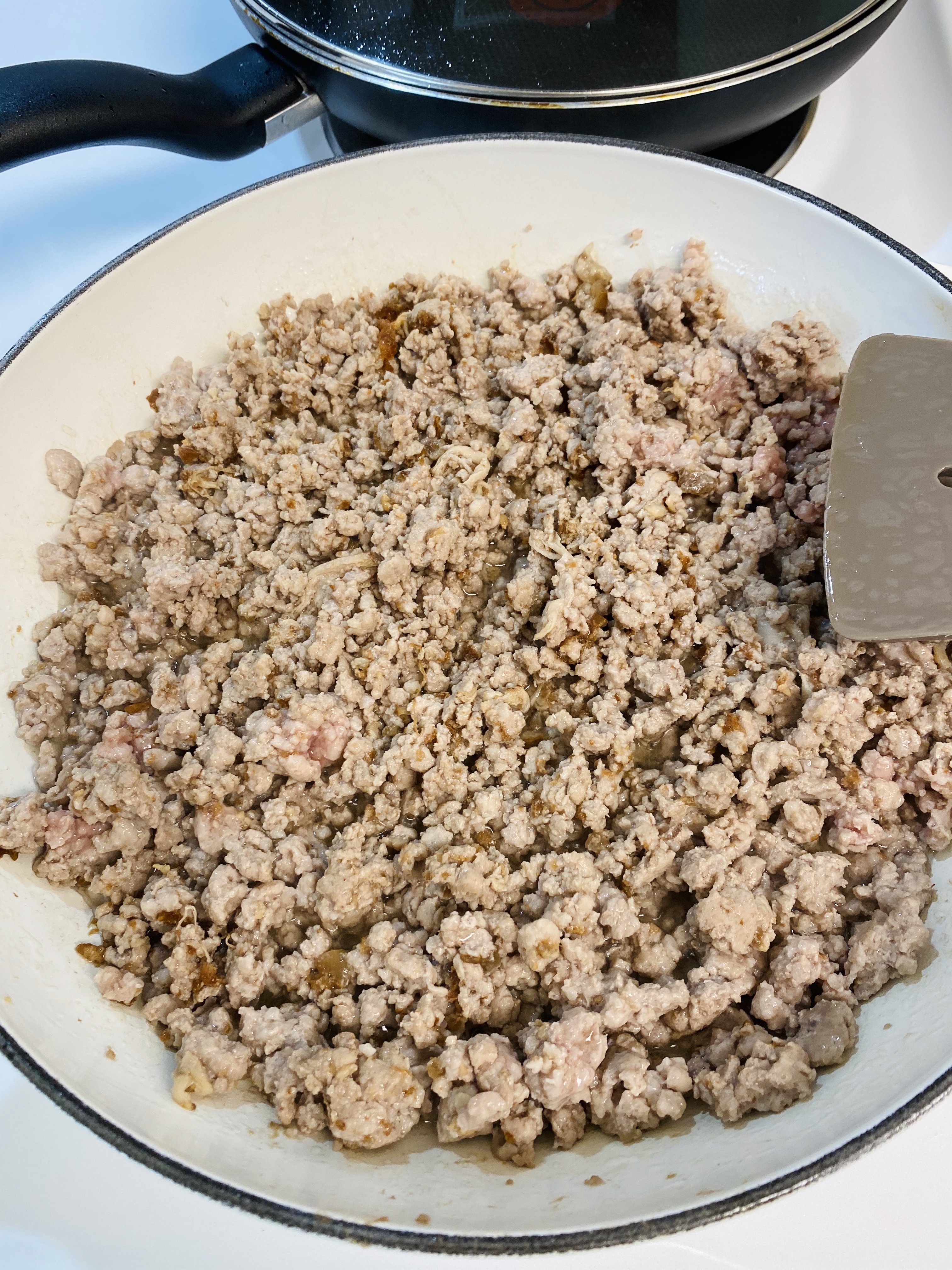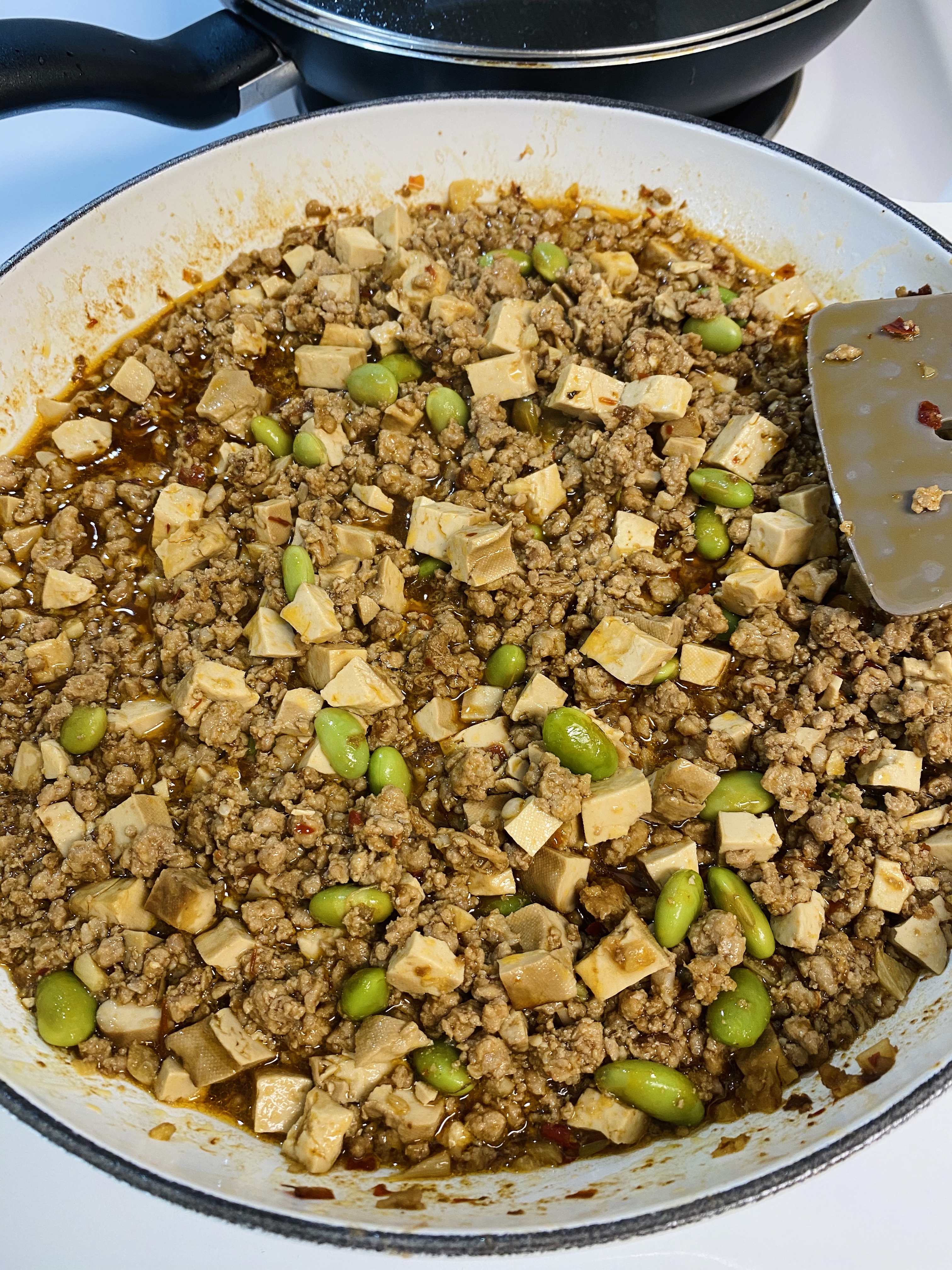 豬絞肉450g放入油鍋中炒細、炒上色,放入切成丁丁的豆干拌炒(水分盡量炒出來),再加入一匙海鮮醬和兩匙豆瓣醬炒香炒均勻。