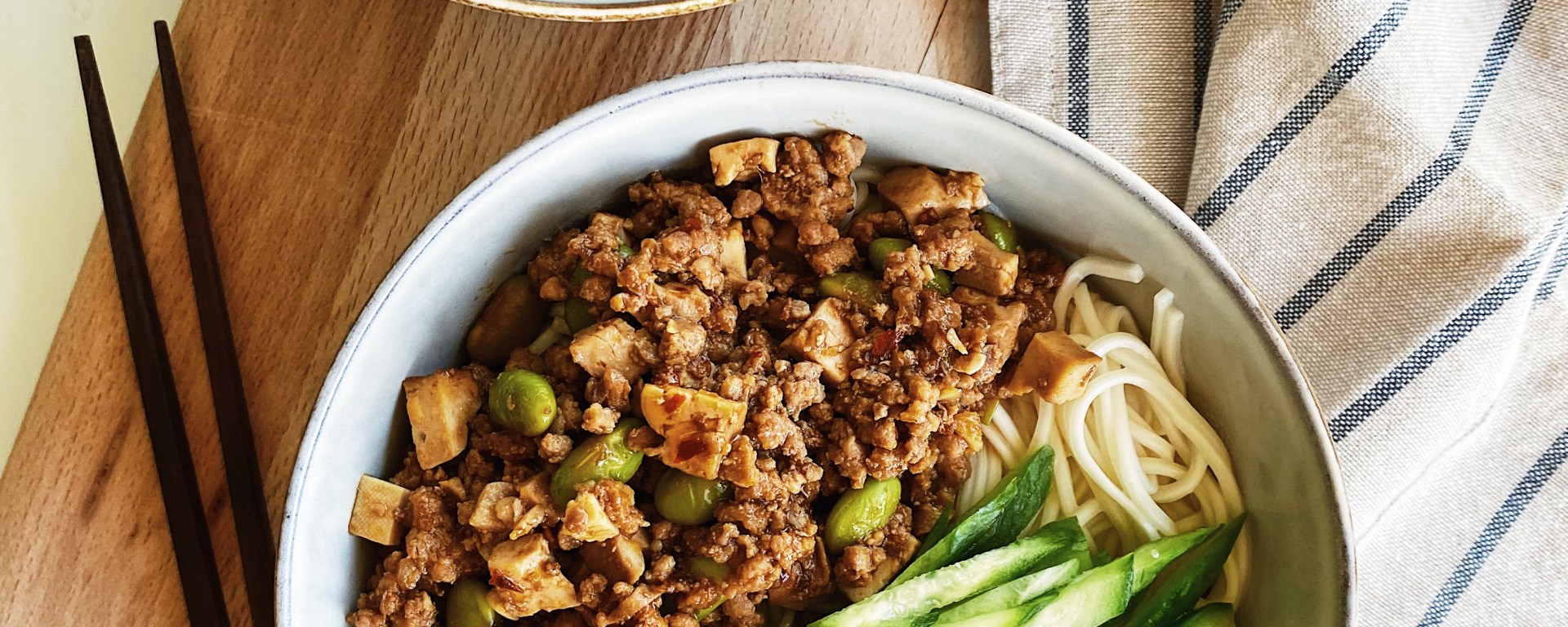 → 煮好後放上一勺炸醬、一坨小黃瓜絲,超簡單的自製家常炸醬麵完成了!(我喜歡把炸醬和麵條都和均勻後再吃),麵條配上滷過的肉末、豆乾、毛豆,再夾一口爽脆的小黃瓜(豆芽也可以),這碗炸醬麵太滿足了~