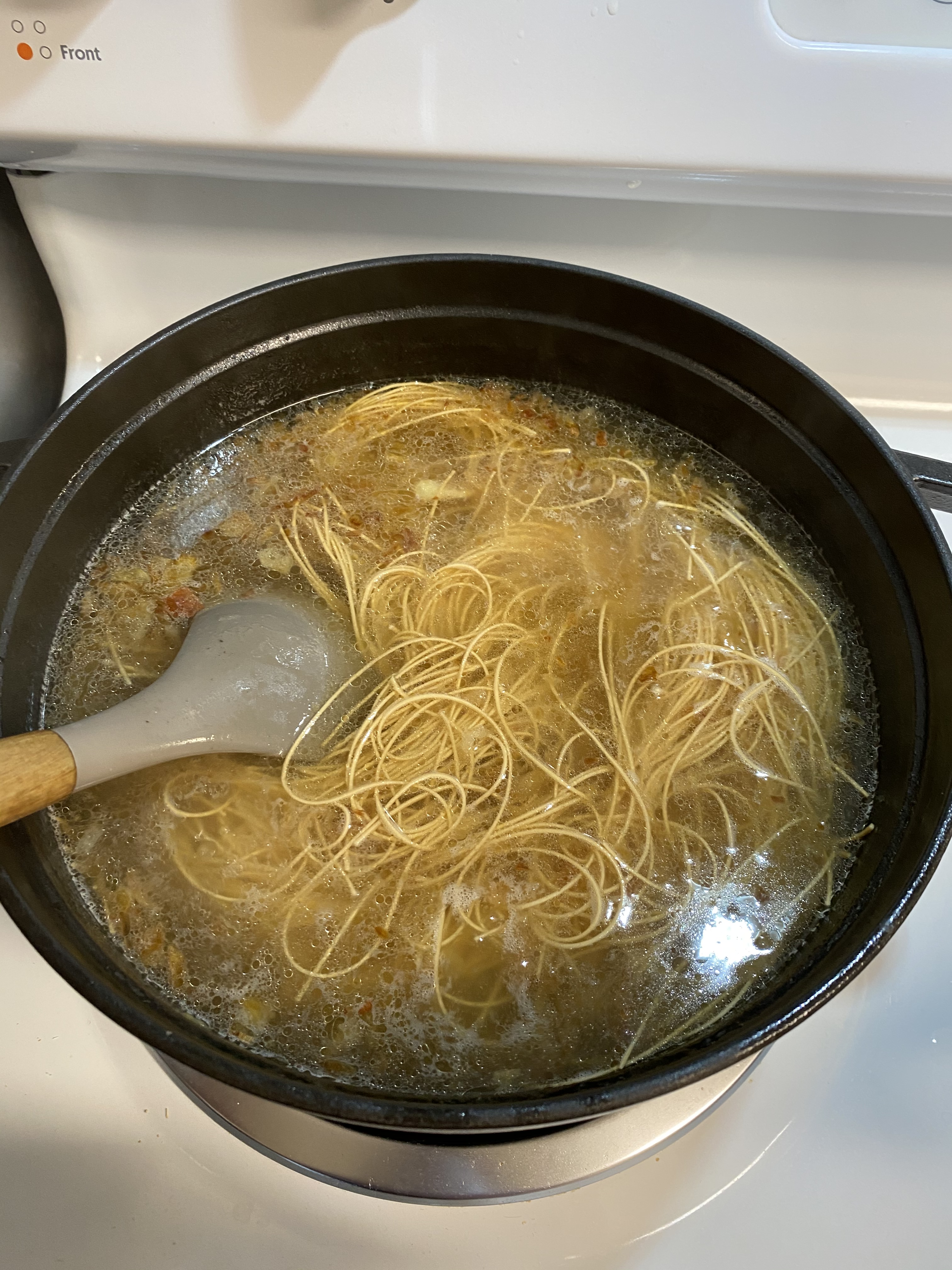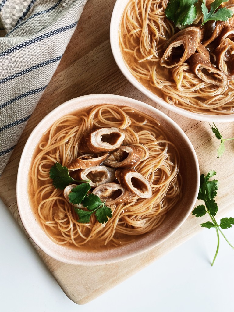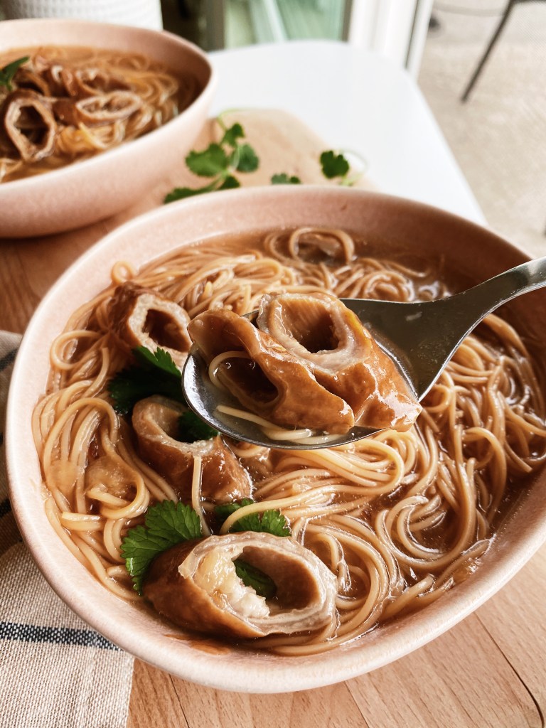 從尋覓食材到人生第一次清洗豬內臟,辛苦是值得的!自己滷的大腸很乾淨,沒有什麼腥味軟嫩適中,燉了兩小時筷子都可以輕鬆穿透👌🏻!搭配用豬骨和白蘿蔔、Trader Joe’s 的fried onions、柴魚片熬燉煮1小時的高湯(這步驟很重要)來煮紅麵線,端出來的這兩碗麵線真的是滿滿的感動!味道很正宗,像是外面賣的一樣,吃之前再淋上一點點烏醋或是蒜泥~這次自己在家煮了一大鍋像小吃攤一樣😂(阿助麵線),隔天當早餐吃也很適合!這個冬天大家可以在家試看看,建議直接買滷好的大腸就可以省去大半的時間了🧡。