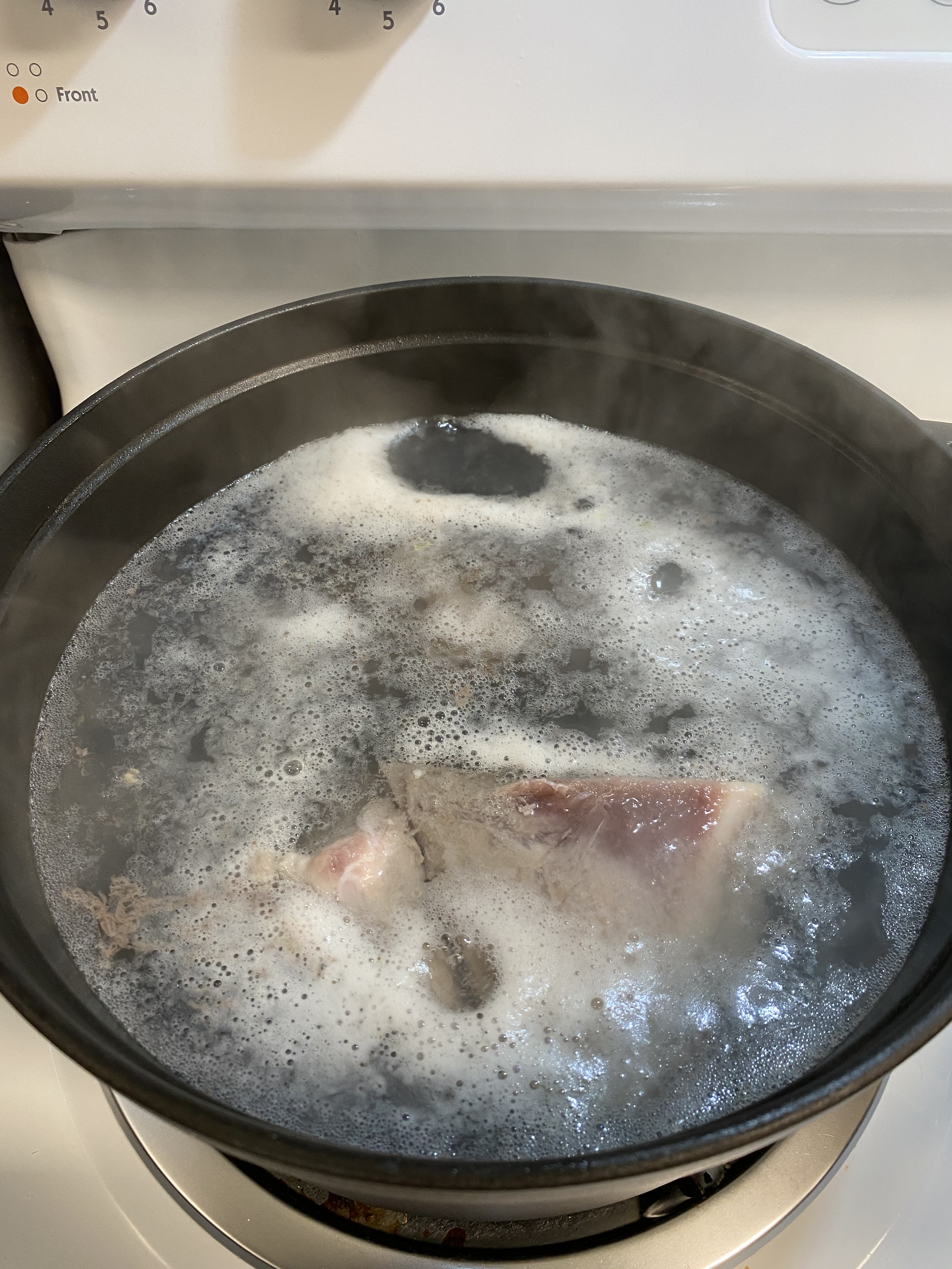 在冷水中將豬大骨少、少許米酒放入,川燙5分鐘,水滾後撈起用水再次沖洗。在鍋中再次到入水並煮滾,水開後加入剛剛川燙洗淨的大骨、切塊白蘿蔔、少許鹽和米酒,小火燉煮1小時。