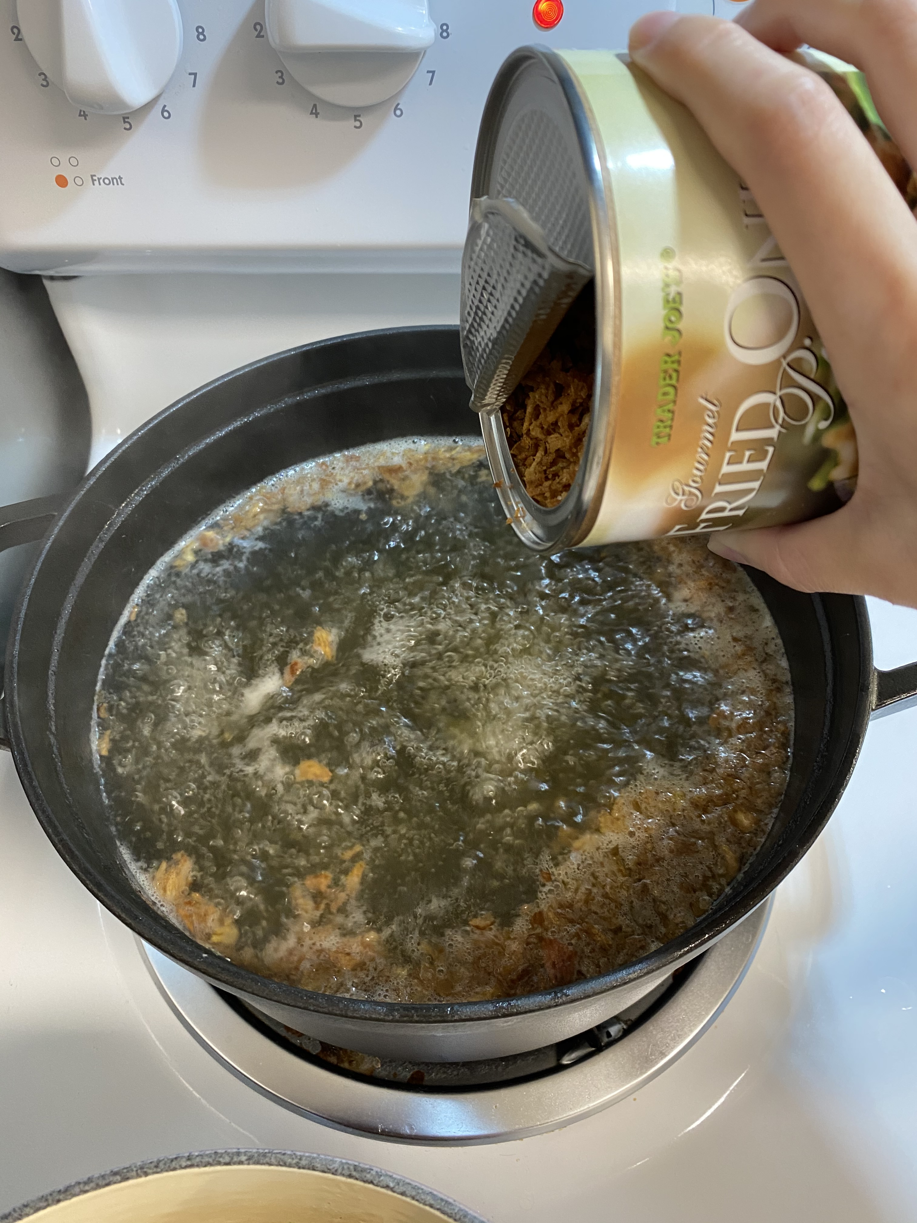 在煮滾的高湯中倒入fried onions,並放入紅麵線、柴魚片,這時可以開始調味,把醬油、砂糖、白胡椒都倒入調味(可以用湯匙試一下味道,這罐fried onions有點鹹味,所以我醬油就加少一些)。