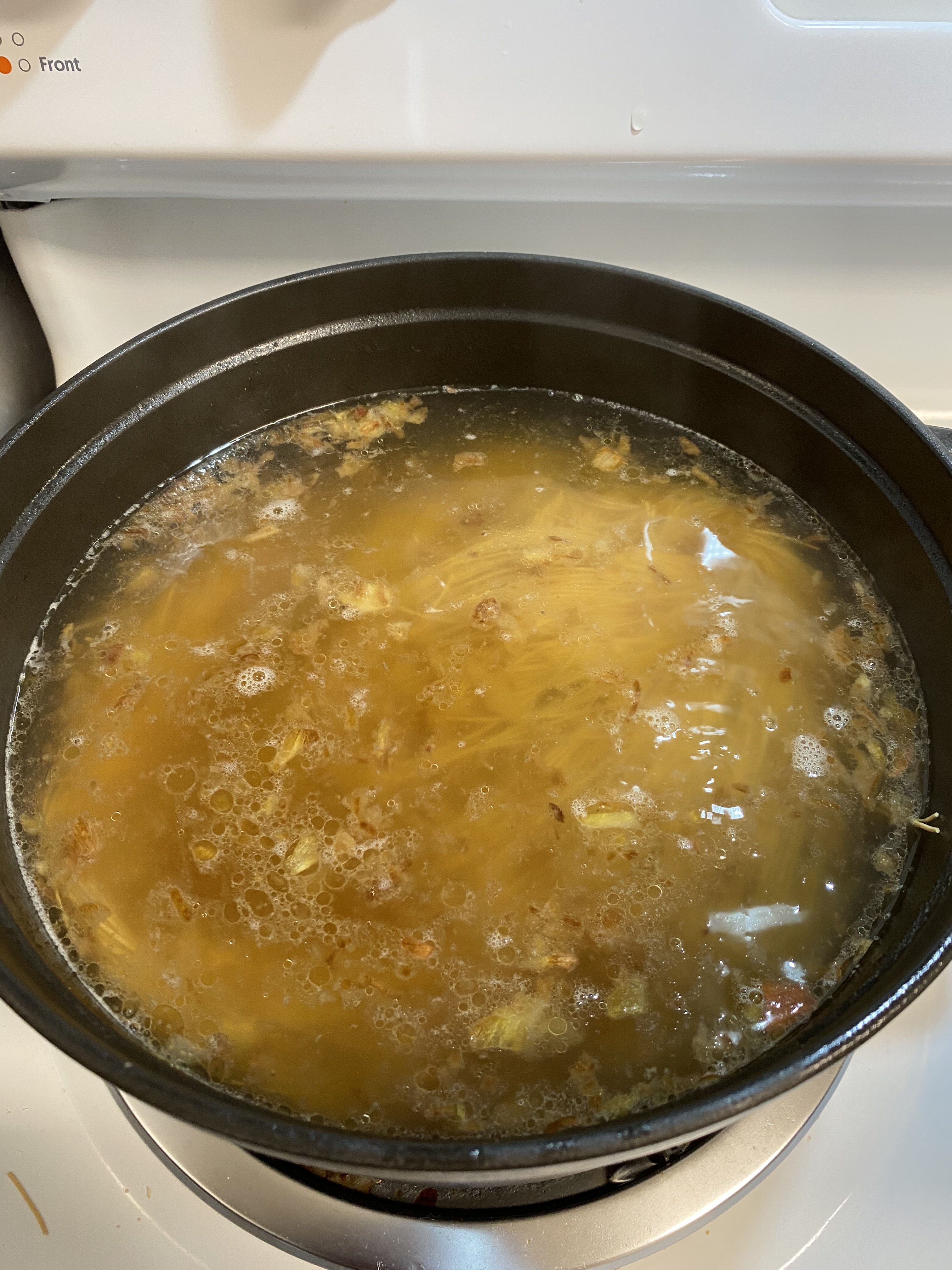 另一邊熱平底鍋,倒入3匙橄欖油,並加入洋蔥、蔥段、拍過的蒜粒,用中火炒至金黃,並倒入豬骨白蘿蔔高湯中,用中小火煮10分鐘,10分鐘後拿濾網把大骨、白蘿蔔、蔥、蒜都濾掉取出,這就是煮麵線用的高湯。