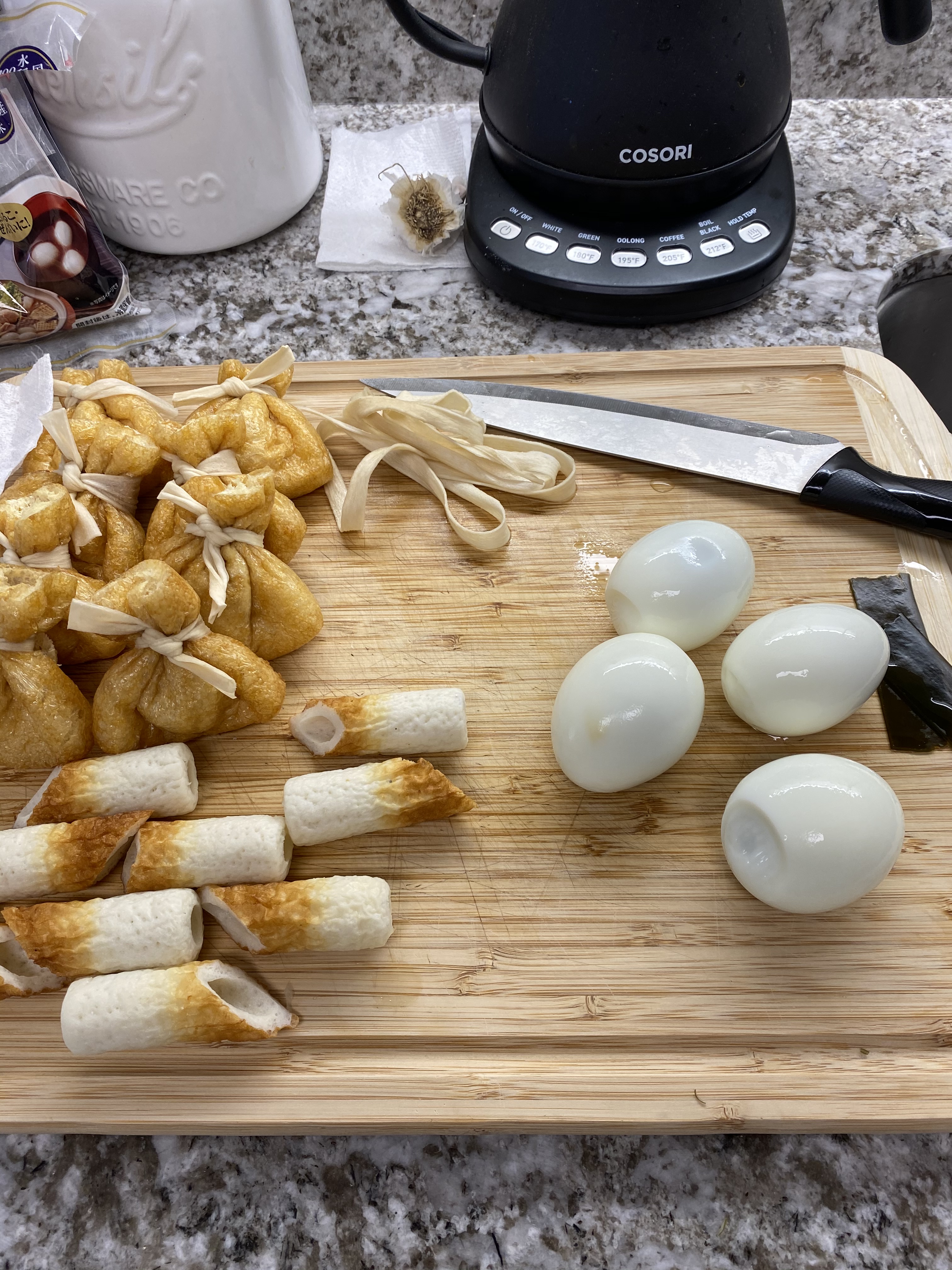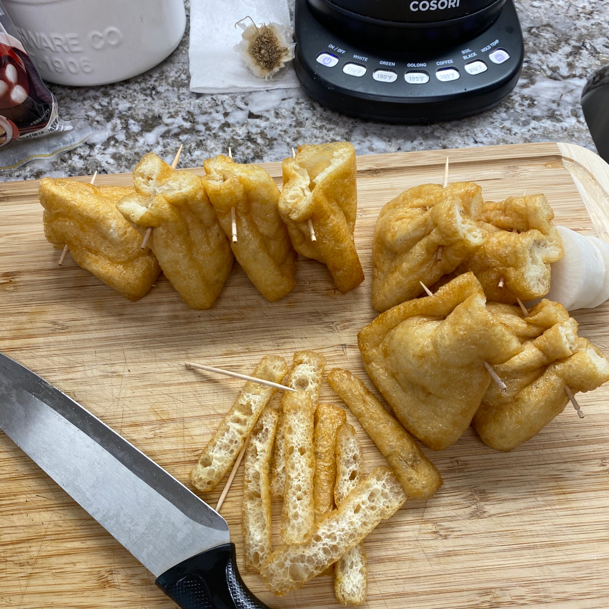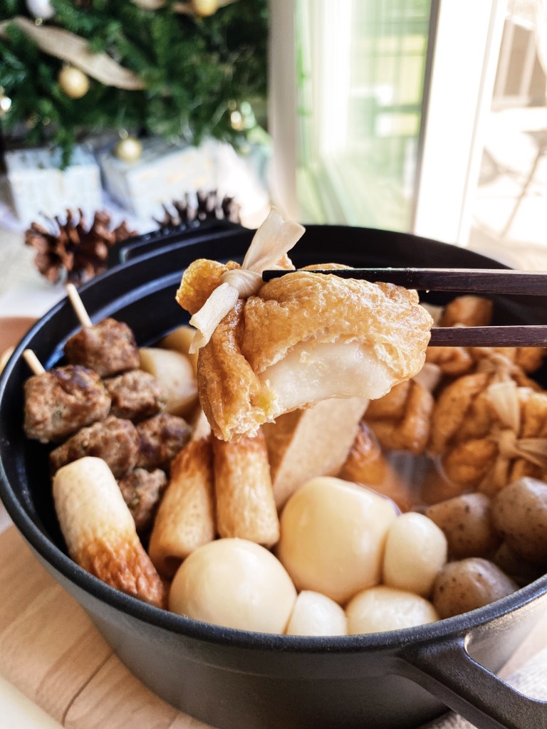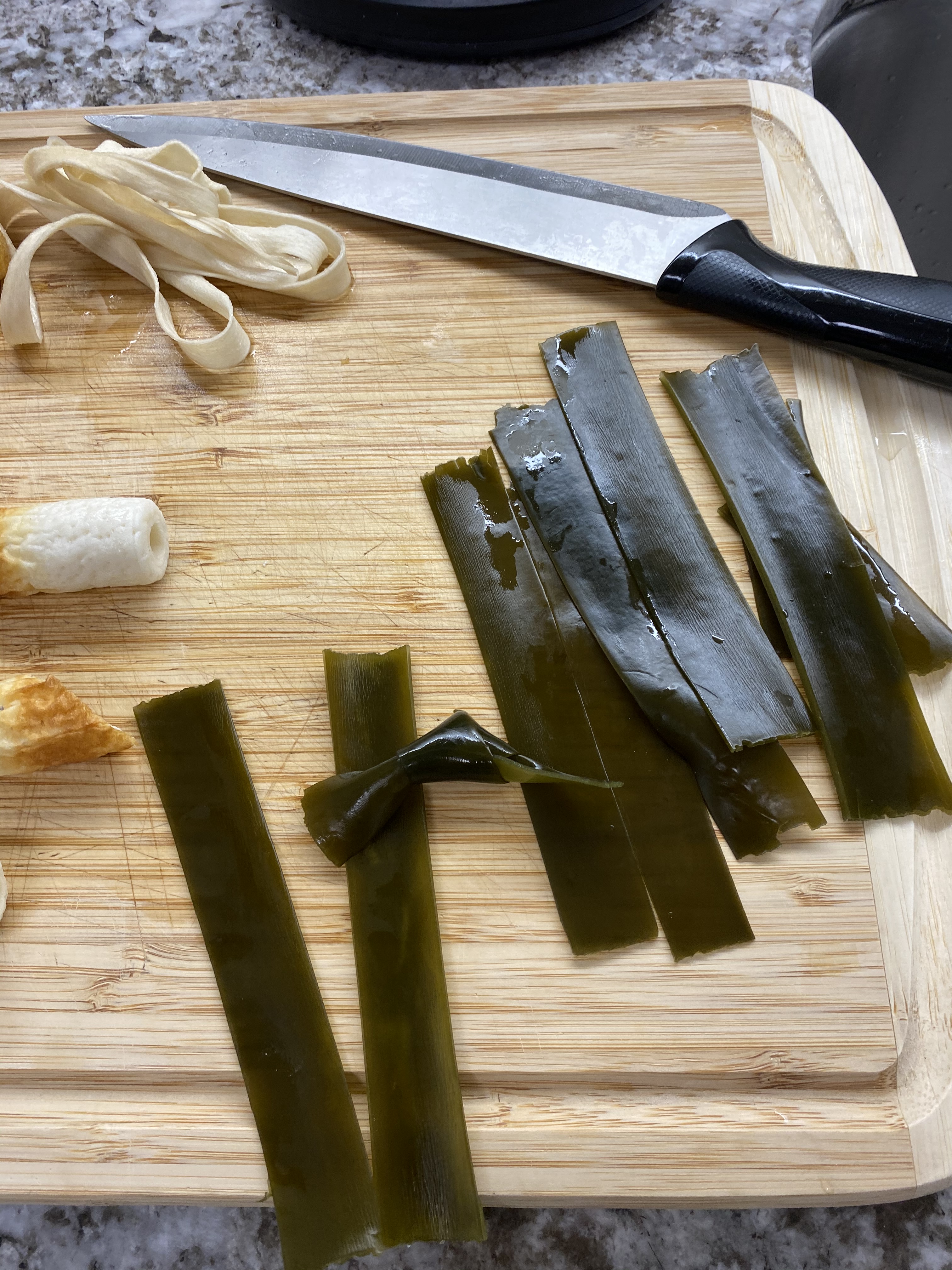 要煮出美味的關東煮,湯頭應該是最關鍵的步驟,有了昆布和柴魚這兩樣就可以在家輕鬆做出美味的高湯了!這次比較特別的是自己做了超可愛的日式小福袋❤️,裡面有包一顆小麻糬哦~做小福袋的豆皮、小麻糬和捆福袋的「干瓢條」(有沒有人知道這到底是什麼植物嗎),跑了一趟日本超市終於把這些食材都買齊了!