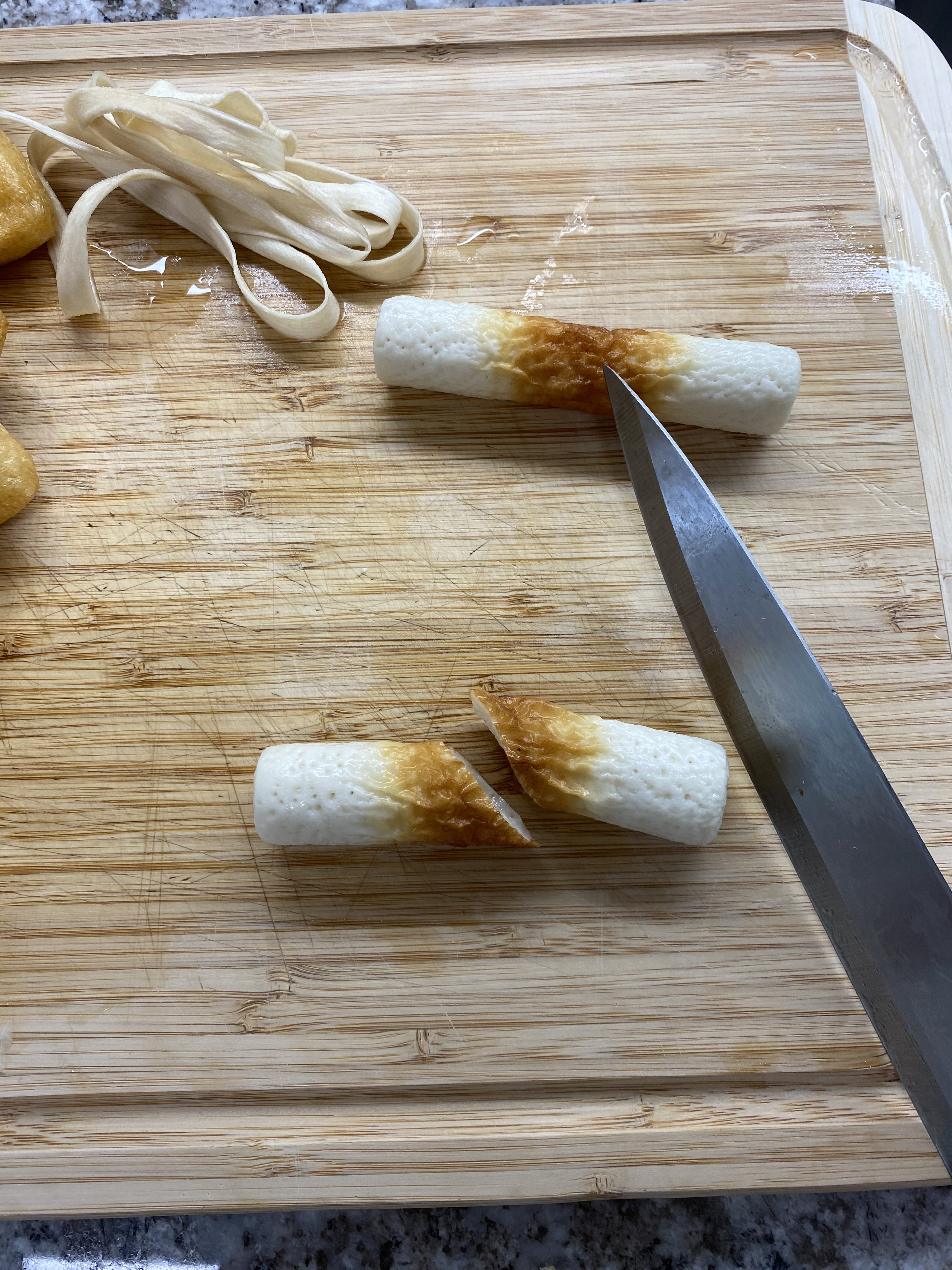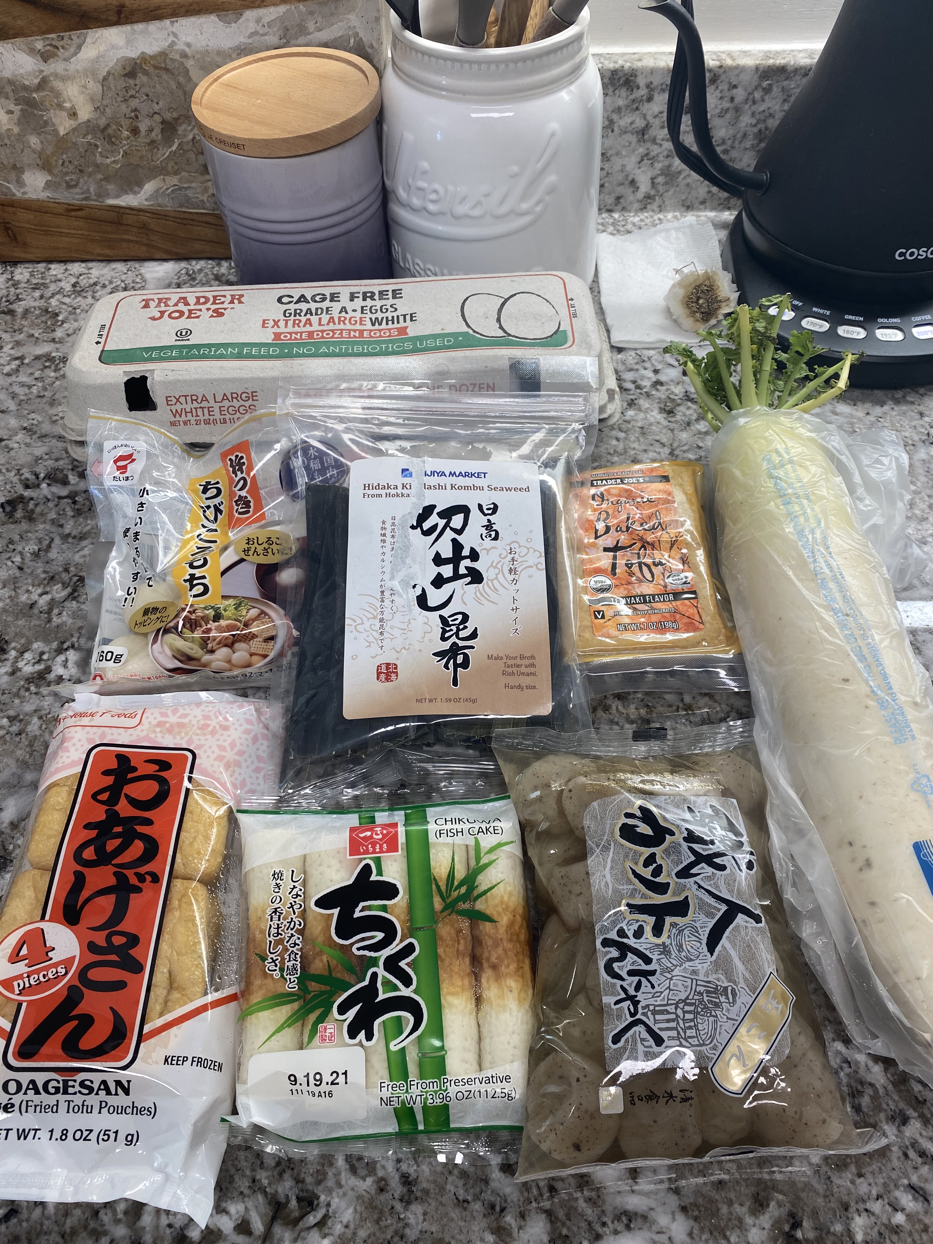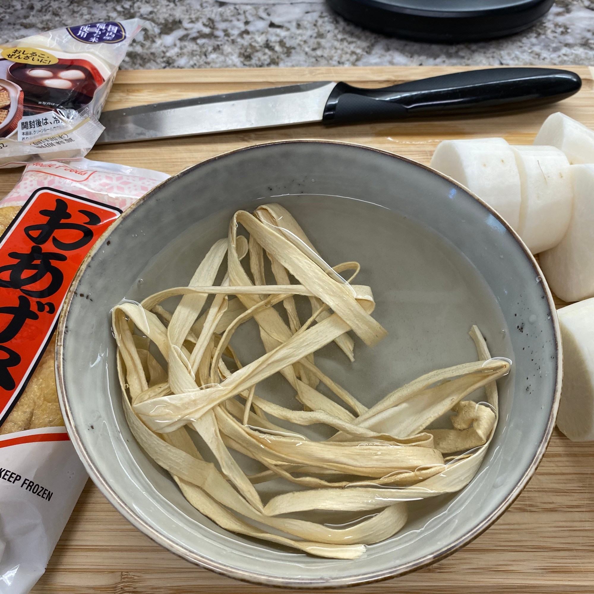 要煮出美味的關東煮,湯頭應該是最關鍵的步驟,有了昆布和柴魚這兩樣就可以在家輕鬆做出美味的高湯了!這次比較特別的是自己做了超可愛的日式小福袋❤️,裡面有包一顆小麻糬哦~做小福袋的豆皮、小麻糬和捆福袋的「干瓢條」(有沒有人知道這到底是什麼植物嗎),跑了一趟日本超市終於把這些食材都買齊了!