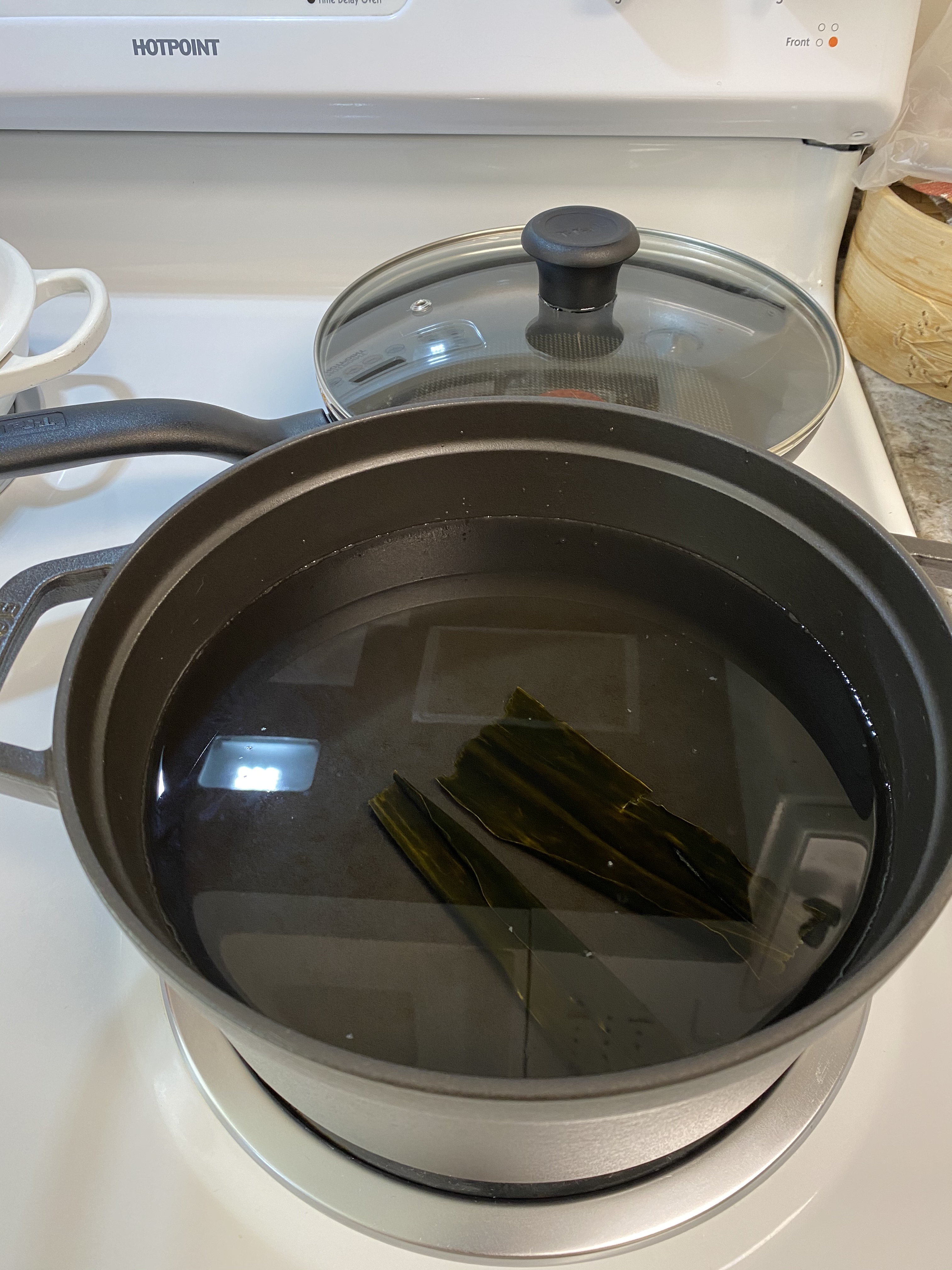 將所需材料備齊,在鑄鐵鍋中倒入冷水並放入兩片昆布,中火煮10~15分鐘,在煮滾之前關火。加入兩小包柴魚,並再次開中小火,煮2分鐘後將柴魚片撈出。倒入醬油、砂糖、鹽、烹大師做調味。