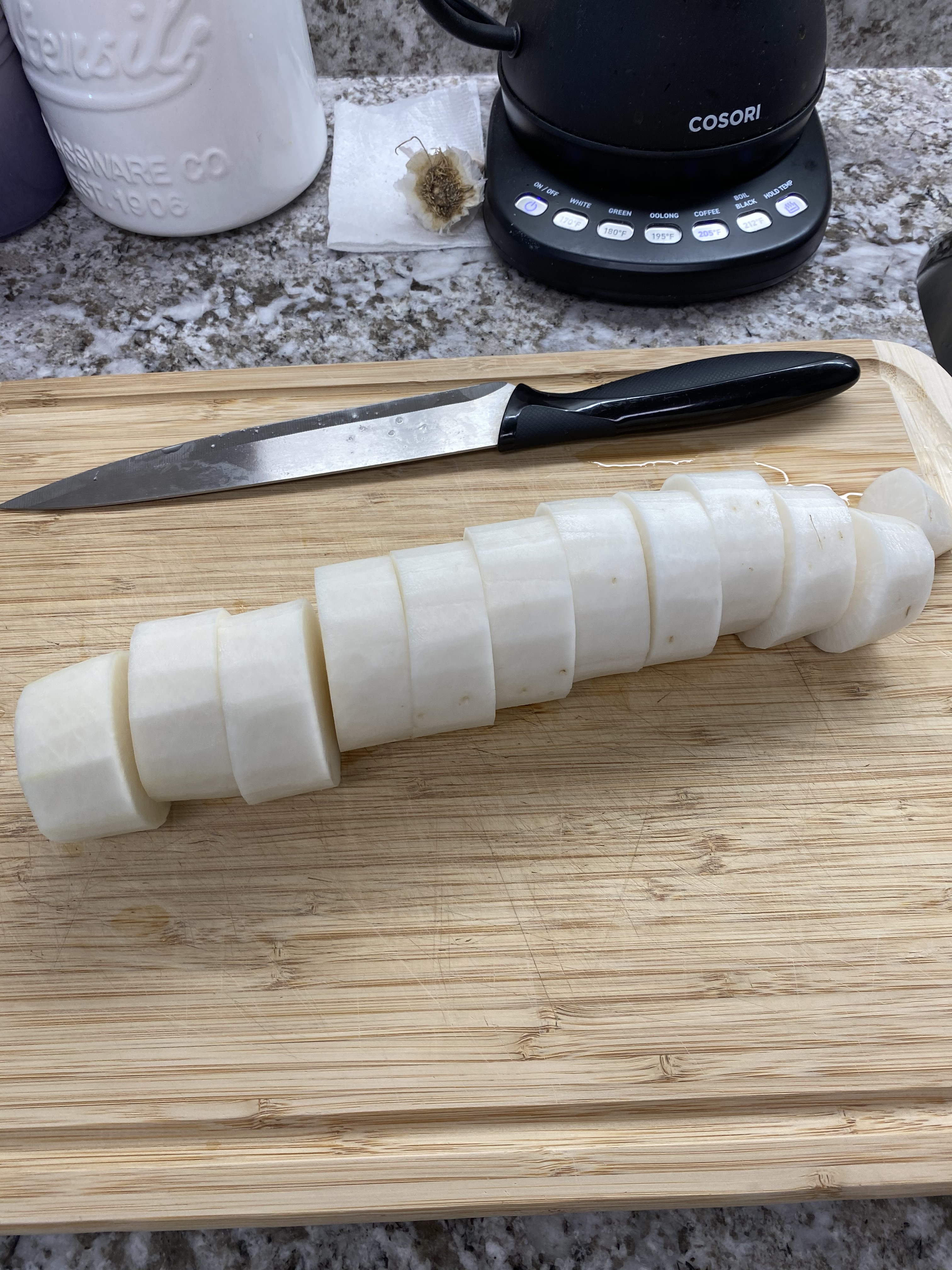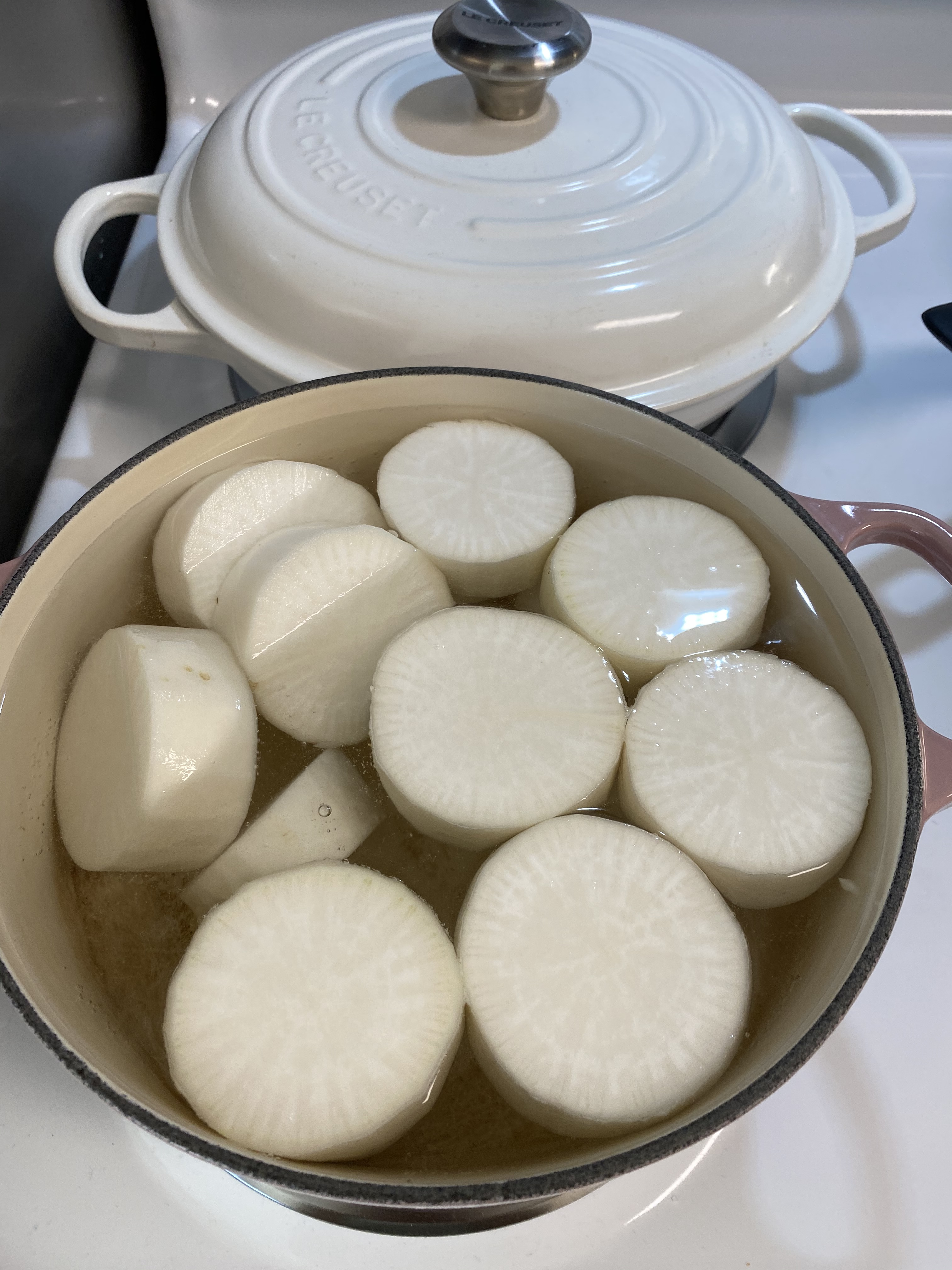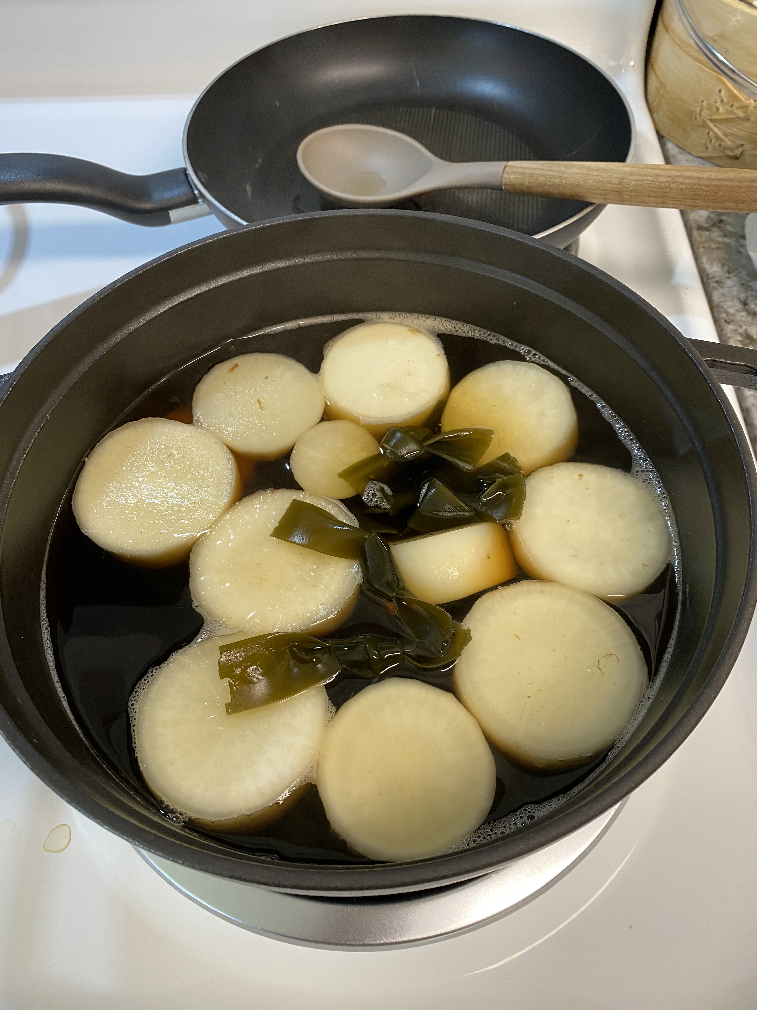 把白蘿蔔去皮切塊放入鍋中煮到半透明,雞蛋也可以一起放入鍋中煮,竹輪斜切、剛剛取出的昆布切成2cm左右寬,打成結變成海帶結備用。