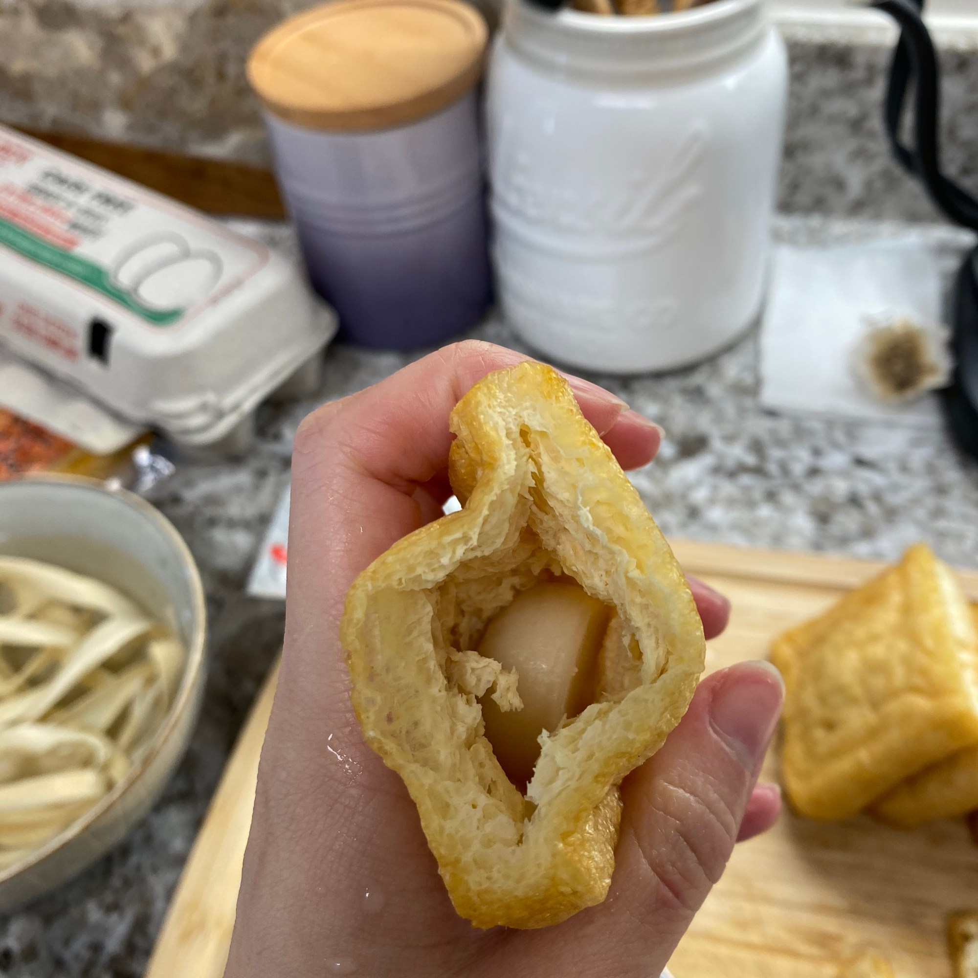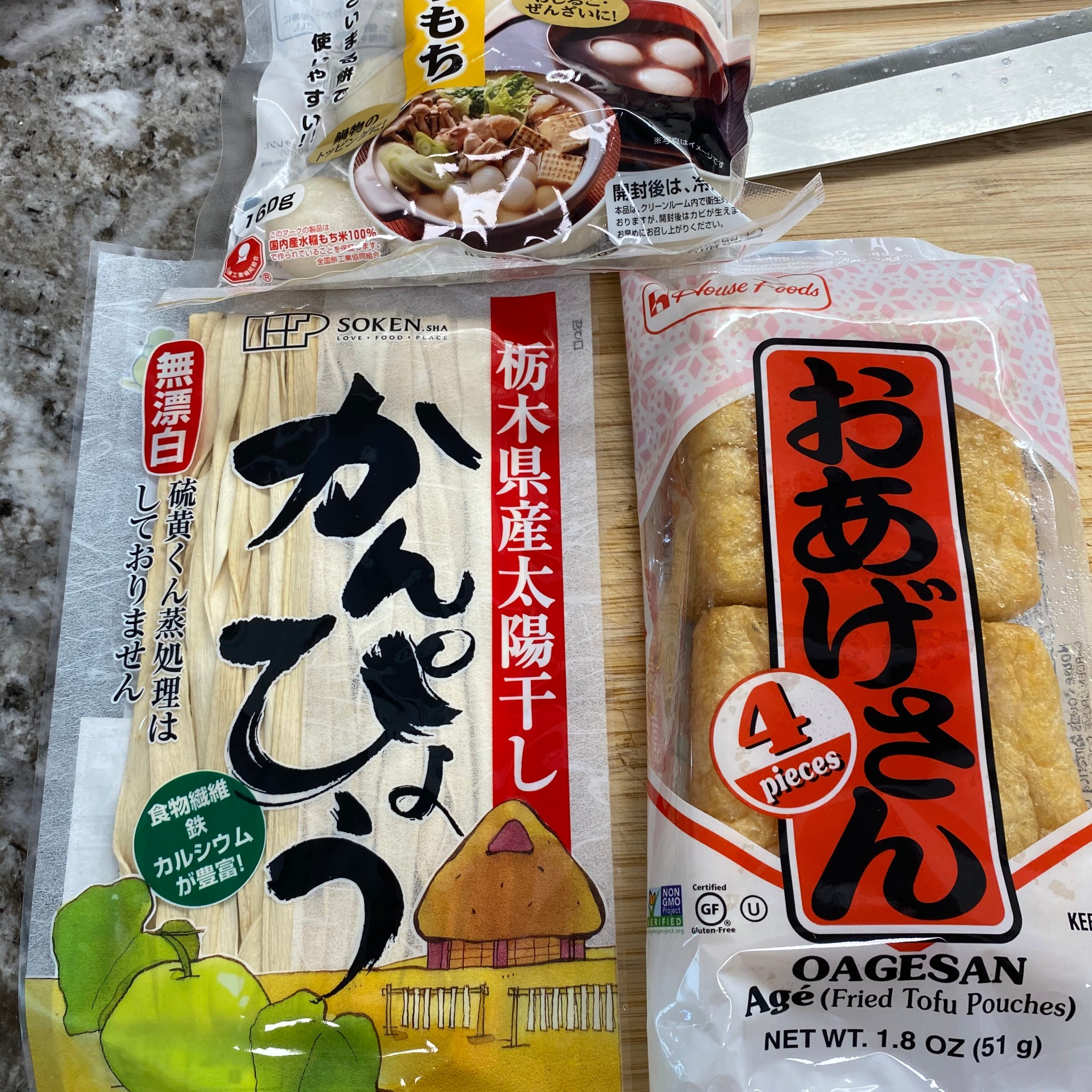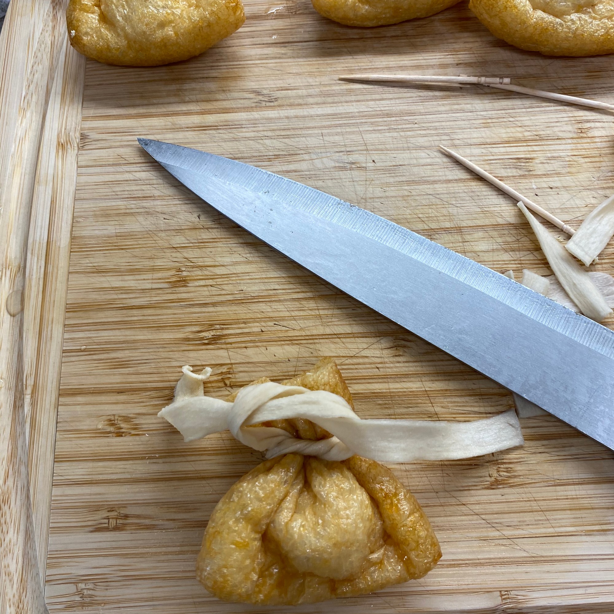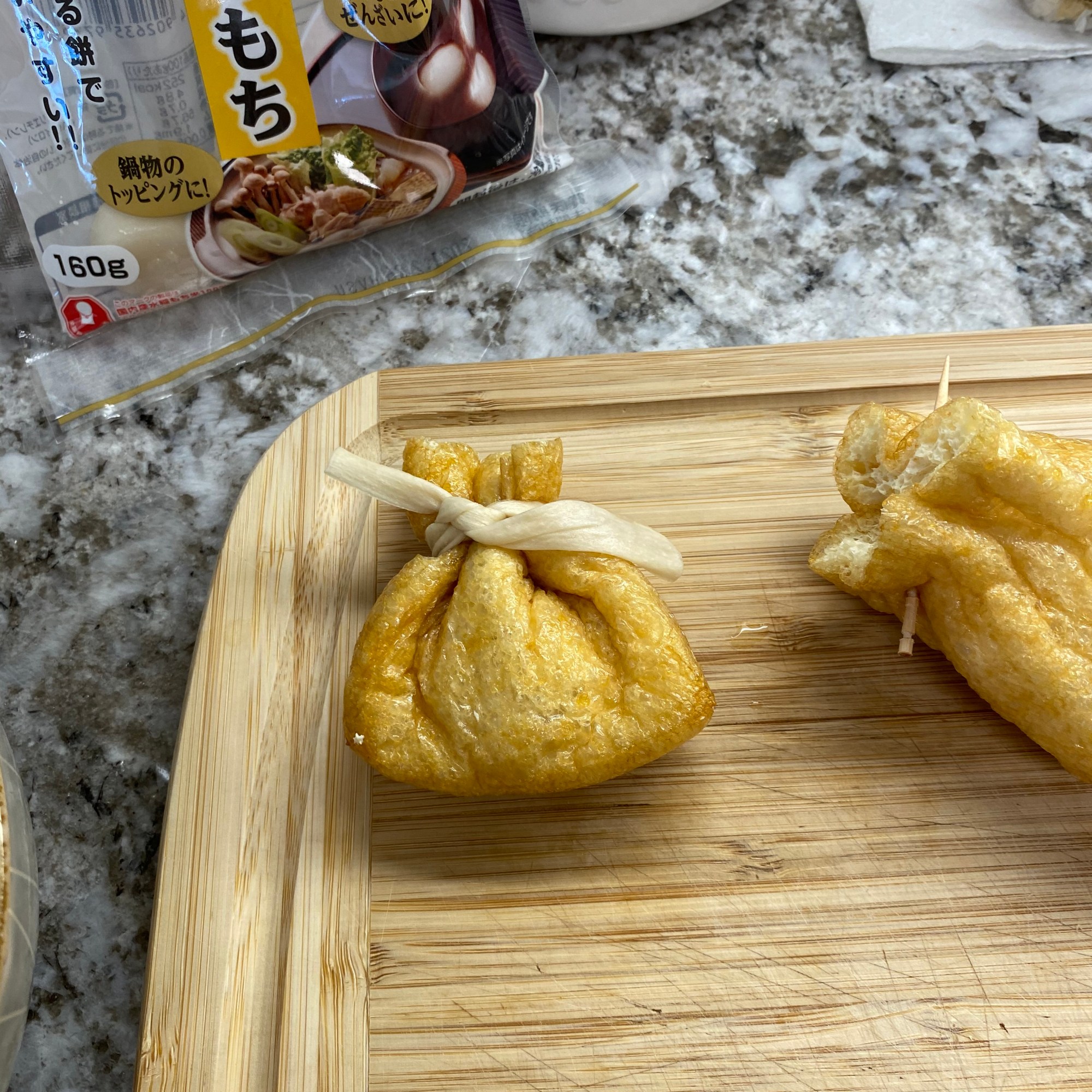 把干瓢條用水泡軟備用,將油豆腐泡上方切開一個口,並用手指輕輕撕開油包(要盡量輕,不然容易破掉),塞入一顆小麻糬,用干瓢條將油豆腐泡捆起來打個結,干瓢條滿耐拉扯,可以捆緊一點沒問題!這樣可愛的小福袋就完成了!