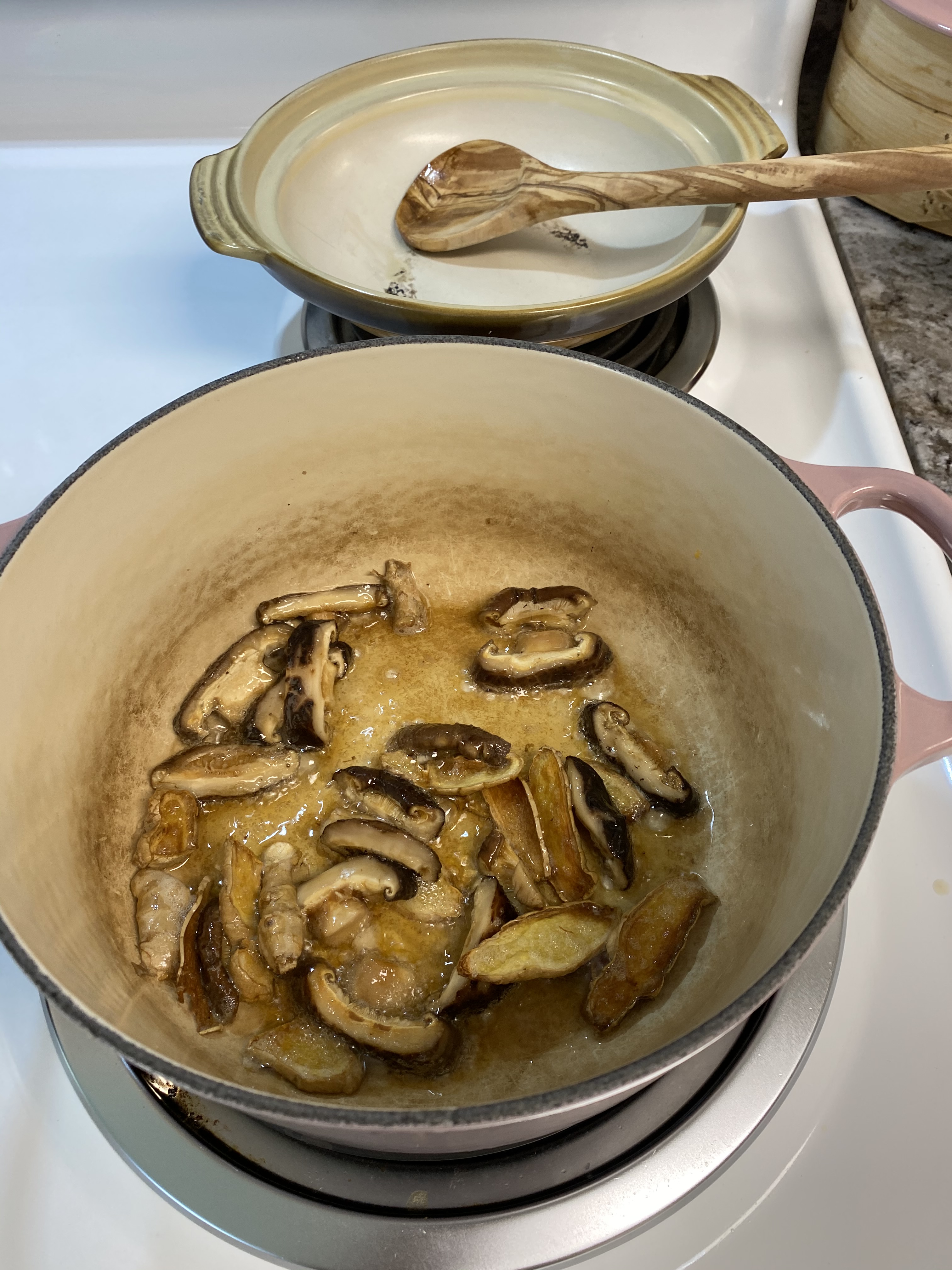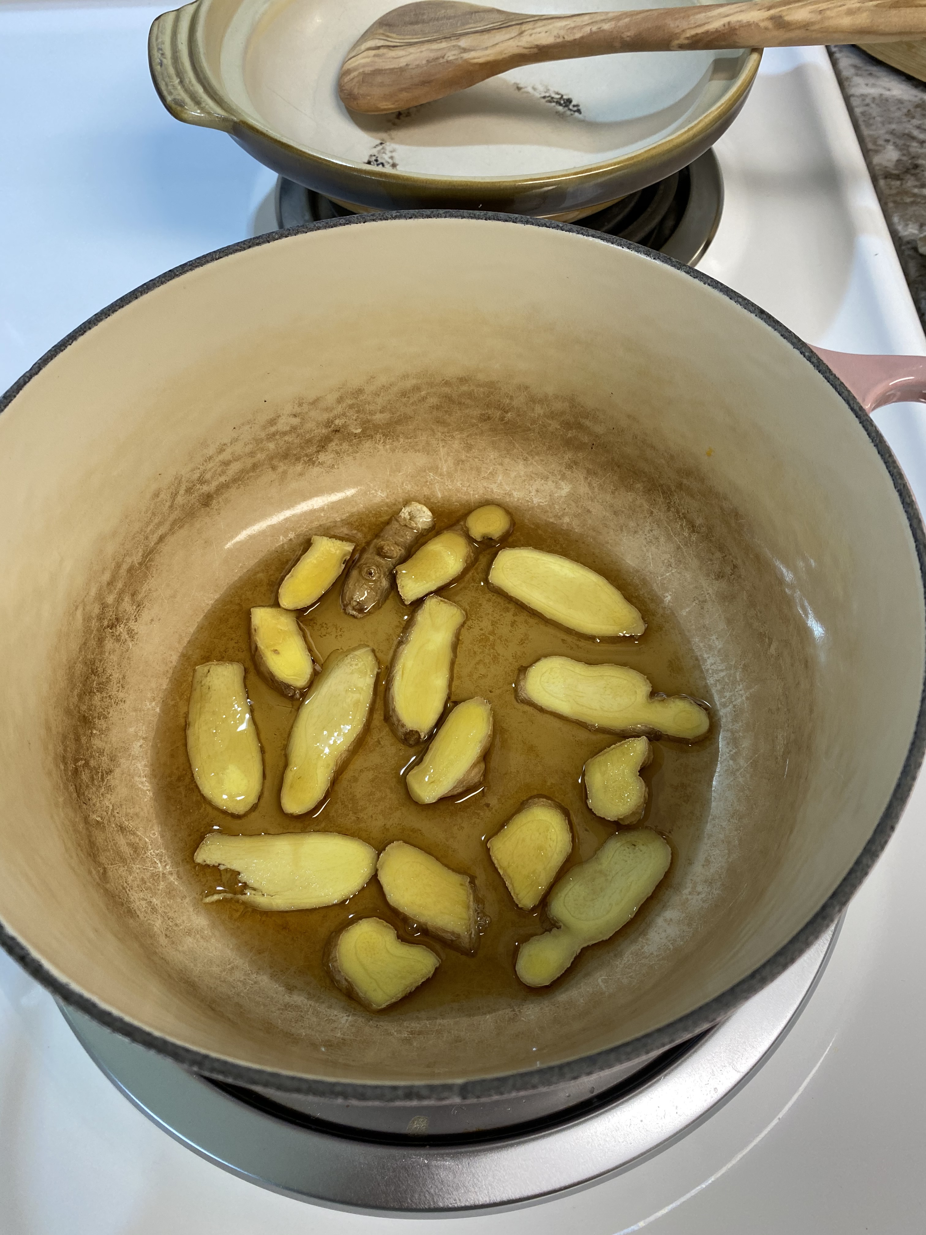 把材料備齊,把乾香菇用水先泡軟等等切絲、雞肉去骨、薑切片,鑄鐵鍋開中火倒入麻油和薑片開始煎,煎至薑片蜷曲狀。
